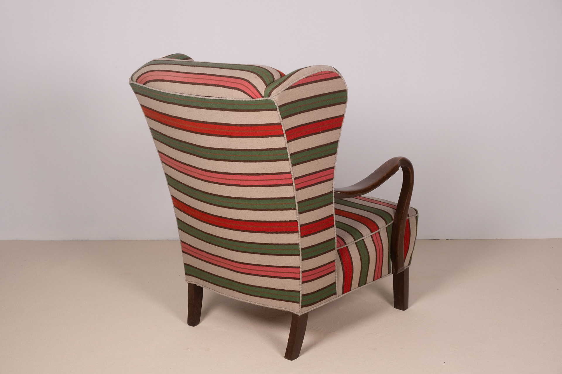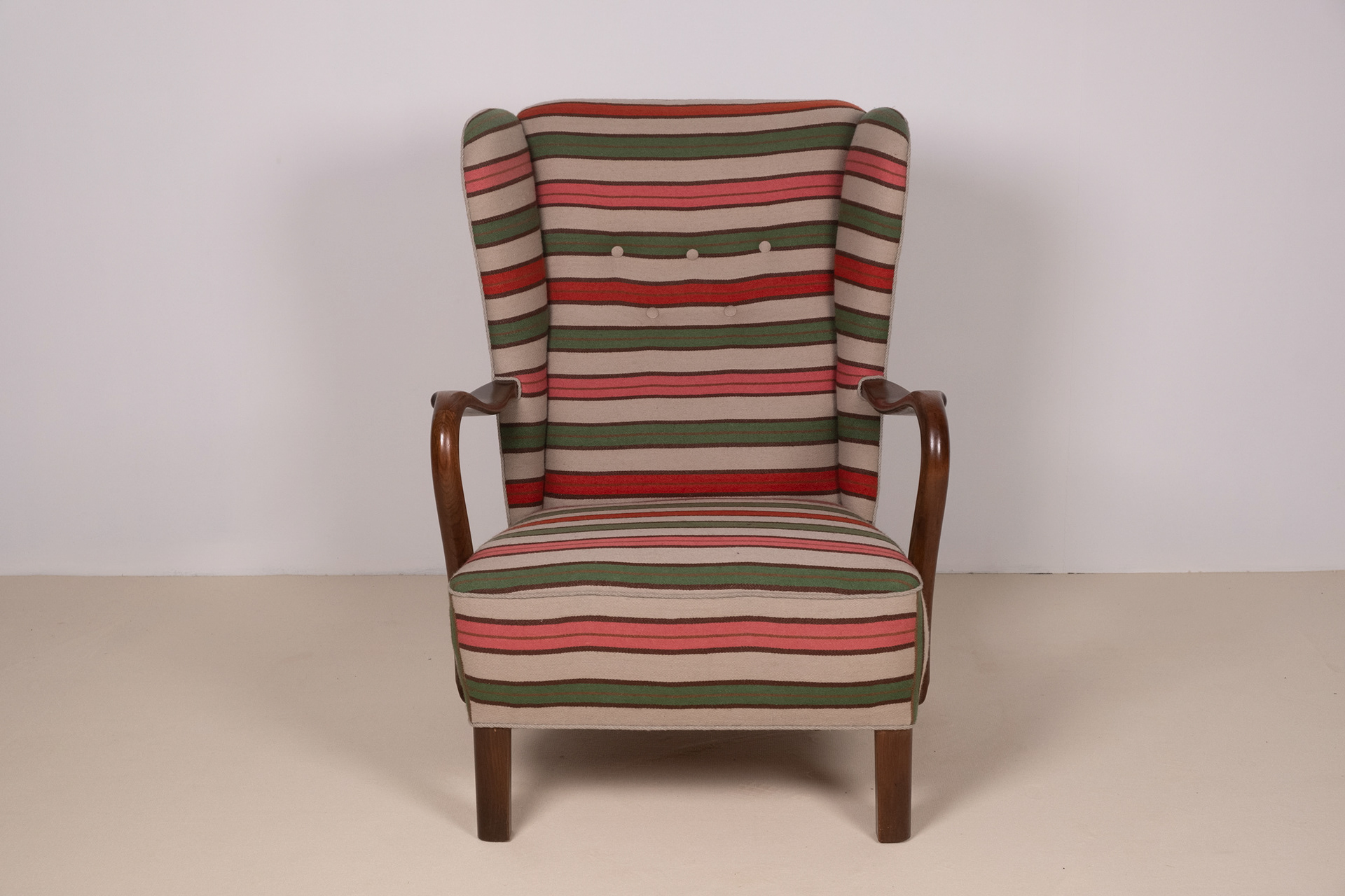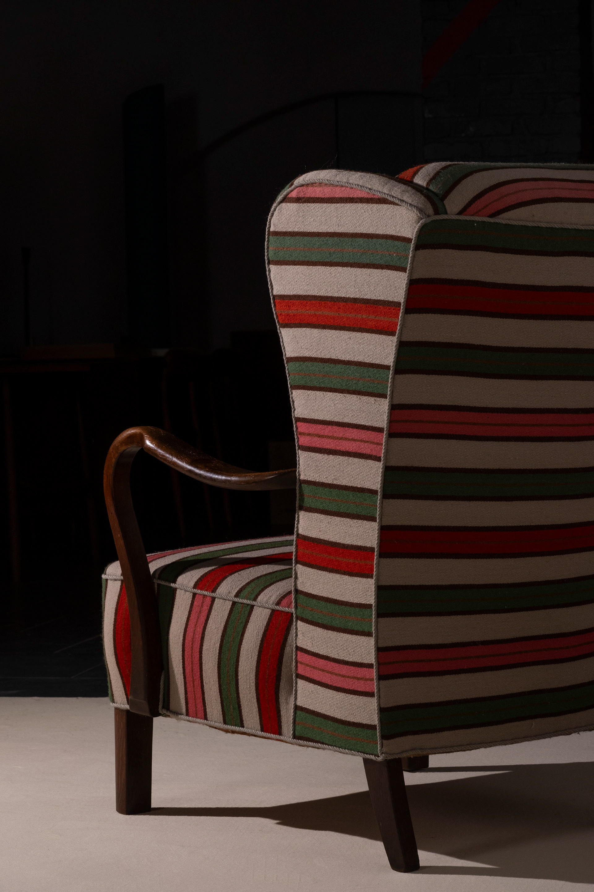 Wonderful wingback chair made by a Danish furniture maker in the 1940s. The framework is made from oak and is upholstered in a beautifully woven striped textile, in very good original condition.