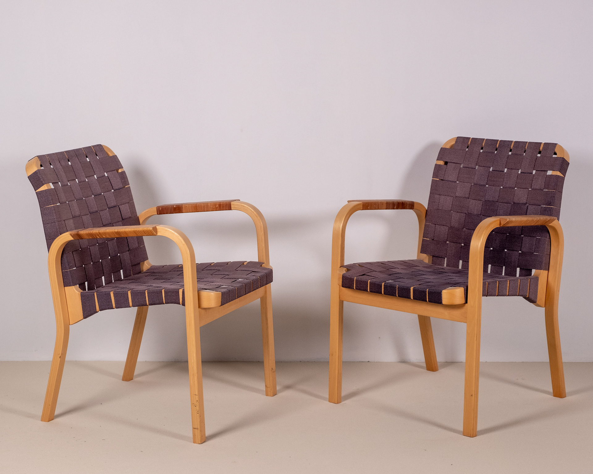 A pair of vintage Alvar Aalto armchairs, Model 45, designed in 1947, produced in the 1970s by Artek in Finland. The chairs are in great condition with patinated wicker on the arms and original flax linen webbing. HxWxDxSH: 80x61x49x43cm