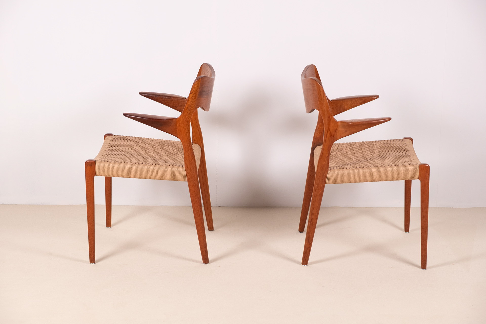 A pair of vintage Niels O. Møller Model 55 armchairs teak with Møller’s signature sculptural elegance. Designed in 1951, Model 55 was among the early works that established Møller’s reputation for organic forms, meticulous joinery, and enduring comfort. The chairs showcase Møller's mastery of Danish modern design, balancing clean lines with subtle curves and fine hand craftsmanship. The combination of the teak frames and woven paper cord seats embody the mid-century Scandinavian tradition that valued both function and craftmanship. Timeless in design, they remain highly sought after by collectors and admirers of Danish modern furniture. They are in good vintage condition with normal signs of use for their age. The seats are renewed with Danish papercord. Stamped by J.L. Møllers Møbelfabrik and Danish Control.