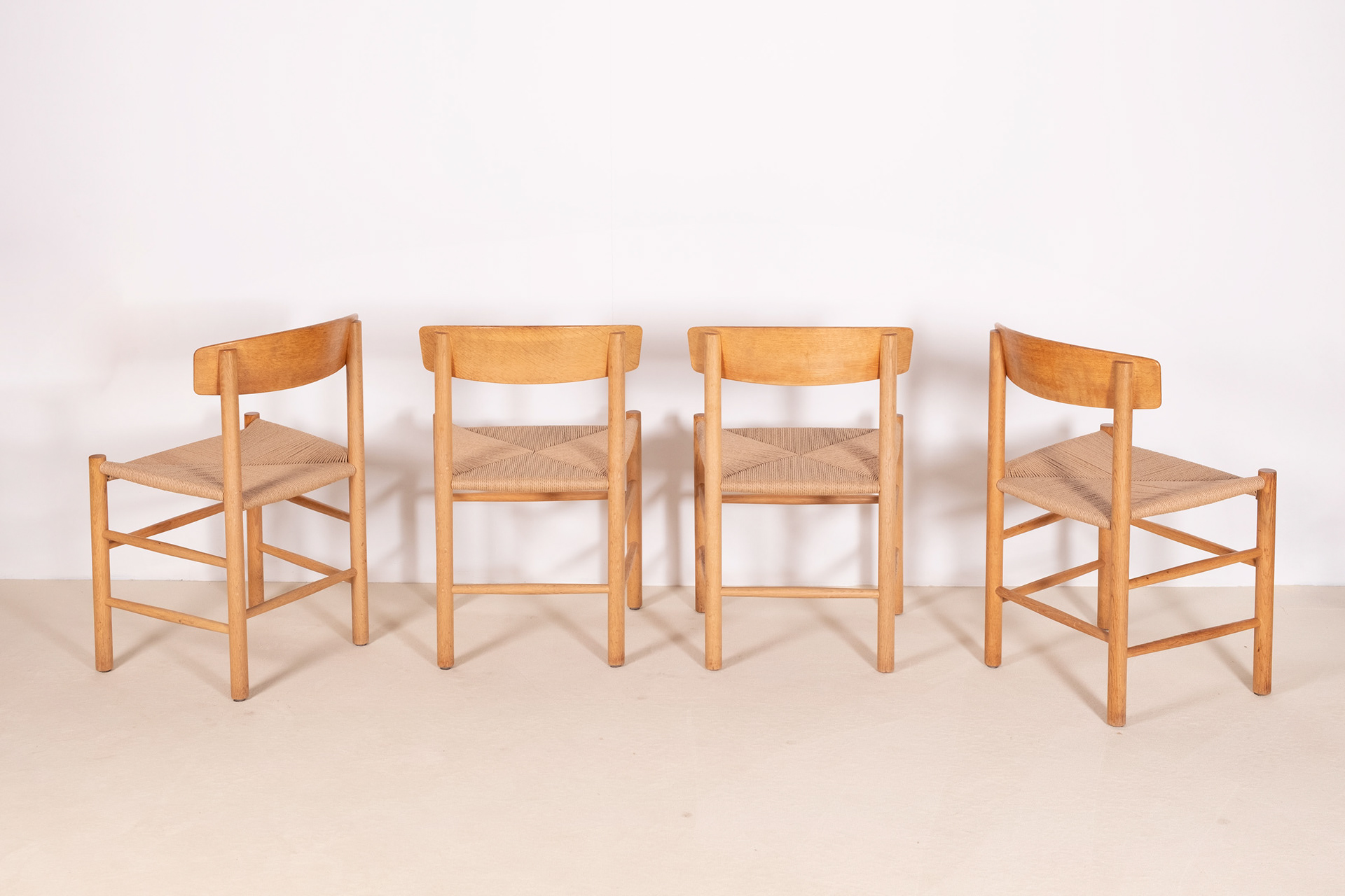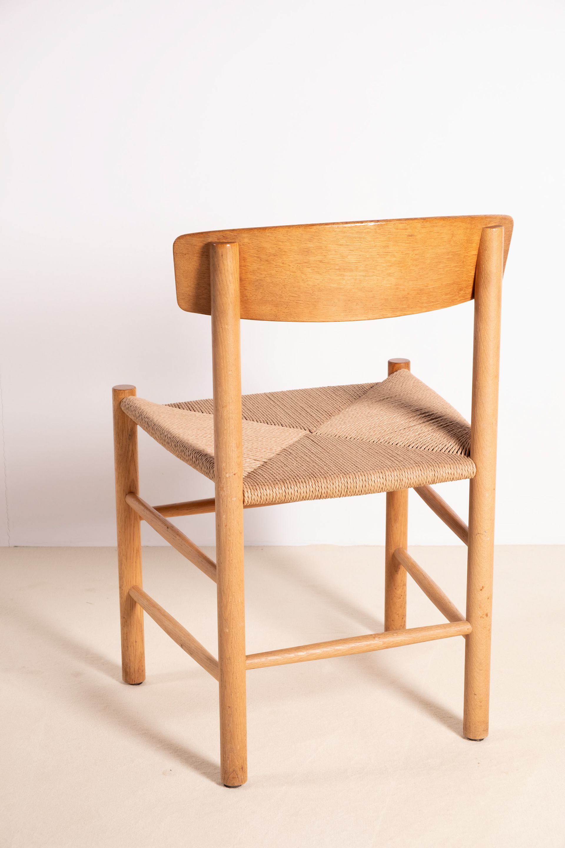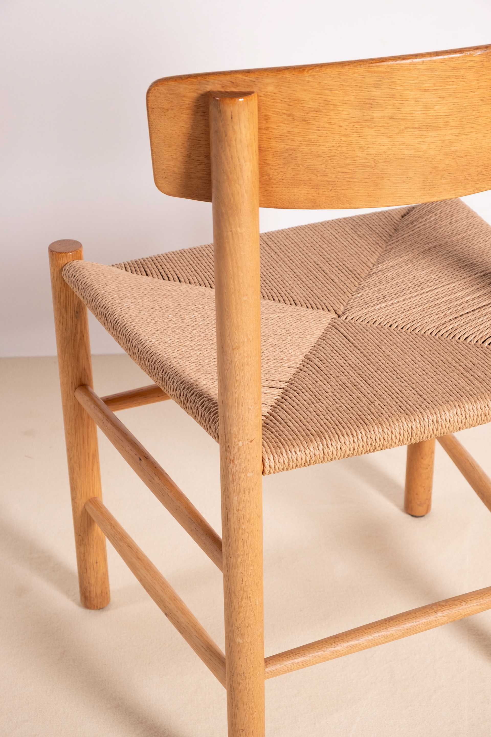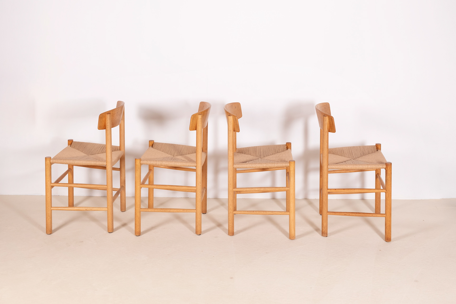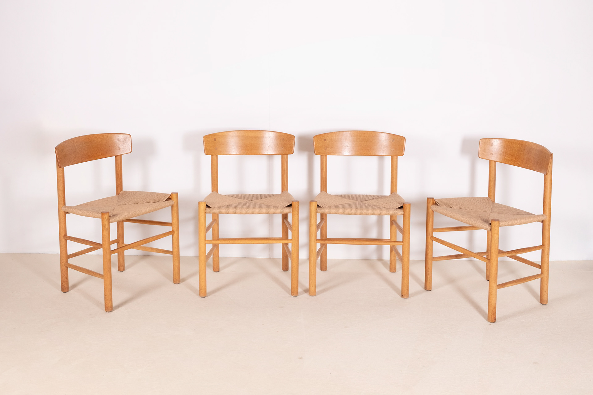 Set of four J39 Dining Chairs by Børge Mogensen. Designed in 1947 by Børge Mogensen for FDB Møbler, Denmark. This set was produced in 1981 and is crafted in solid oak with papercord seats. The iconic J39, also known as the “People’s Chair,” exemplifies Mogensen’s dedication to functional craftsmanship and honest materials—combining Shaker-inspired simplicity with timeless Danish modern design. The chairs are in good vintage condition with light traces of use in accordance with the age of the chairs. All chairs have been freshly rewoven in our own workshop.
