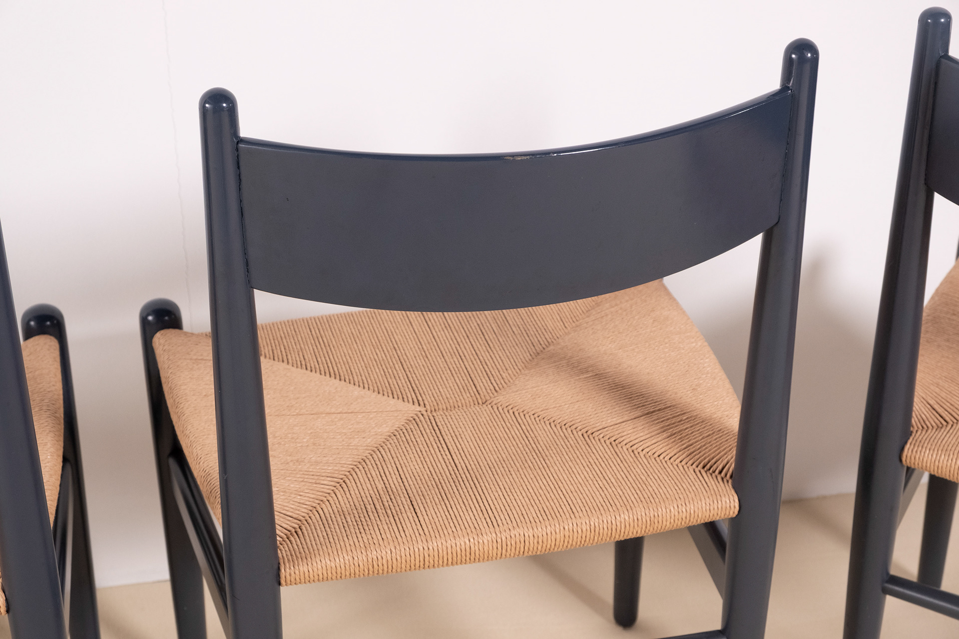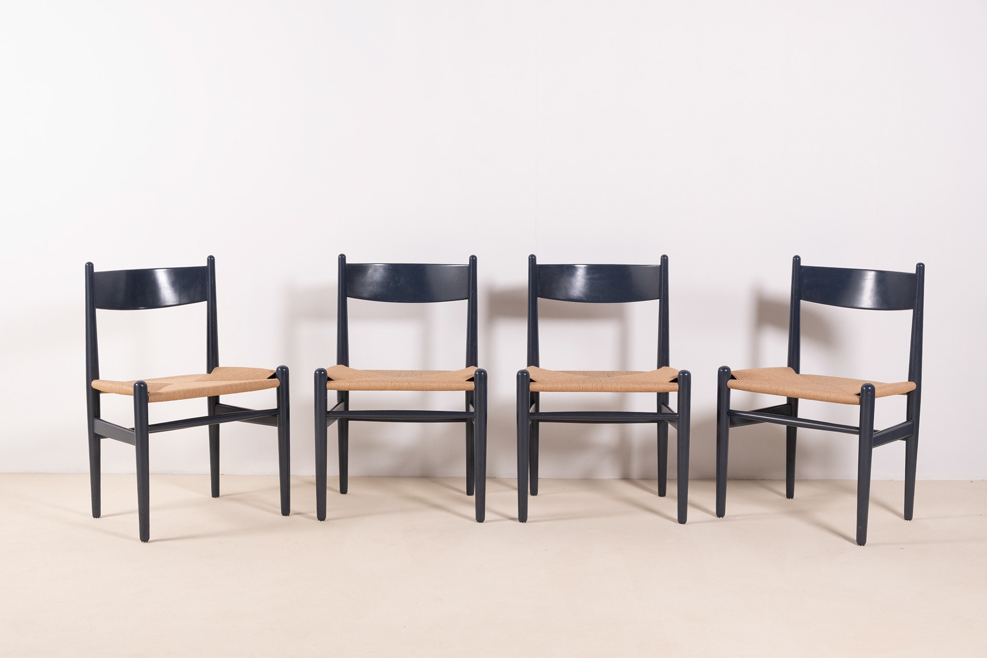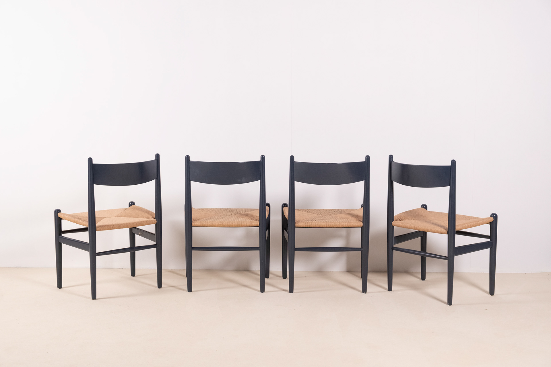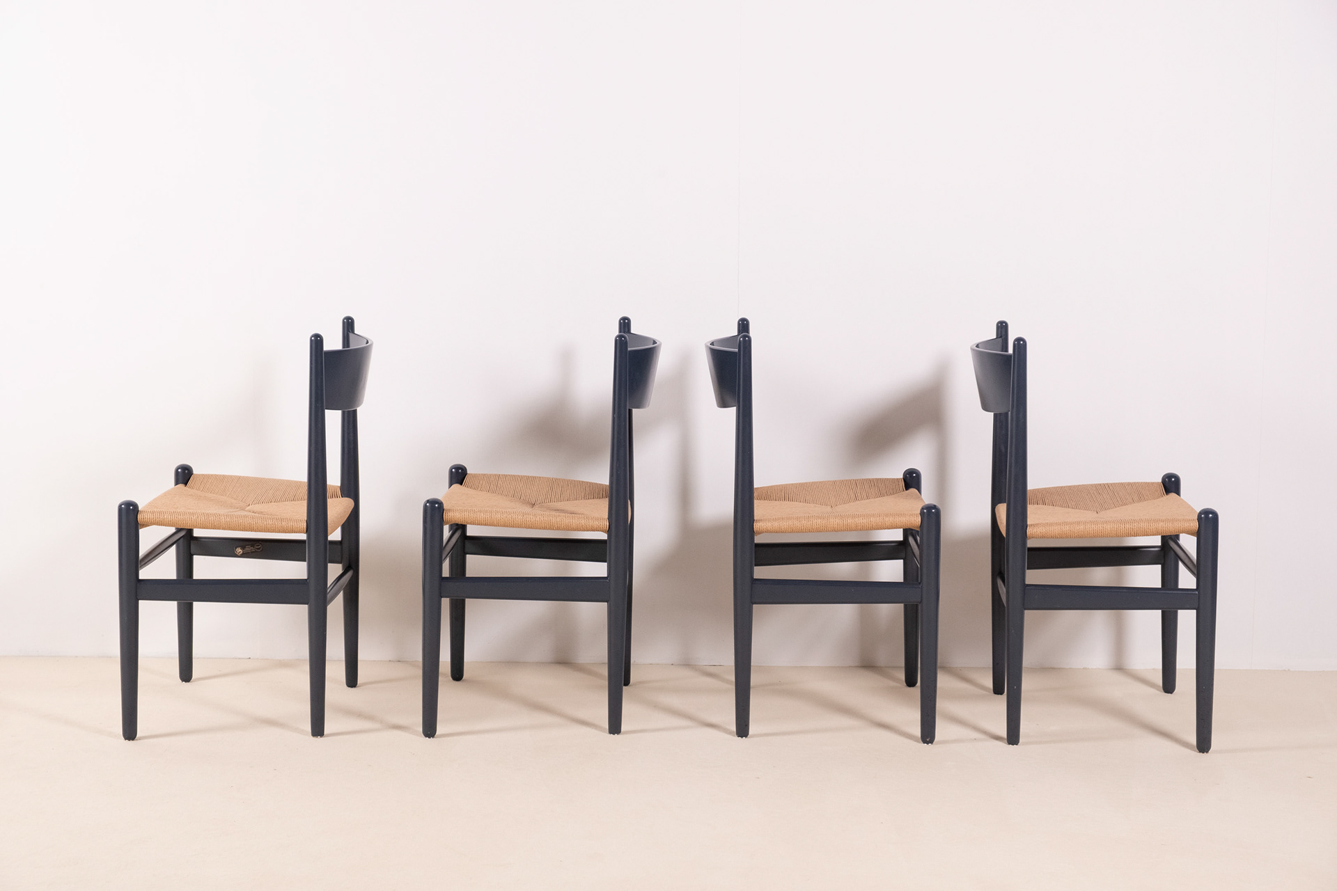 Set of four dining chairs, model CH36 by Hans J. Wegner, crafted from solid beech and finished in a soft blue lacquer, lending a contemporary freshness to the timeless silhouette of the CH36. Designed in 1962 by Hans J. Wegner, the CH36 is a study in simplicity, comfort and craftsmanship inspired by Shaker furniture. The chairs show normal signs of use for their age, one backside of a backrest shows a little bit more rubbing as shown in one of the photographs. All seats have been rewoven in Danish papercord. Two chairs still have the label from Carl Hansen & Søn.