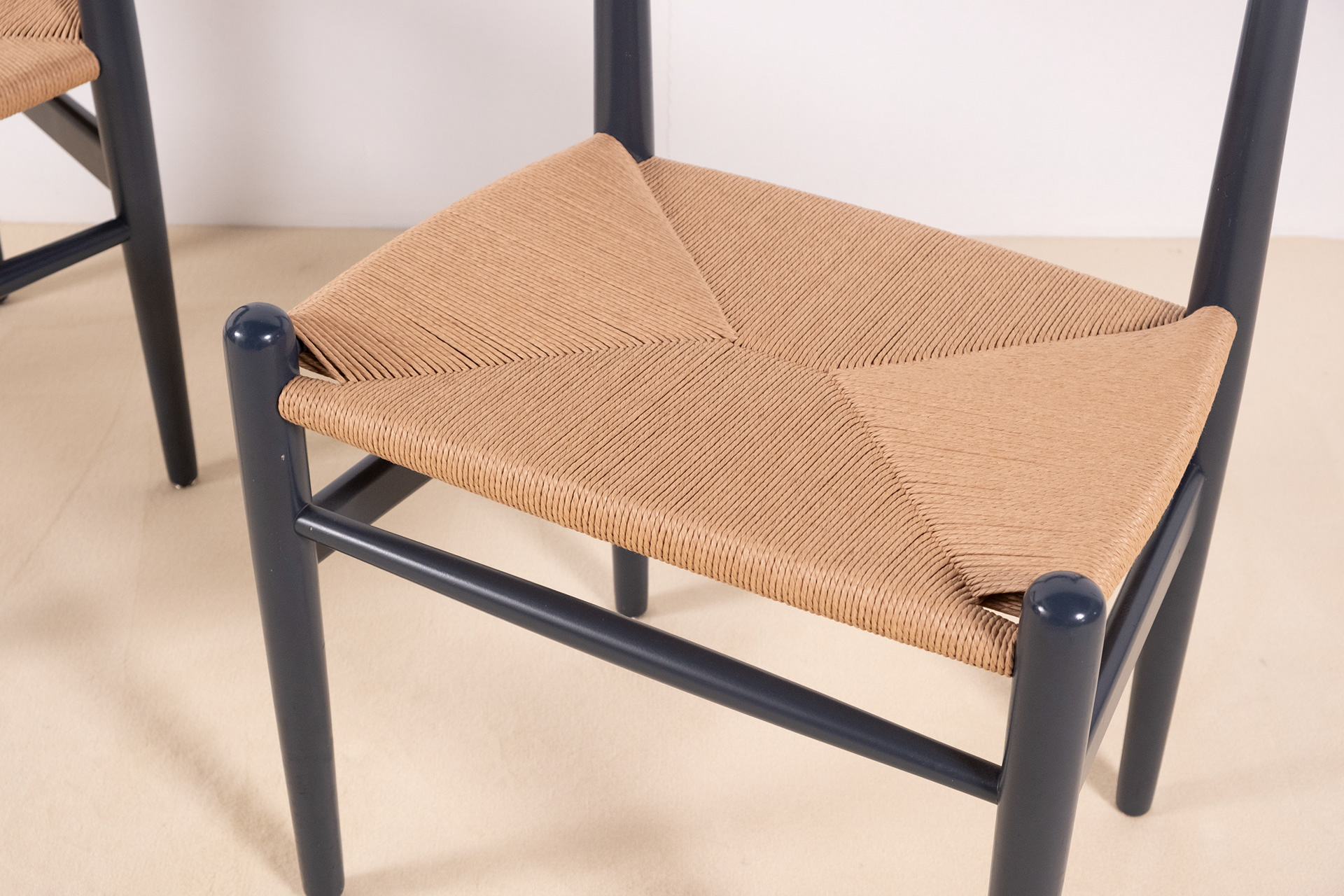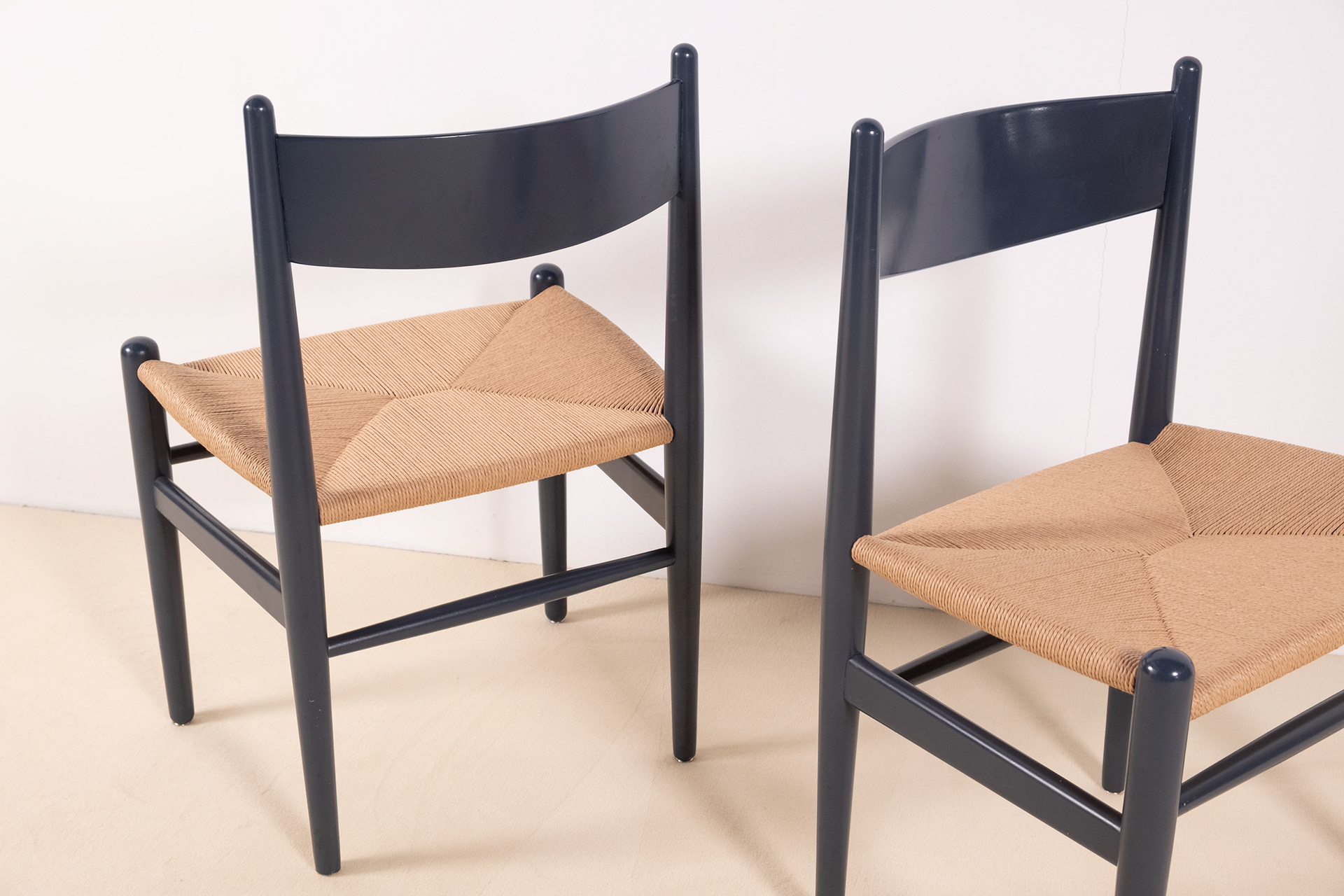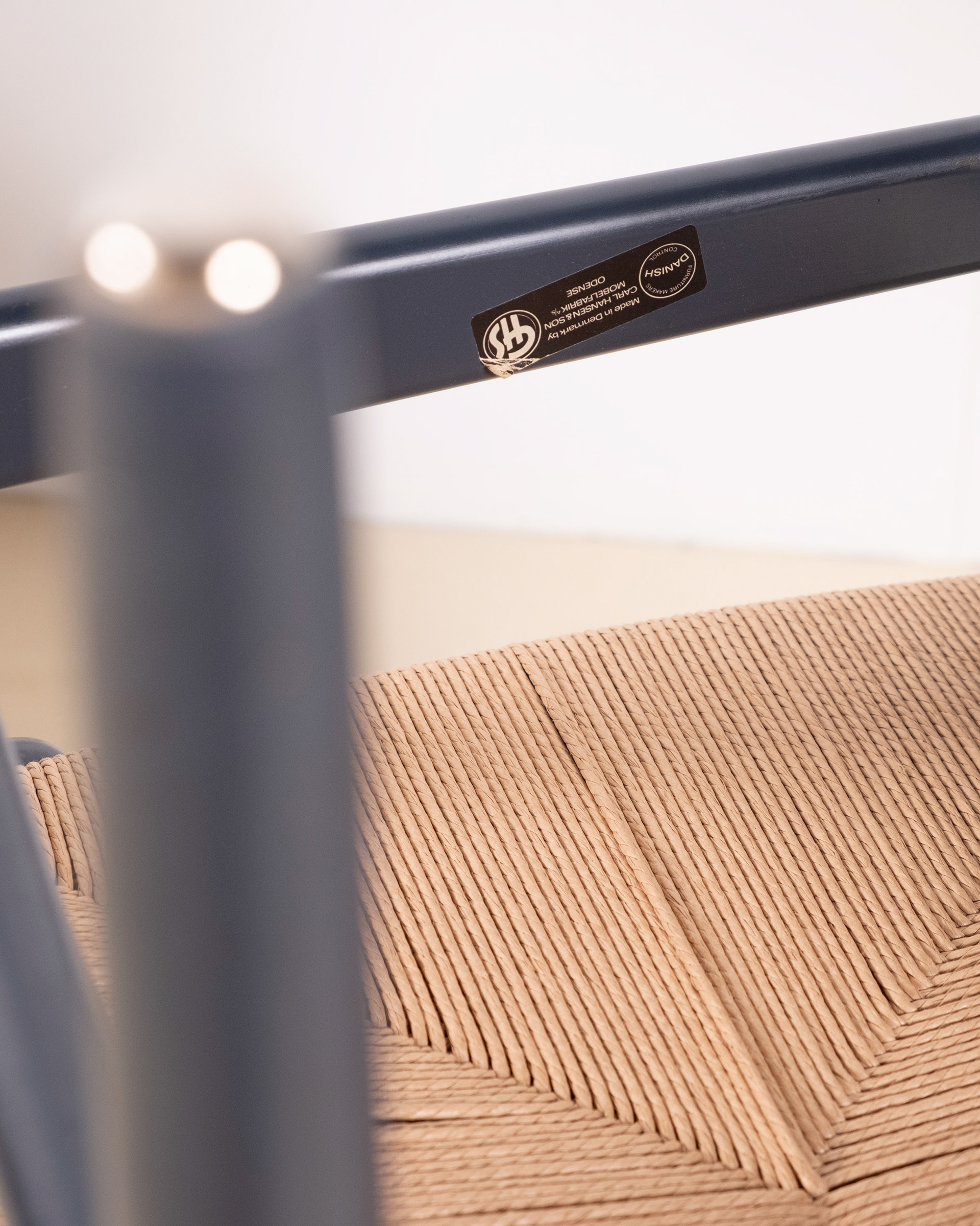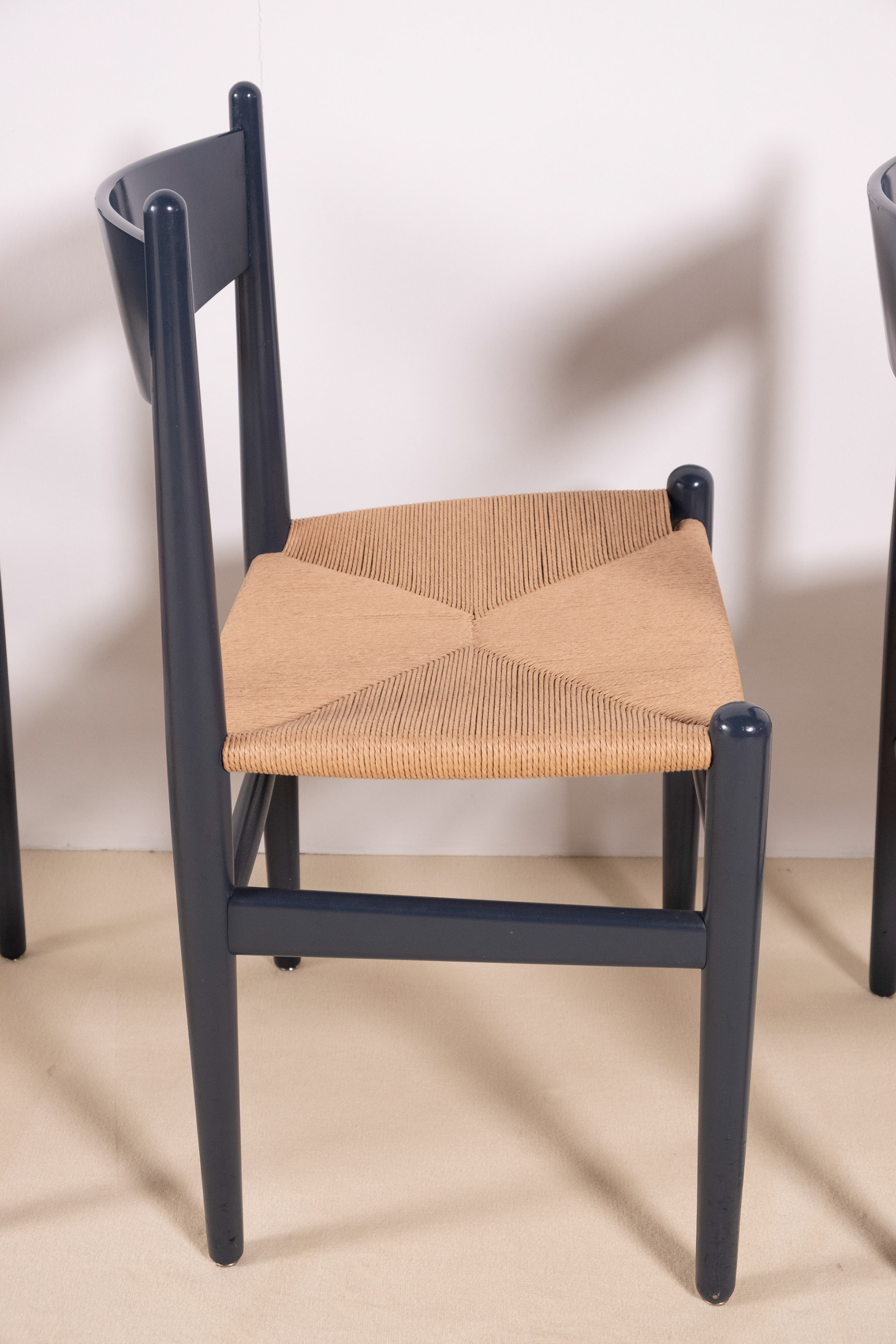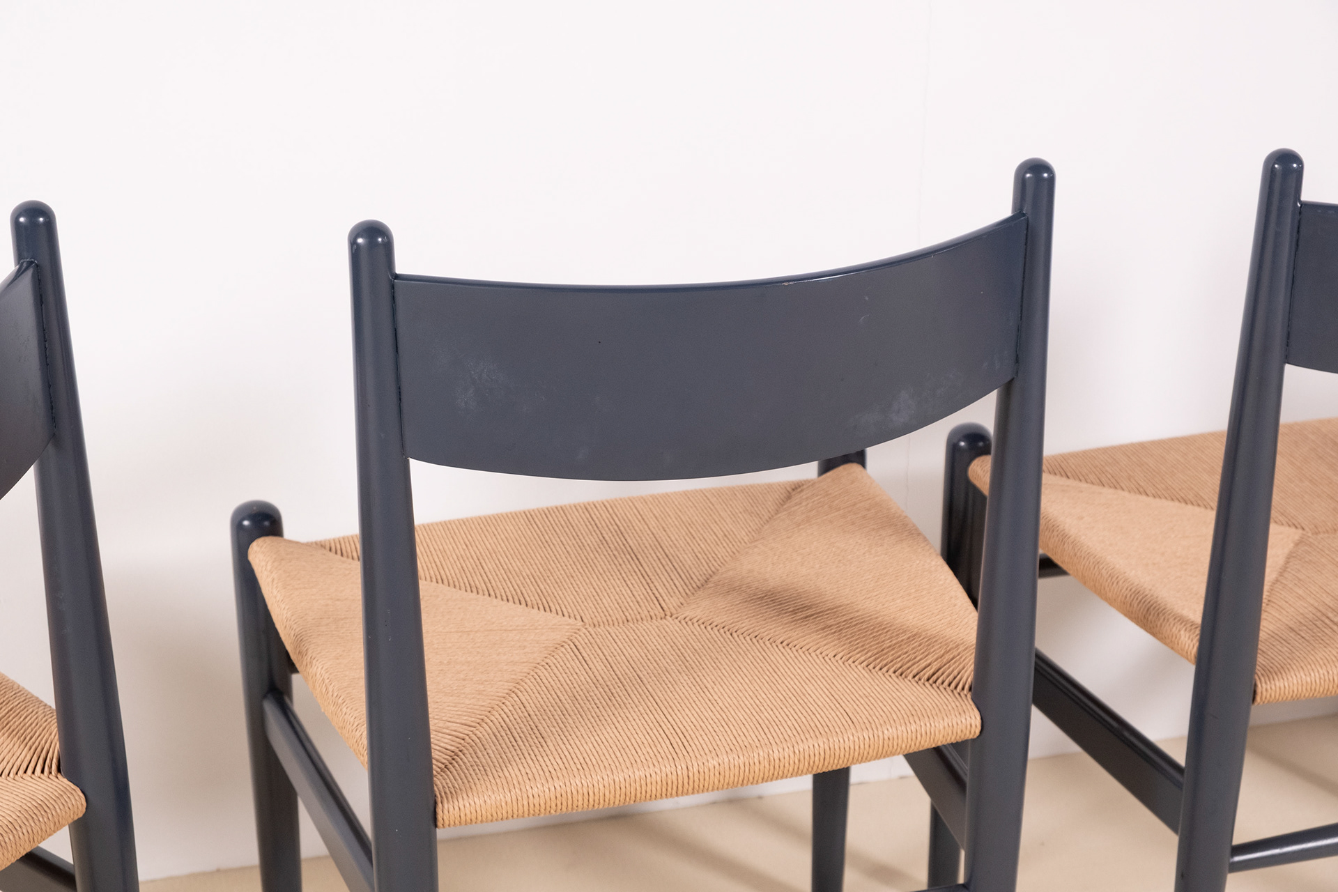 Set of four dining chairs, model CH36 by Hans J. Wegner, crafted from solid beech and finished in a soft blue lacquer, lending a contemporary freshness to the timeless silhouette of the CH36. Designed in 1962 by Hans J. Wegner, the CH36 is a study in simplicity, comfort and craftsmanship inspired by Shaker furniture. The chairs show normal signs of use for their age, one backside of a backrest shows a little bit more rubbing as shown in one of the photographs. All seats have been rewoven in Danish papercord. Two chairs still have the label from Carl Hansen & Søn.