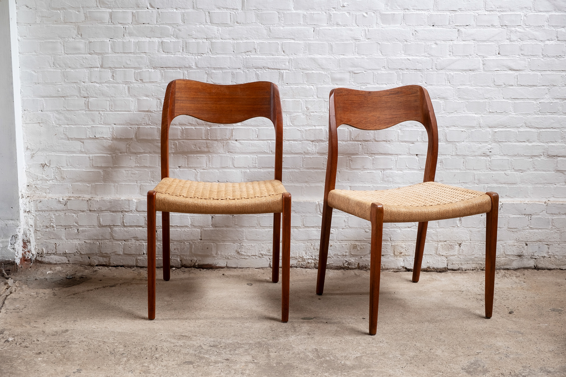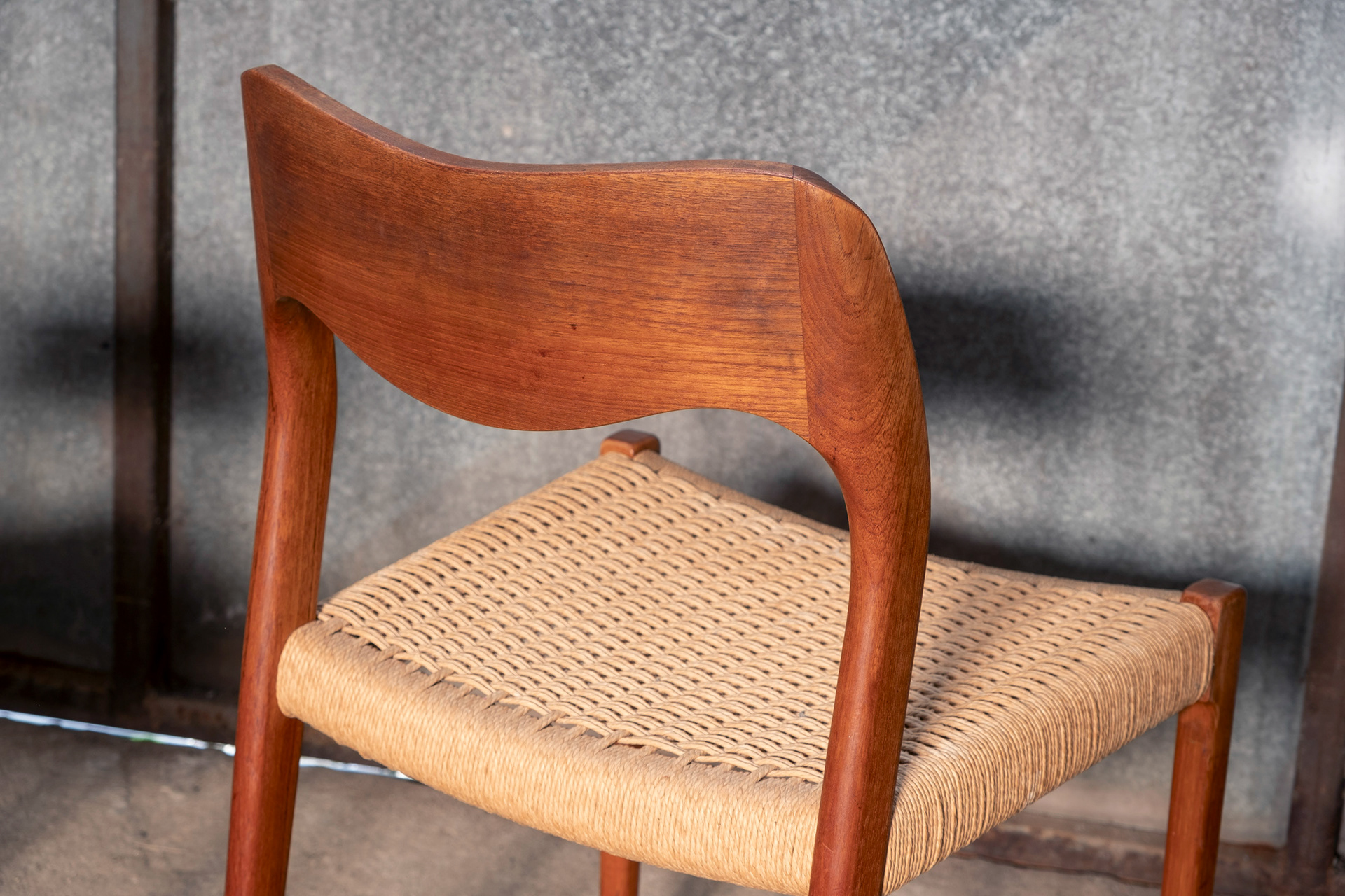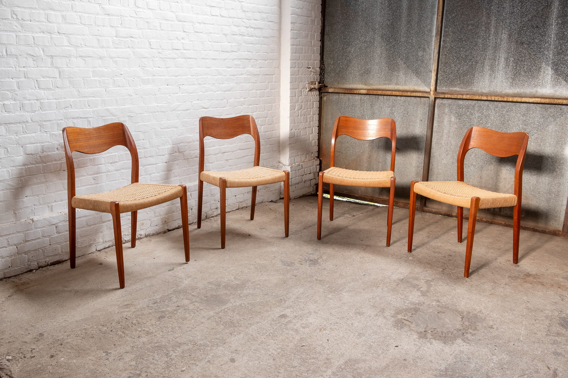 Lovely set of 4 Niels Møller chairs, Model 71 in teak. The chairs were designed in 1951 and produced in the 1960s in Aarhus, Denmark, at JL Møllers Møbelfabrik. All chairs have a stamped makers mark and Danish Control stamp.