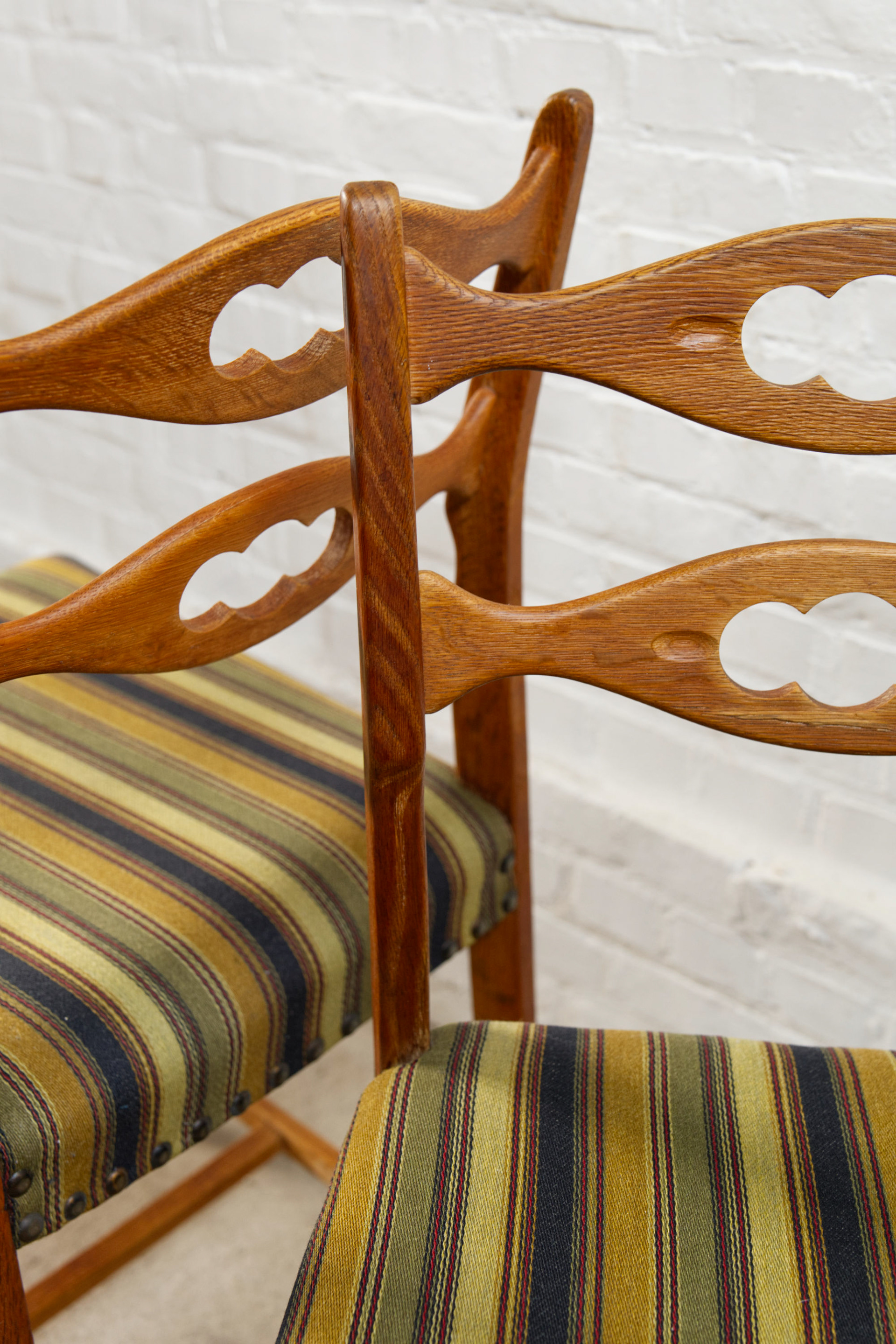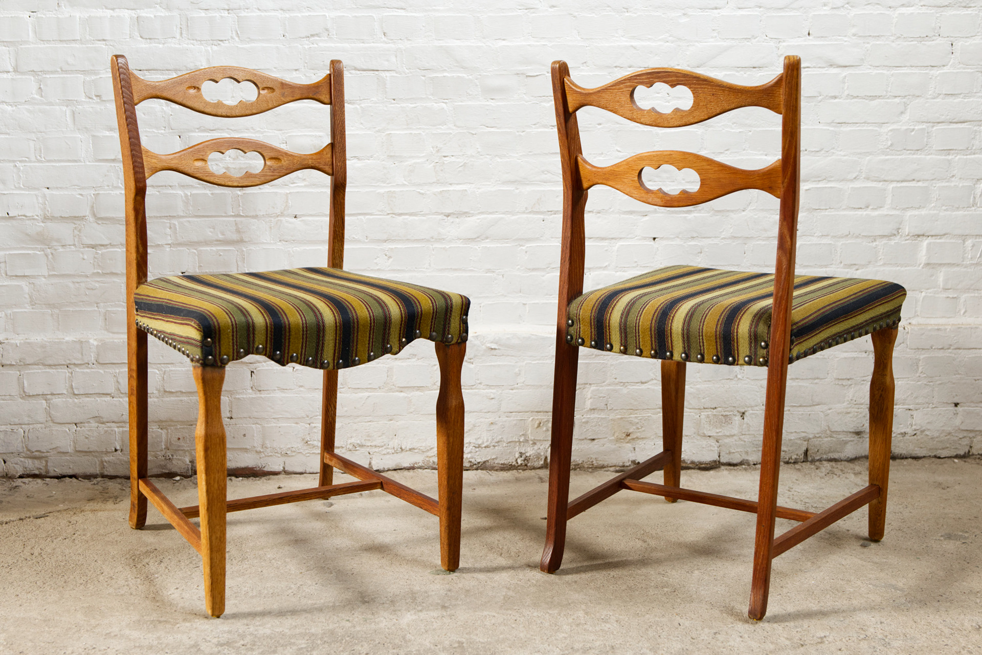 A set of four quarter-sawn oak dining chairs by Henning Kjaernulf. They still have their original wool upholstery in traditional Danish Olmerdug fabric. Amazing wood selection and grain details. The chairs were designed in the 1960s and are ascribed to Henning Kjaernulf, Denmark. This model is lesser known compared to other models from Kjaernulf. However it combines the perfect mix of traditional materials and decorative style in a modern and elegant shape in my opinion. A much lighter and elegant design.
