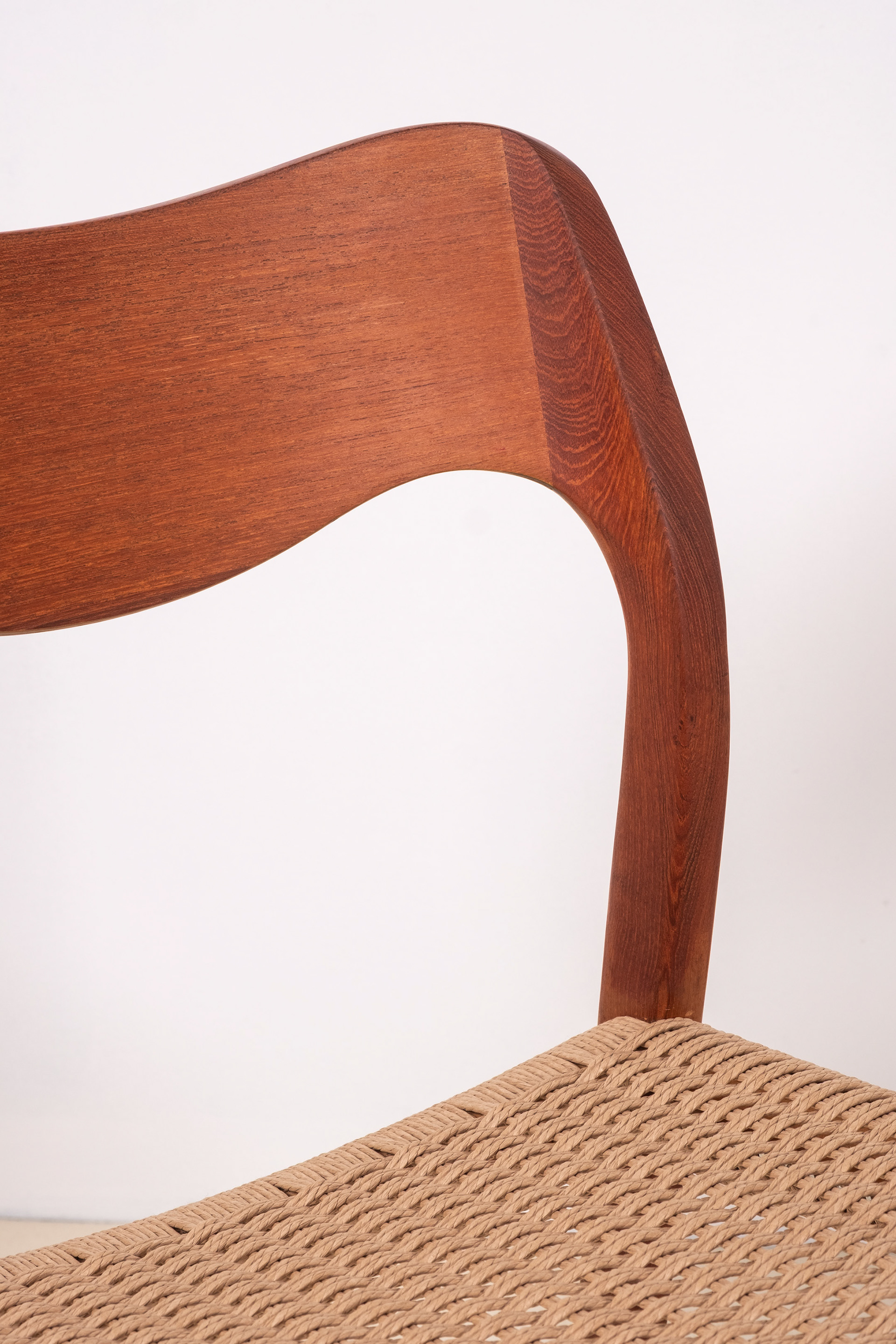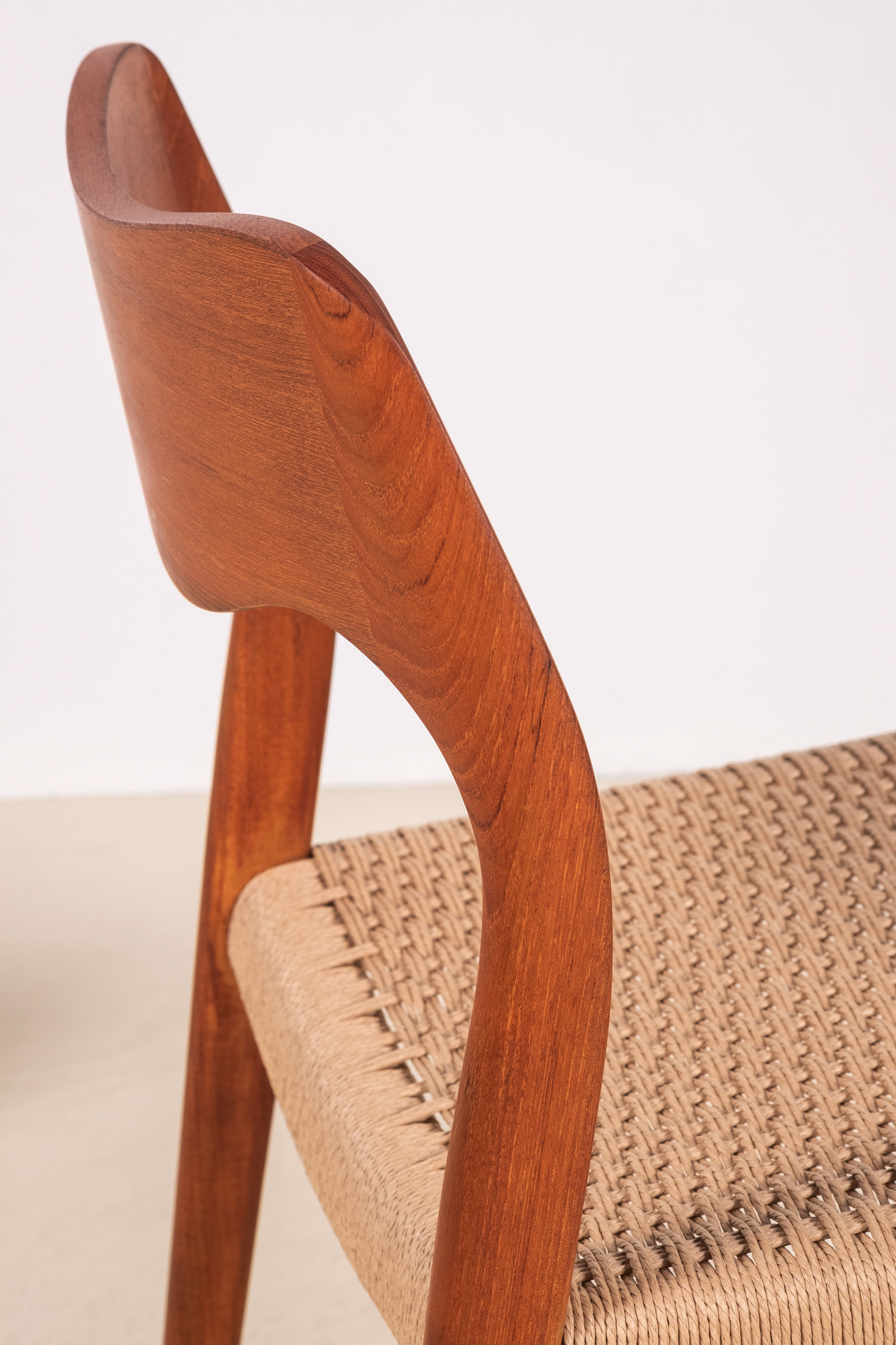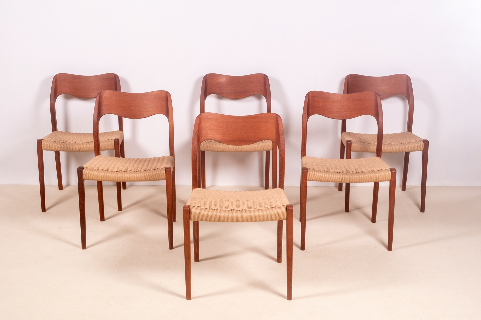 Beautiful set of 6 Niels Møller chairs, Model 71 in teak. The chairs were designed in 1951 and produced in the 1960s in Aarhus, Denmark, at JL Møllers Møbelfabrik. All chairs have a stamped makers mark and Danish Control stamp.