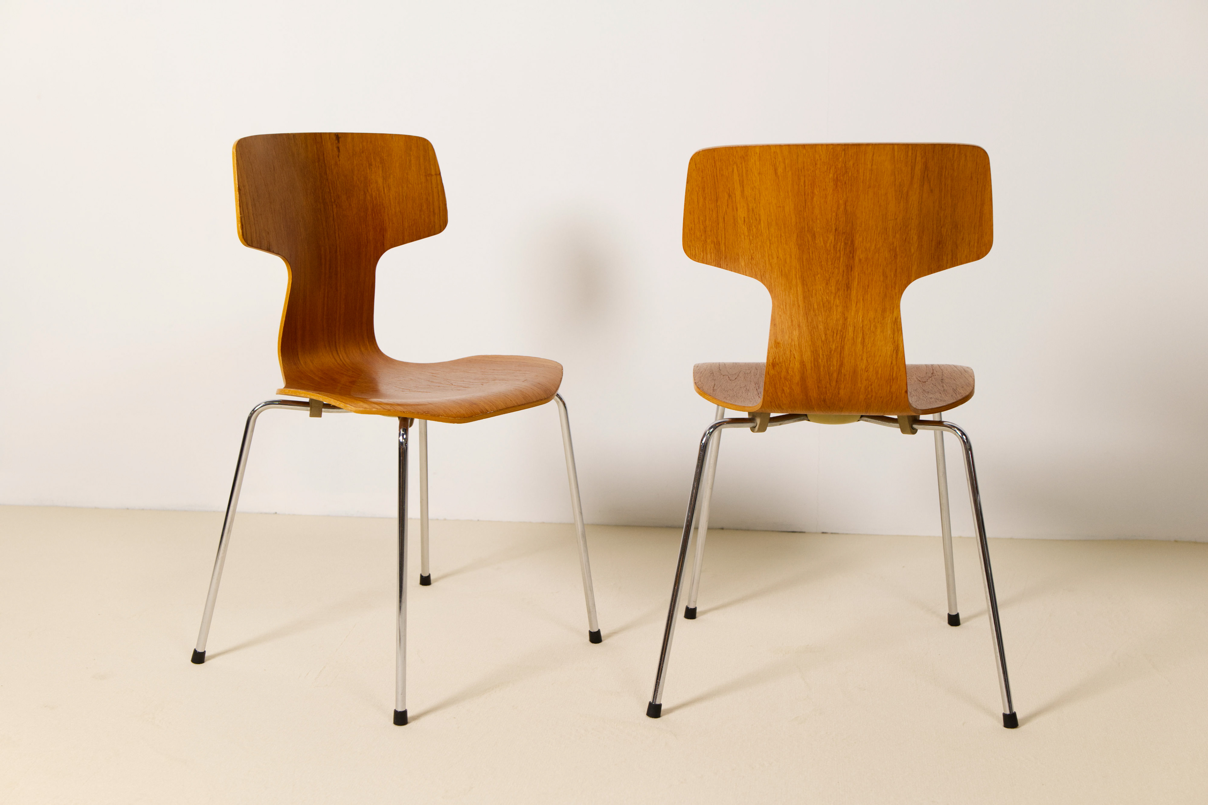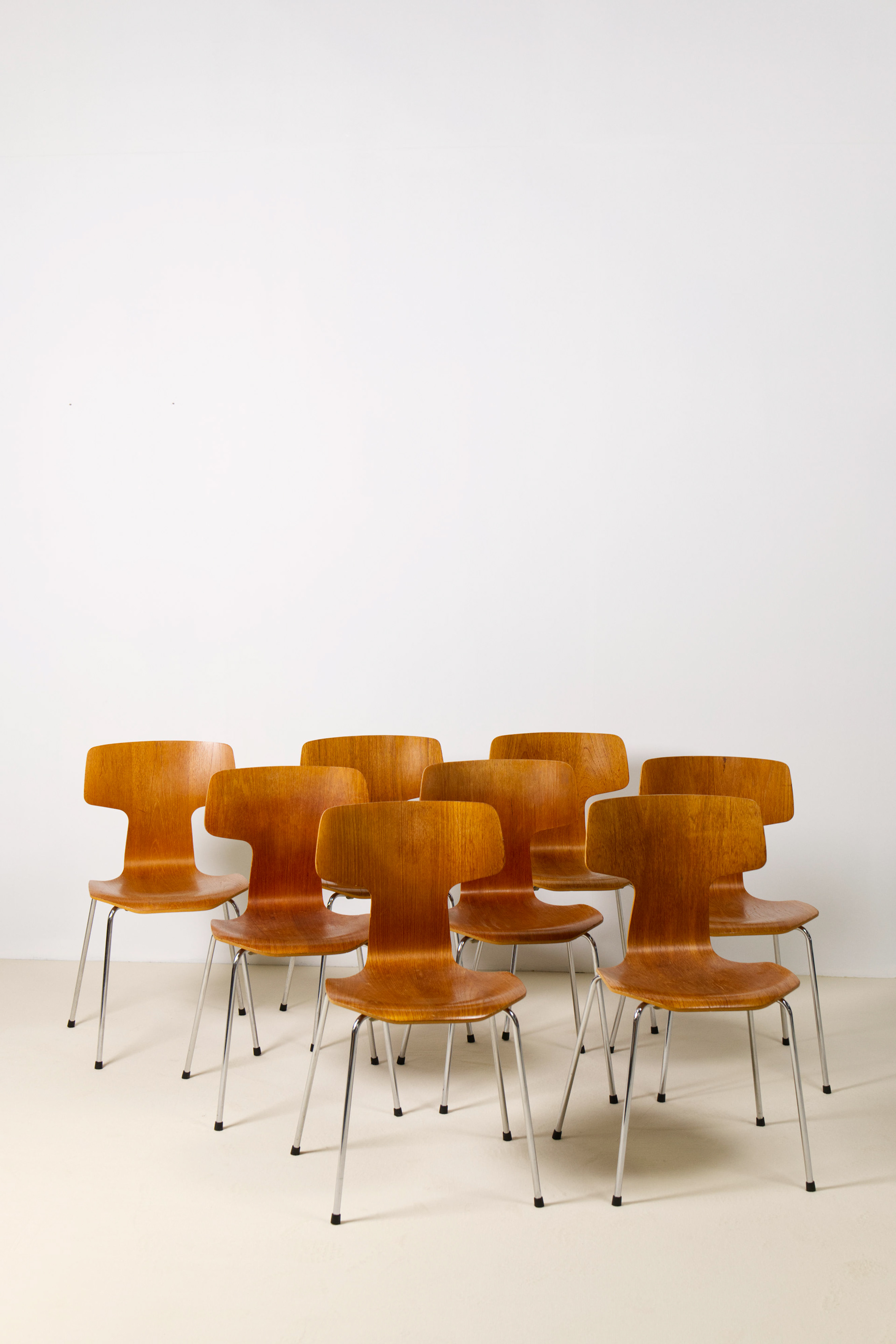 Set of 8 "T Chairs" 3103 designed by Arne Jacobsen in 1955. These chairs feature molded teak plywood shells with the distinctive T-shaped backrest — a simple, elegant form typical of Jacobsen’s functionalist design. The seats are mounted on slender, chrome-plated tubular steel legs. This set, a mix of different production years all in the early 80s, maintains the same high-quality materials and craftsmanship. All chairs are in good vintage condition, with minor wear consistent with age. Practical, stackable, and well-suited for dining, office, or conference use.