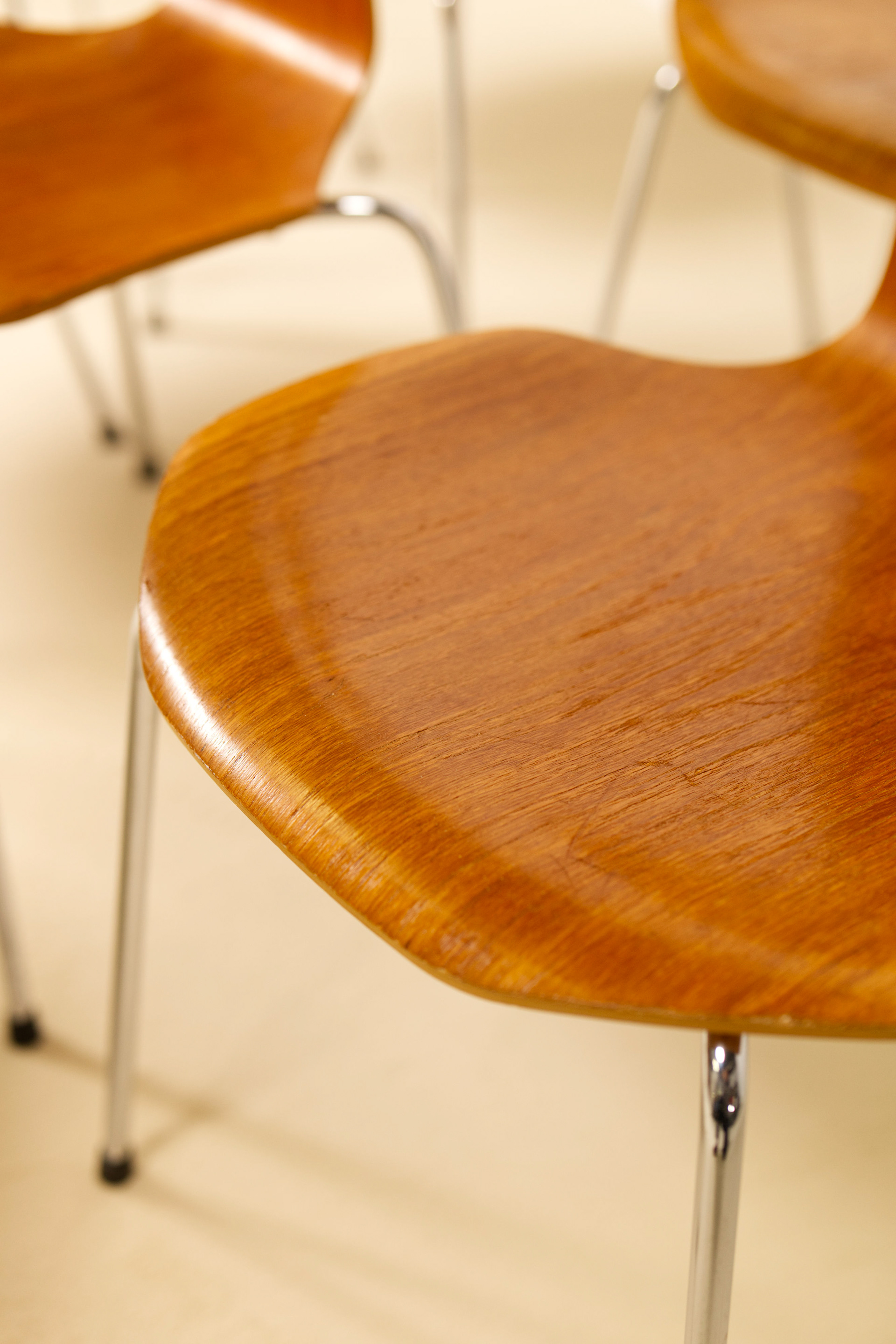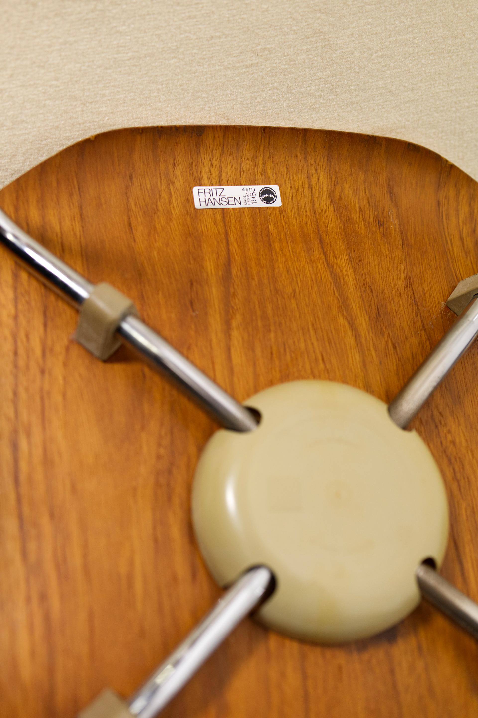 All chairs are in good vintage condition, with minor wear consistent with age. All backs are very strong. Some scratches, small chips and discolouring visible on the teak veneer. All chairs have new rubber feet, all original Fritz Hansen spare parts!