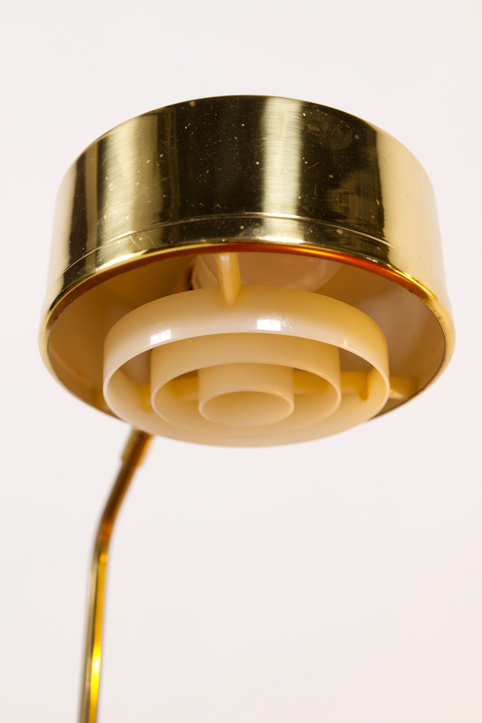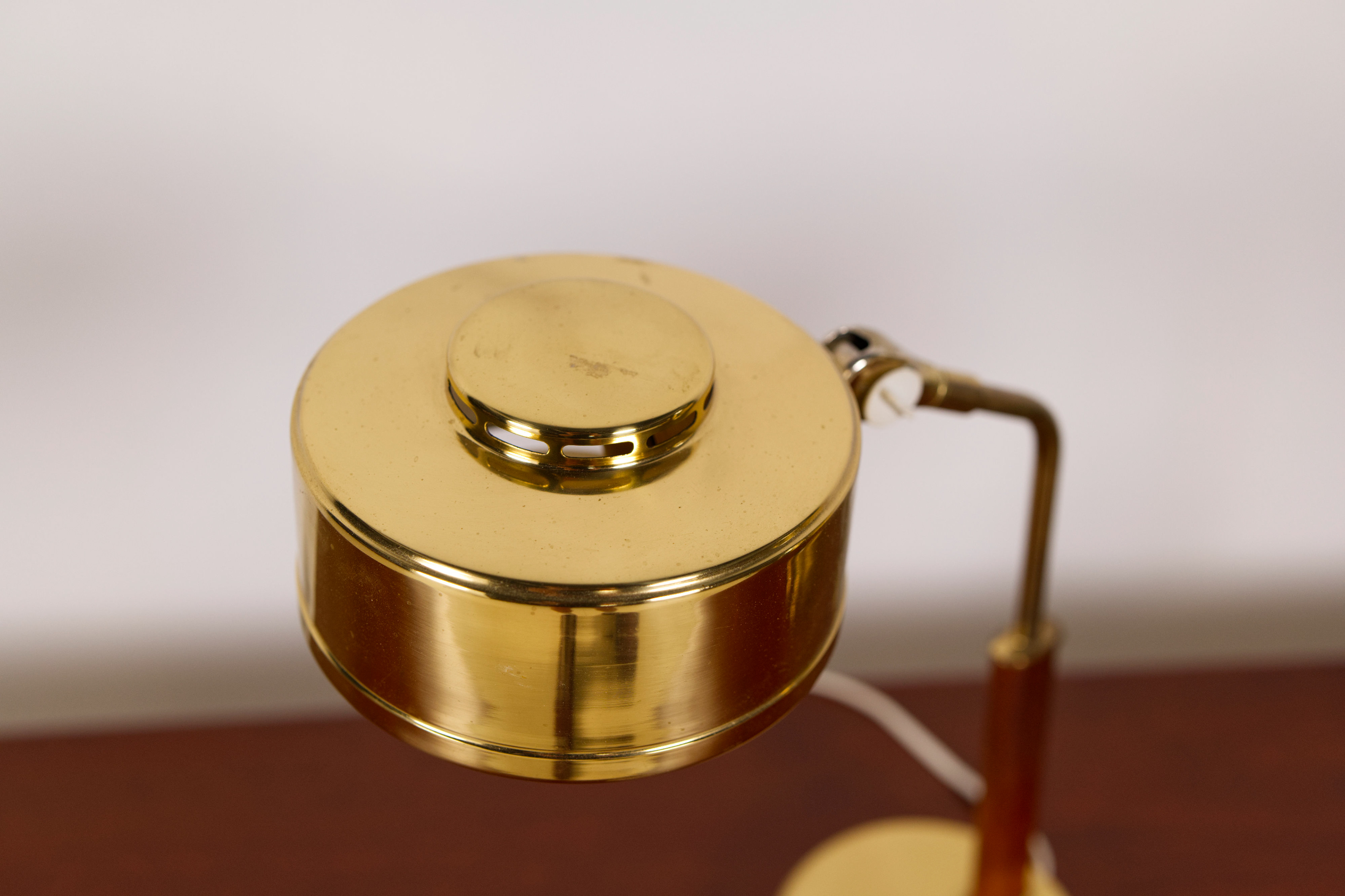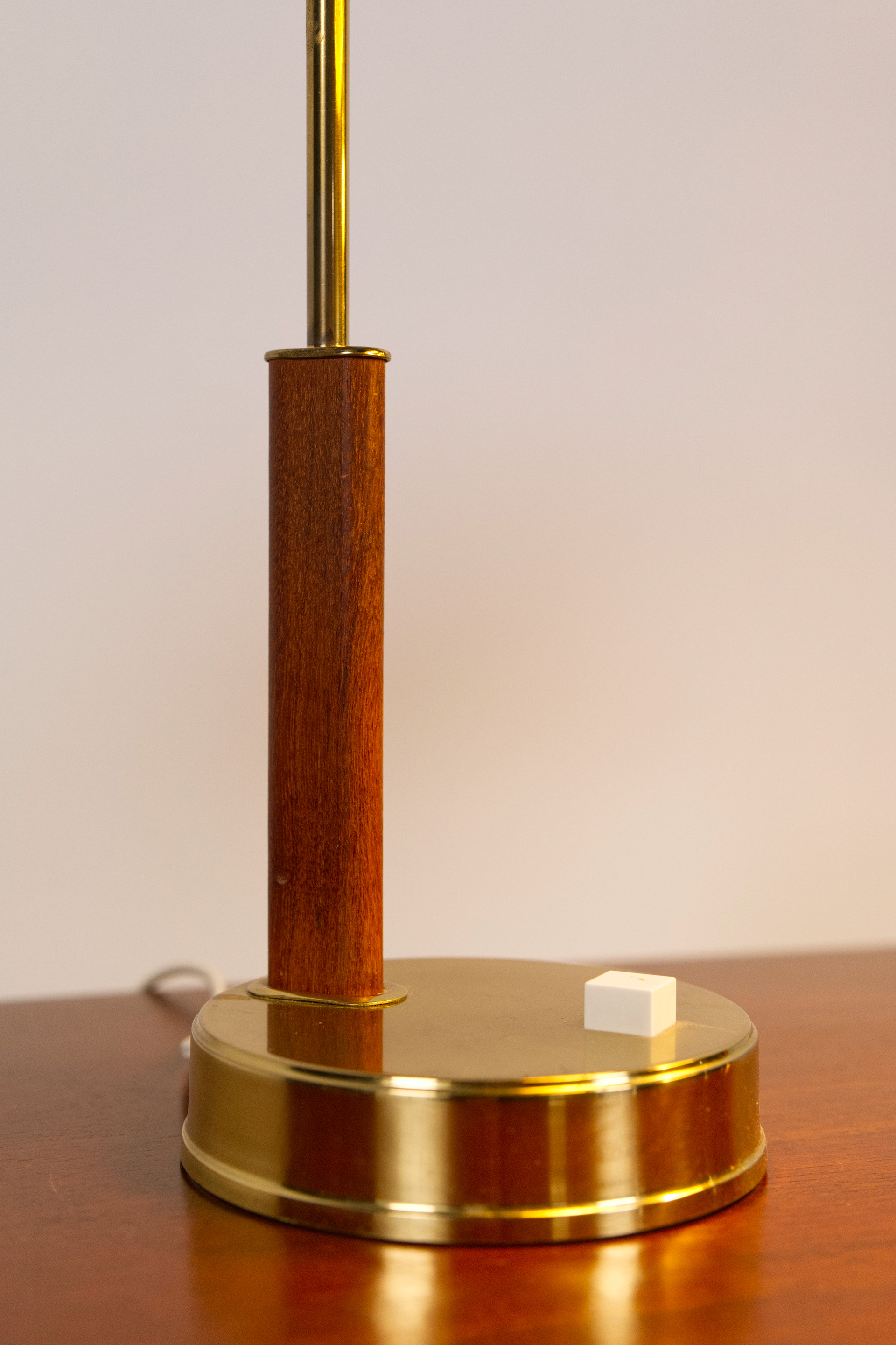 A pair of Swedish table lamps produced by BJS Skellefteå in the 1960s, combining brass bases and shades with teak elements on the arm. The warm wood contrasts with the polished brass, giving the lamps a refined yet natural character. The original plastic diffusers are still resting in the brass shade giving a nice diffused light. The mix of materials reflects the Scandinavian preference for combining the warmt of brass and teak wood. Subtle in design yet rich in detail, the lamps exemplify the quiet elegance of Swedish lighting from the mid-20th century.