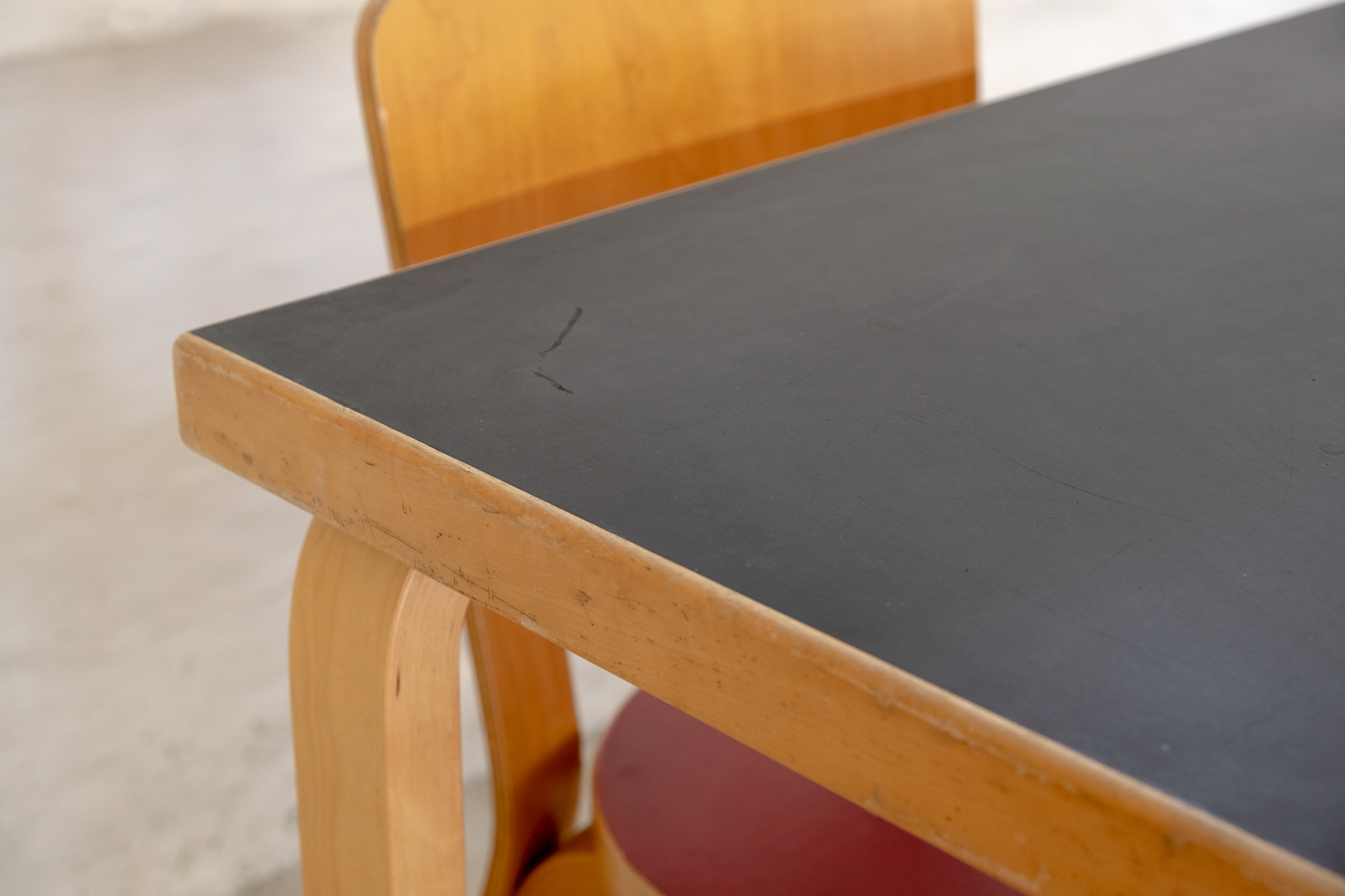 Alvar Aalto dining table model 81C, Artek, 1970s. Natural lacquered L-legs, black linoleum top. Dimension 75x75 cm. Height 71 cm. Adjustable legs. Usage related signs of wear, see photos to get an impression.