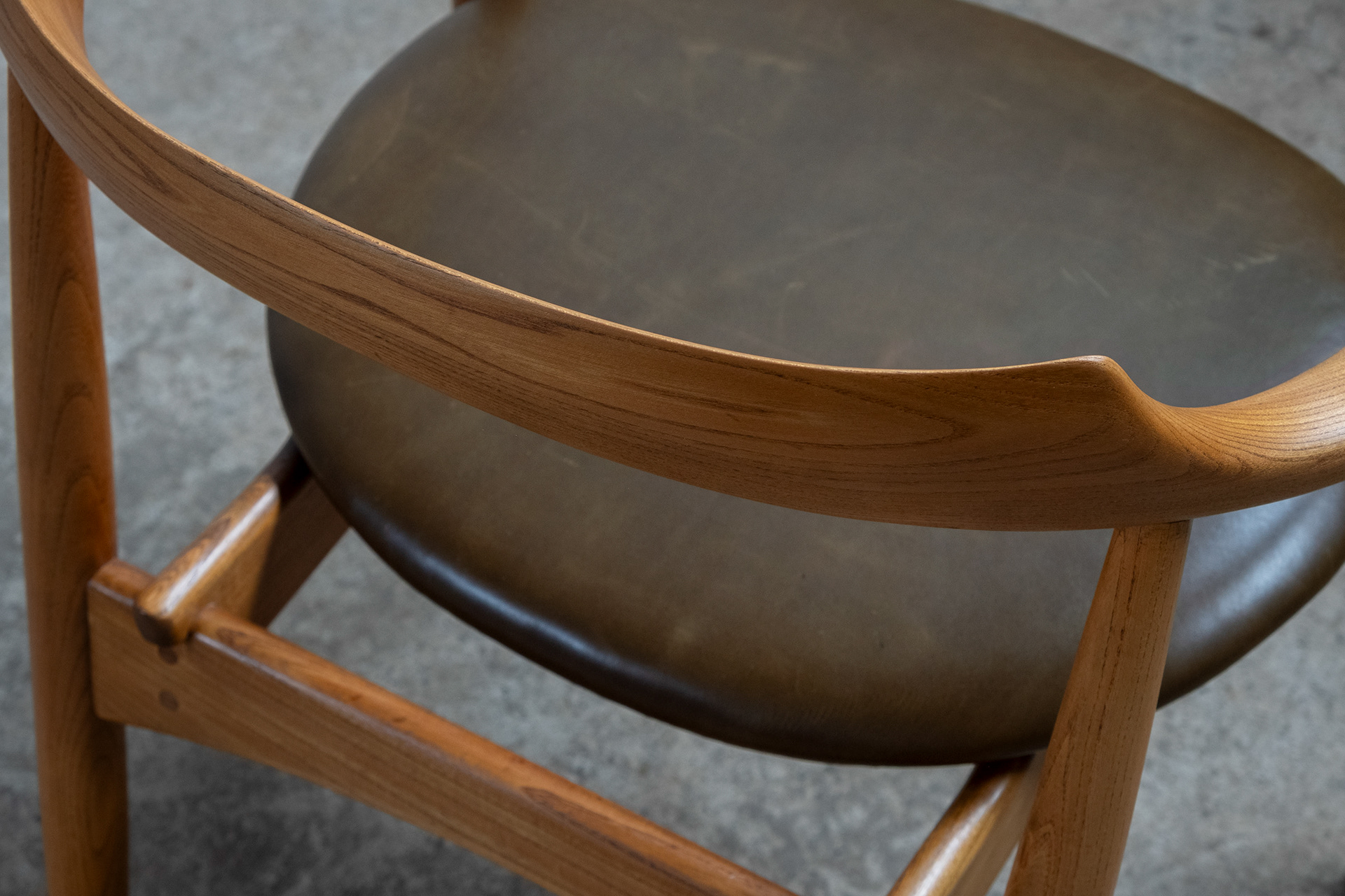 Round armchair in elm designed by Arne Wahl Iversen for Aage Petersen/Stilén in the 1960s. The chair is made from solid elm, even the round backrest and arms are one solid piece of elm that was steam bent. The seat is upholstered in a beautiful dark olive green leatherette. Very good vintage condition with minor signs of patina and wear.