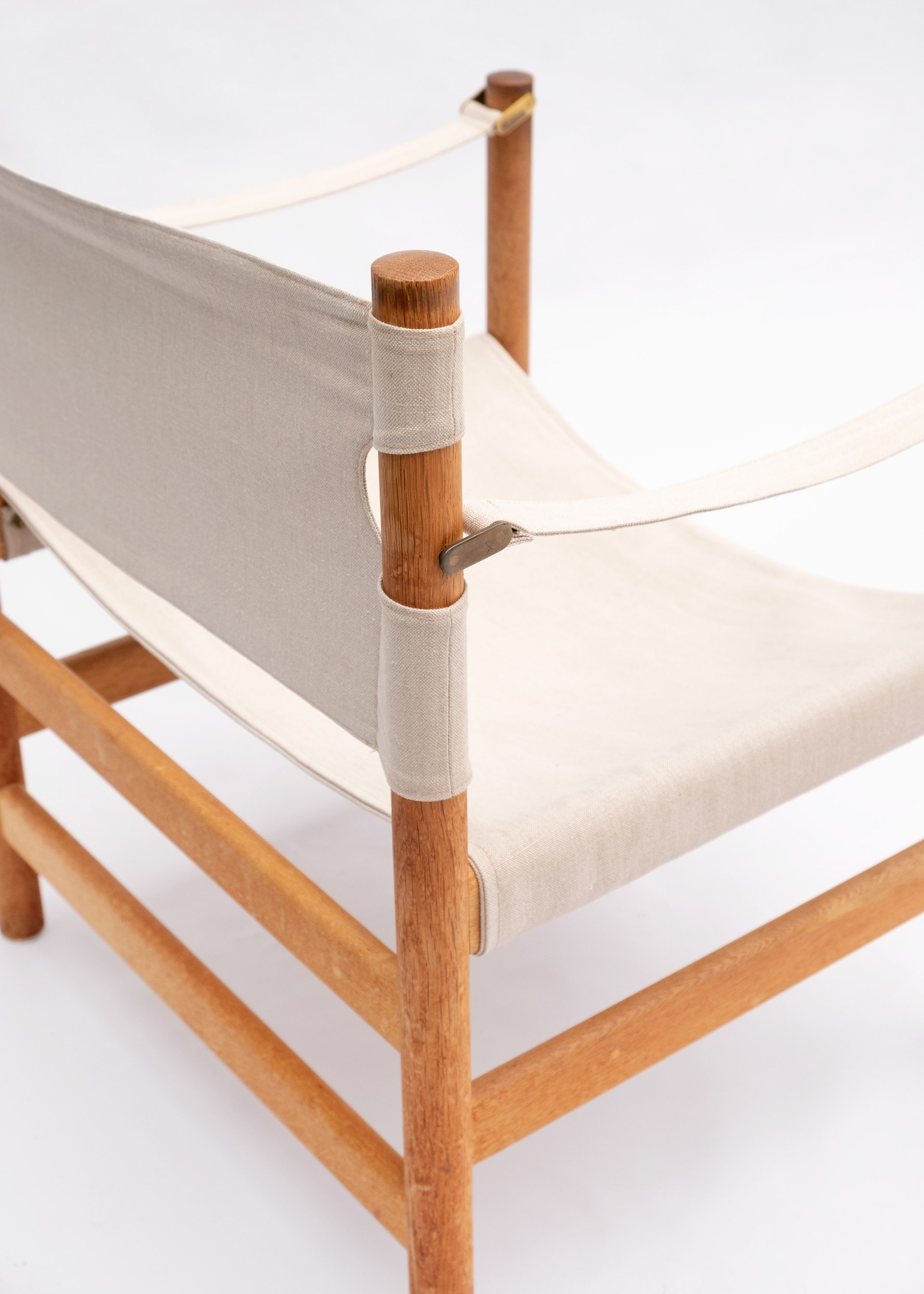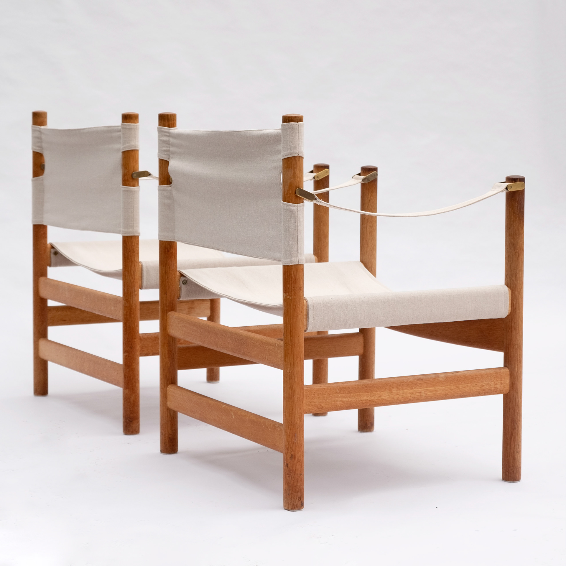 Zeer mooie en zeldzame set safari stoelen met voetbank van eik en messing met het originele canvas. Ontworpen door Børge Mogensen voor Fredericia, Denemarken.