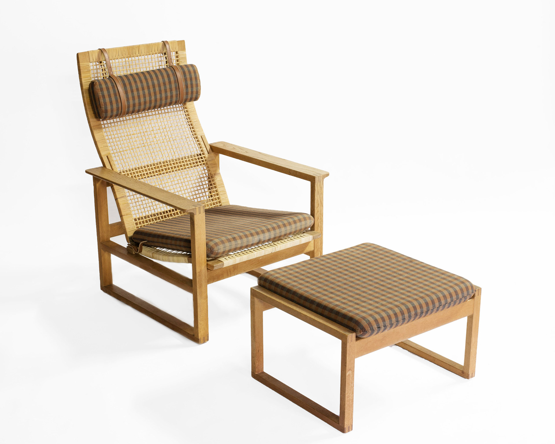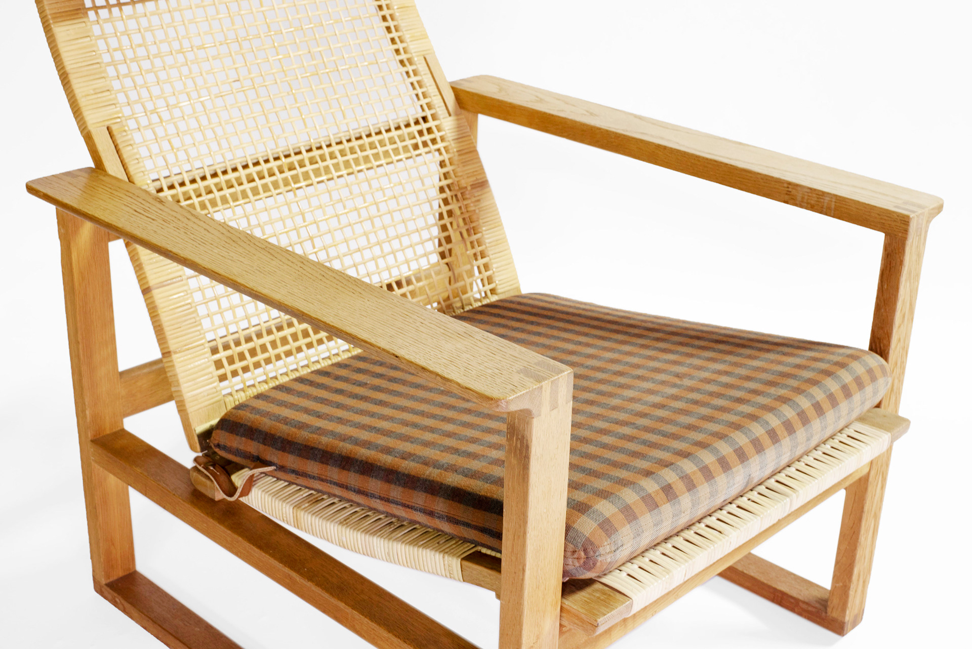 Lounge chair met hoge rug en ottoman in eik, ontworpen door Børge Mogensen in 1956 en geproduceerd door Fredericia. Het is een vroege editie met de zit en rug in riet; de zit is voorzien van nieuw vlechtwerk. Alle kussens en textiel is origineel en in goede conditie; het kussen van de rug is licht gebogen door gebruik. Het hout en de houtverbindingen zijn in zeer goede staat!
