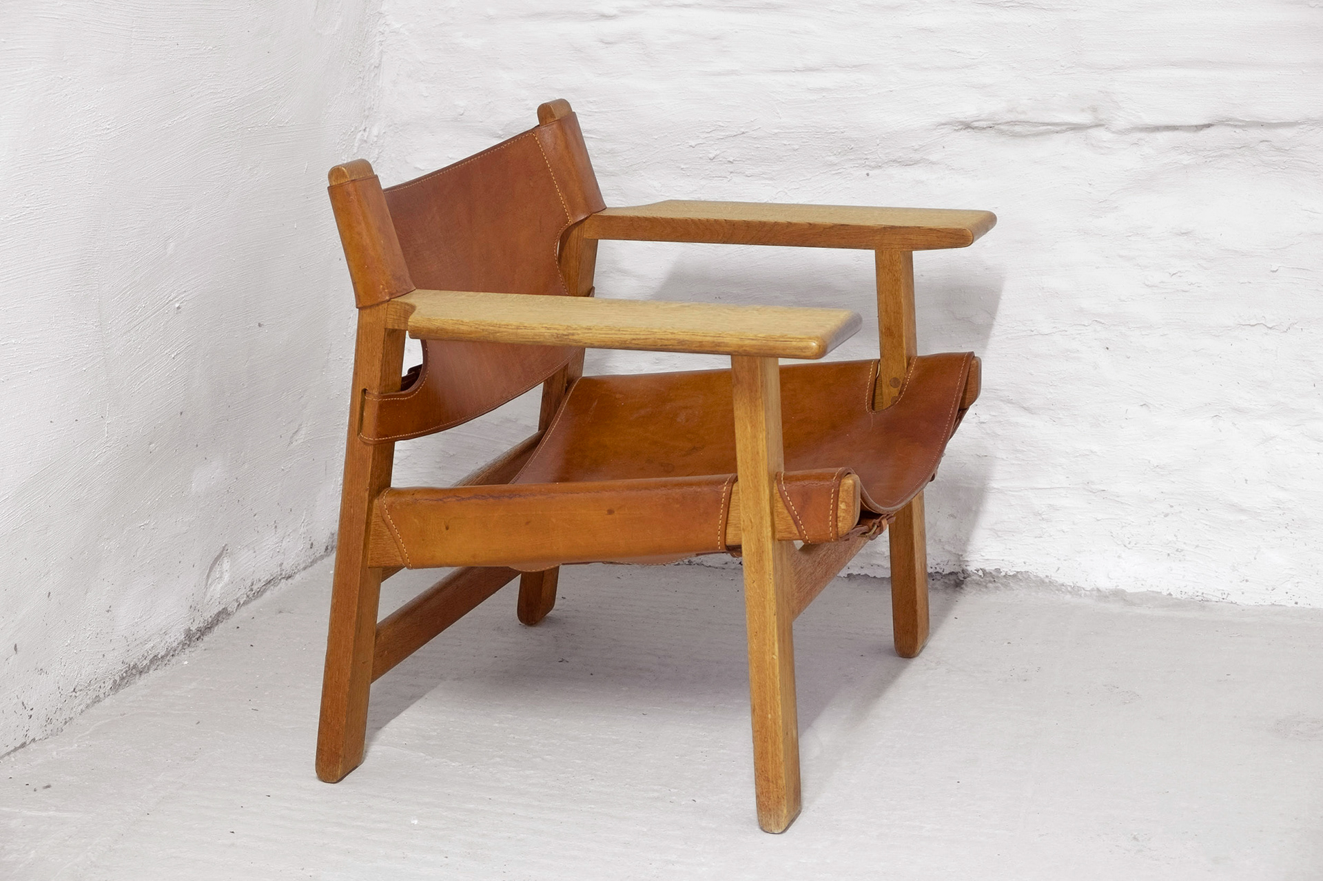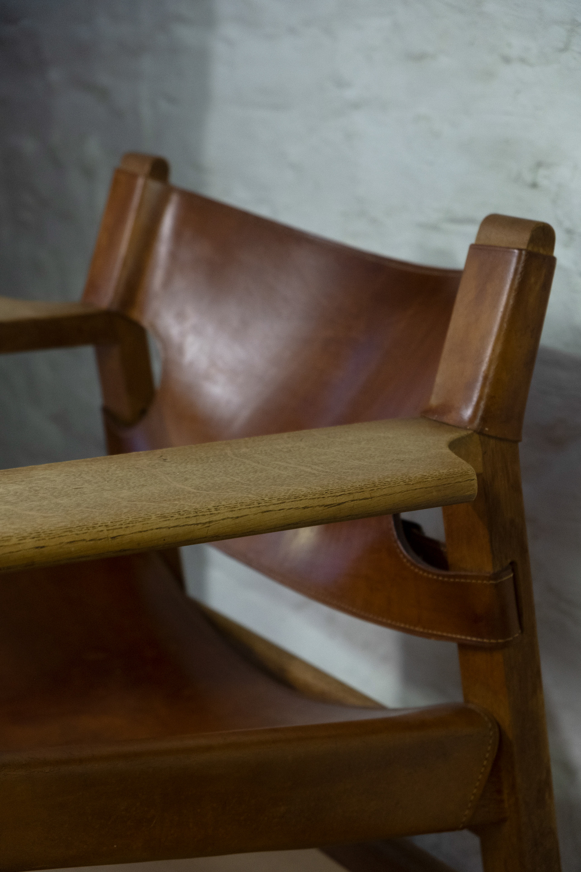 Early edition of The Spanish Chair by Børge Mogensen for Fredericia Stolefabrik, Denmark. Solid oak and cognac leather with beautiful patina. This well-known design classic by Børge Mogensen is known for its strong functionalist character and great proportions. The saddle leather provides great comfort, the broad armrests not only provide a comfortable place for your arms but also offer a practical place to put a glass or cup. The chair was designed in 1958 after Børge Mogensen and his family traveled to Spain and was inspired by local furniture.