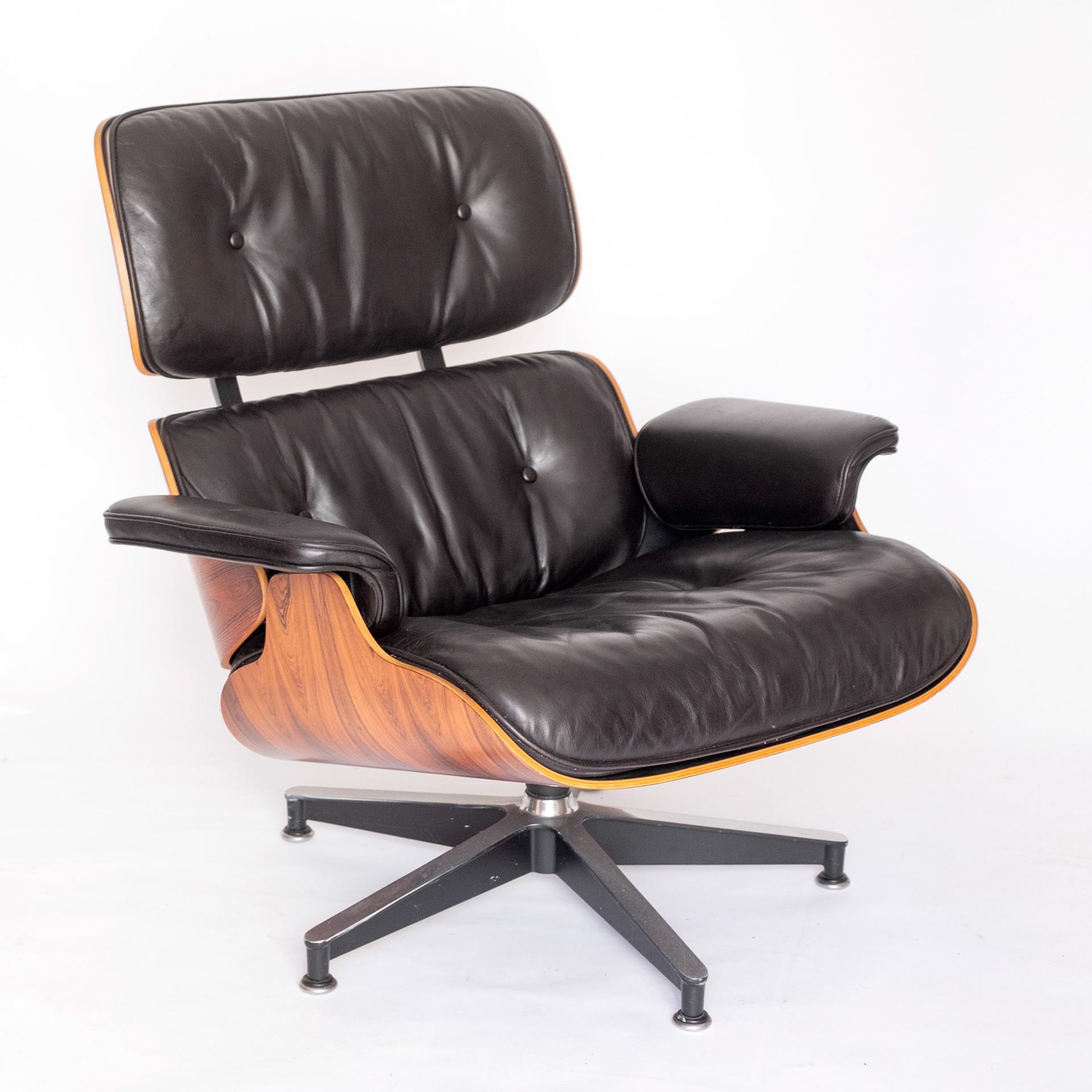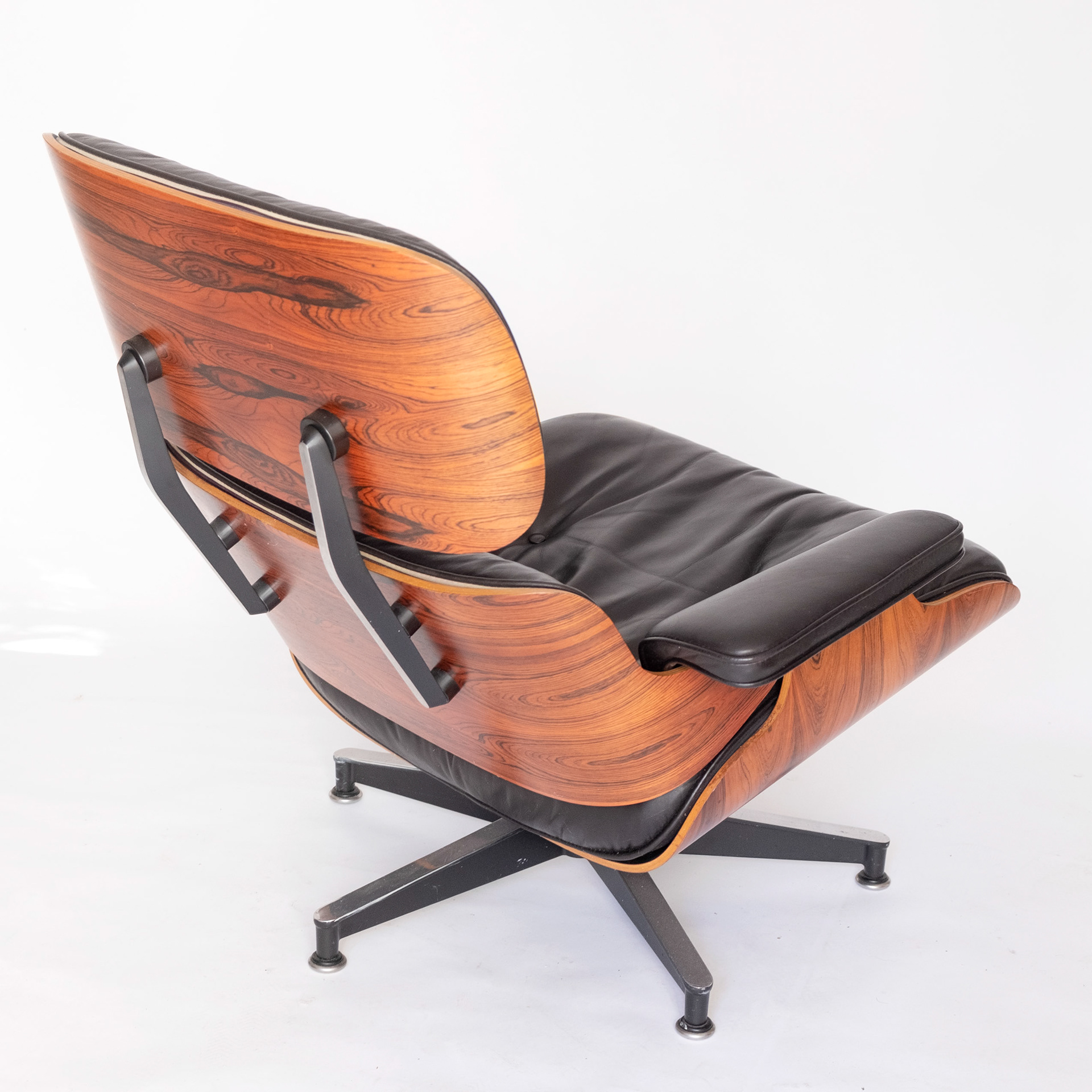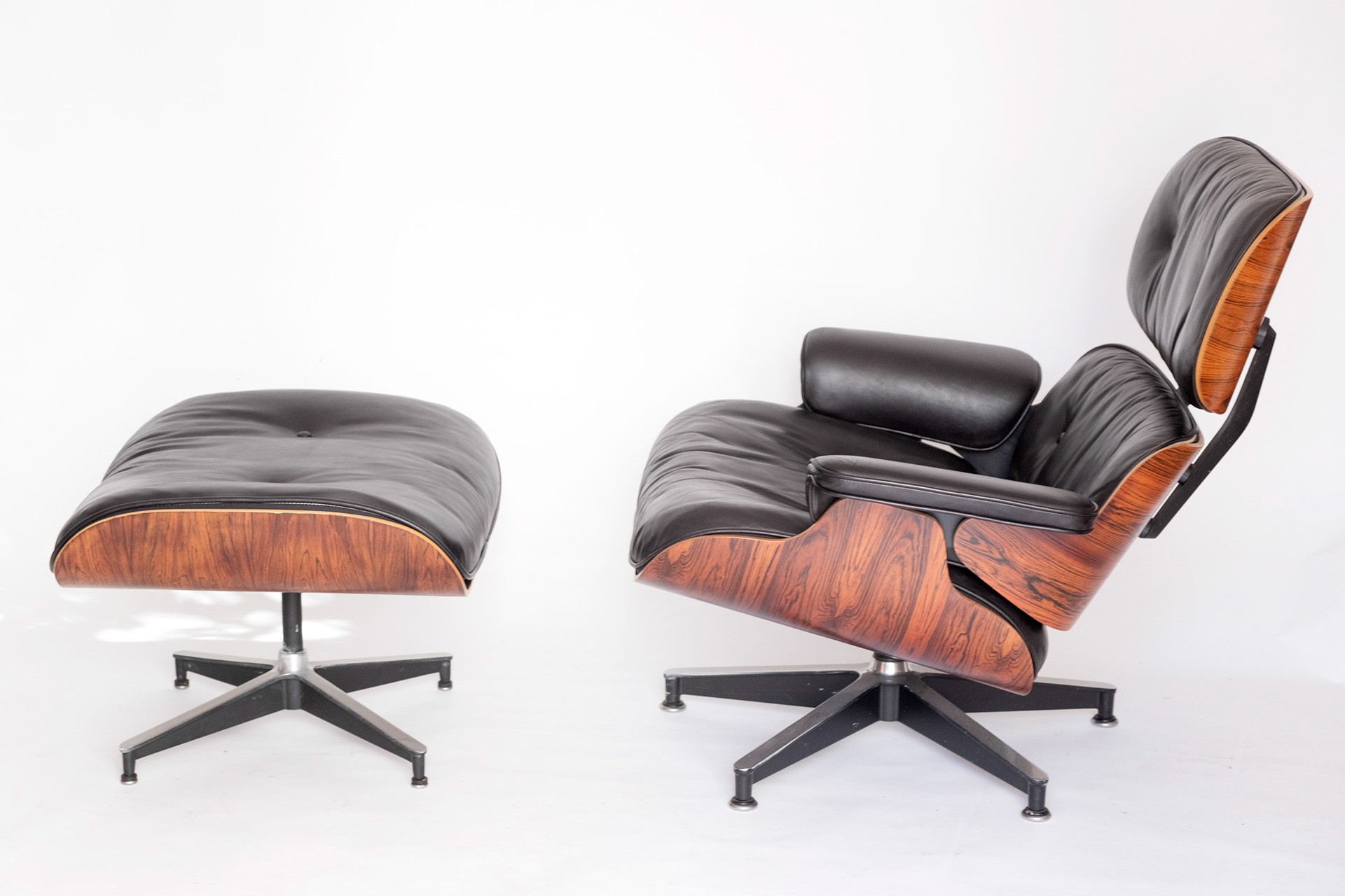 Lounge chair and ottoman by Charles and Ray Eames produced by Herman Miller in rio palisander, circa late 1970s/early 1980s. Black leather upholstery, chair and ottoman have adjustable glides for level use on variety of surfaces. Beautiful grain pattern. The chair and ottoman have been restored, leather cleaned and conditioned.