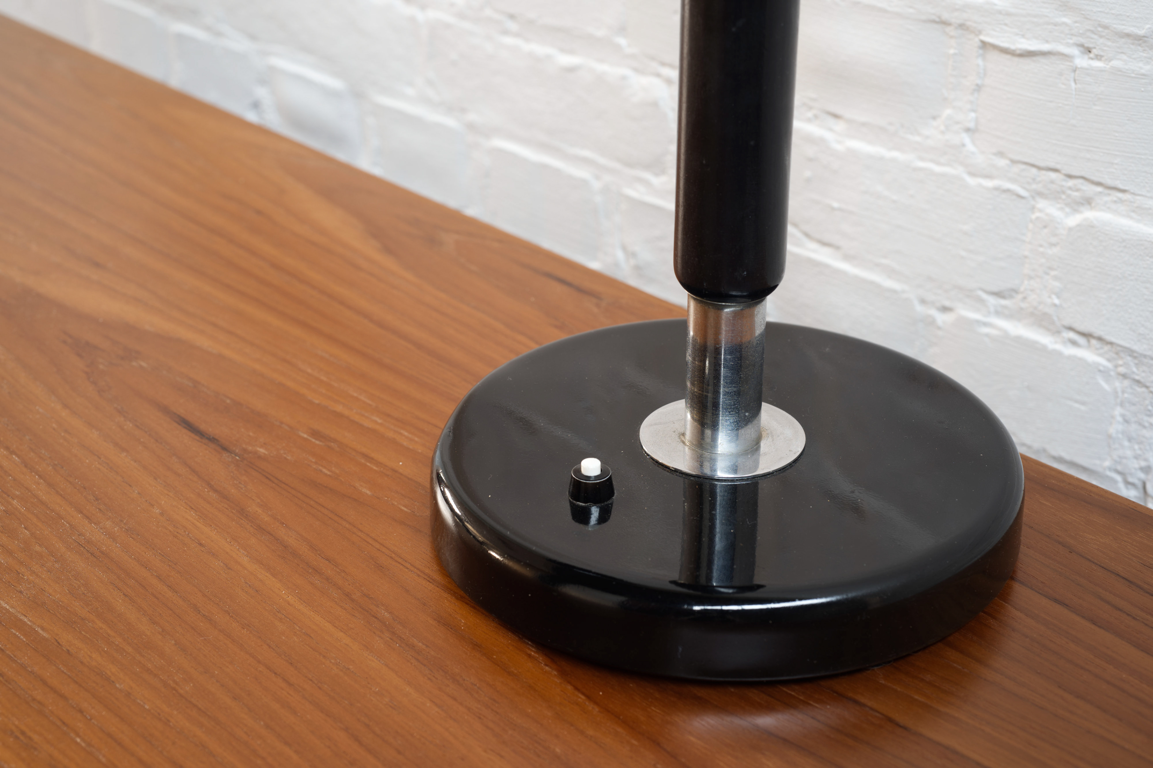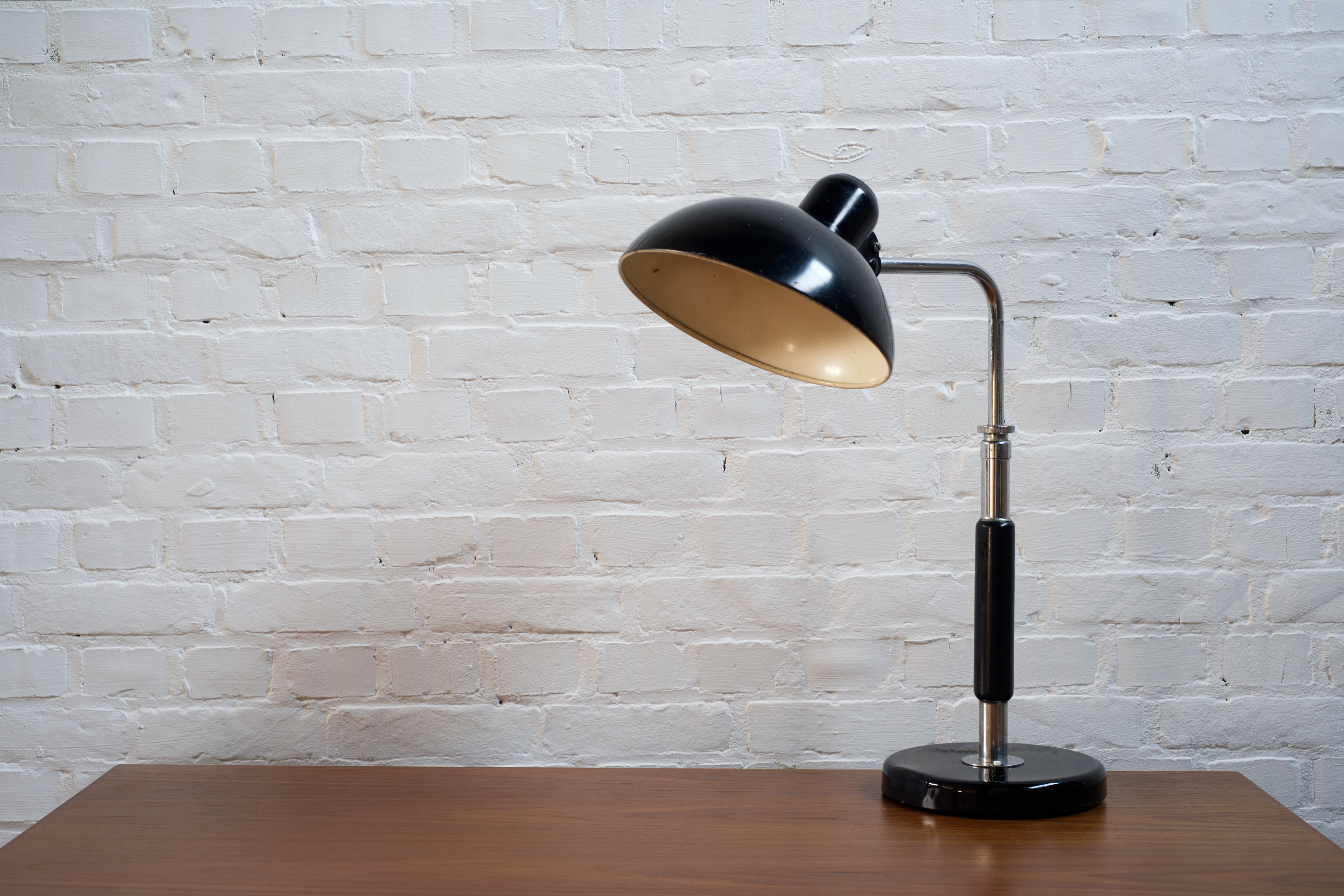 A rare Christian Dell, model 6607 super desk lamp by Kaiser Idell from the 1930's. Bauhaus design, with adjustable height and lampshade can be pitched in a lot of positions. Very rare early model with a beautiful ebonised wooden handle. Chrome plated steel post and painted brass lampshade. A quality that can not be replicated.