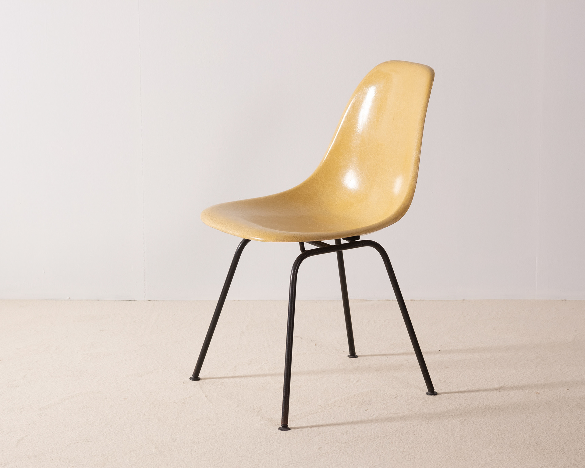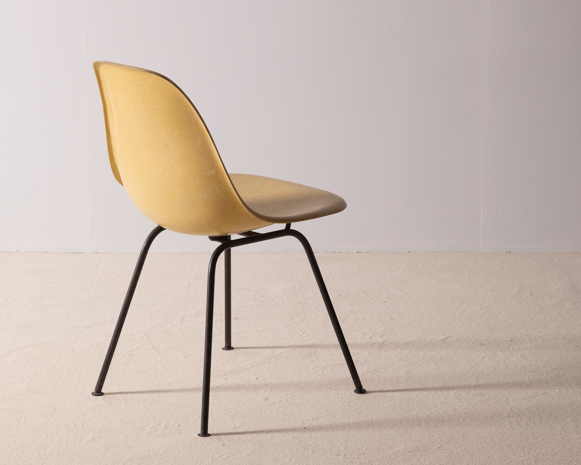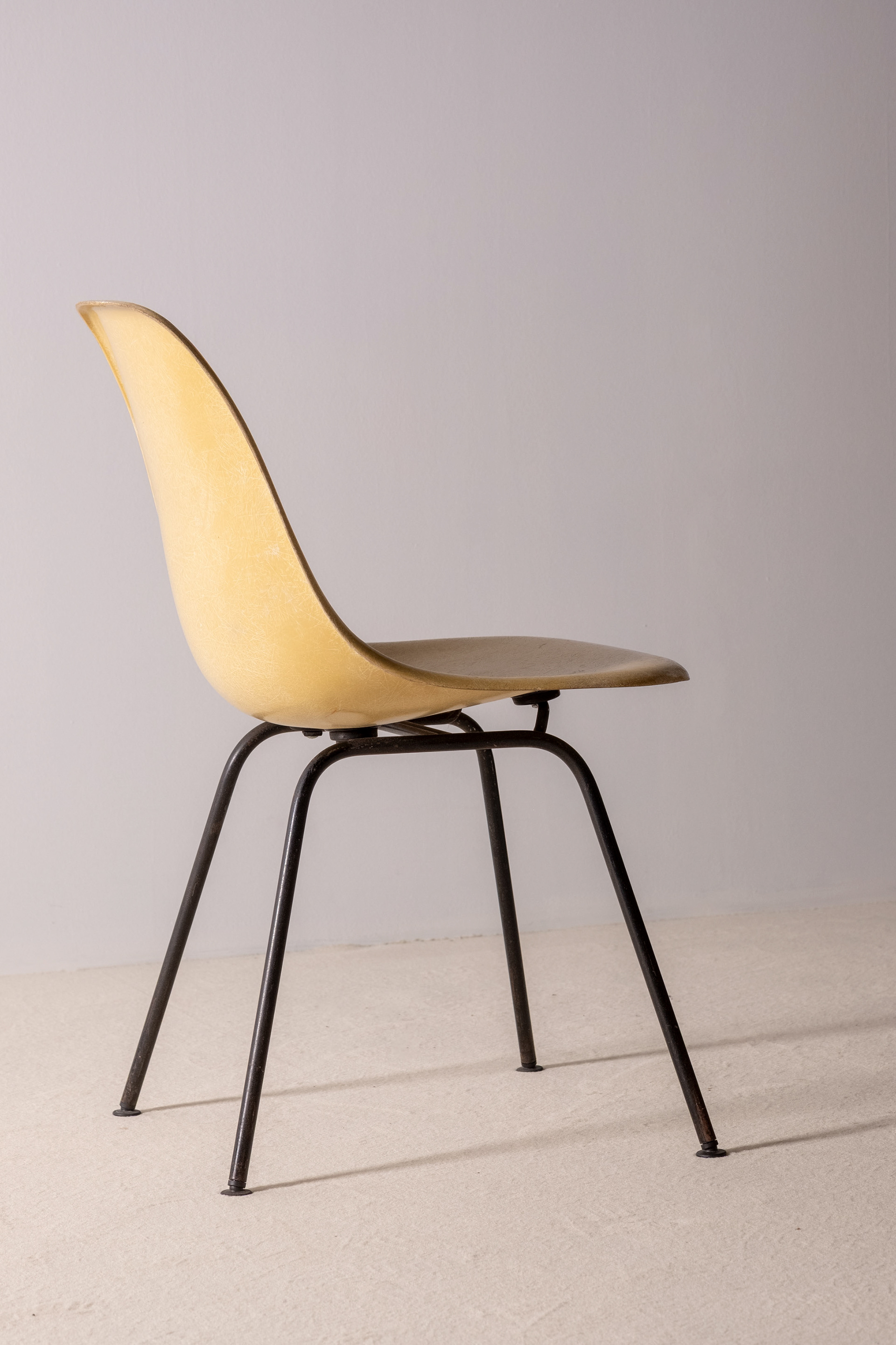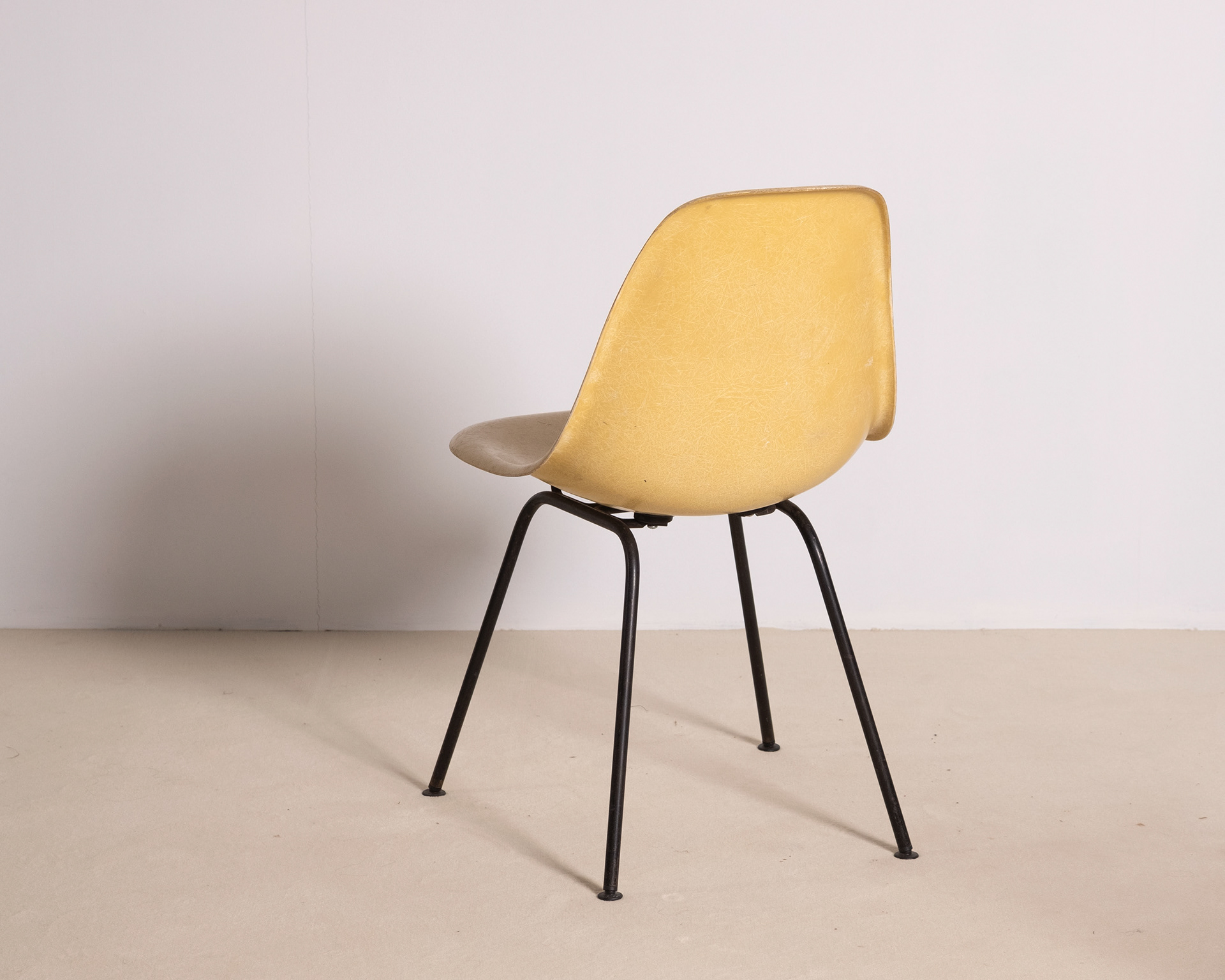 Charles & Ray Eames fiberglass side chair in ochre colour with black H base. A perfect example of an original classic, beautiful combination of the ochre shell and black base. The chair is in good original condition for its age. The shock mounts have been re-glued in the correct manner. The shell is stamped by Herman Miller and Summit.