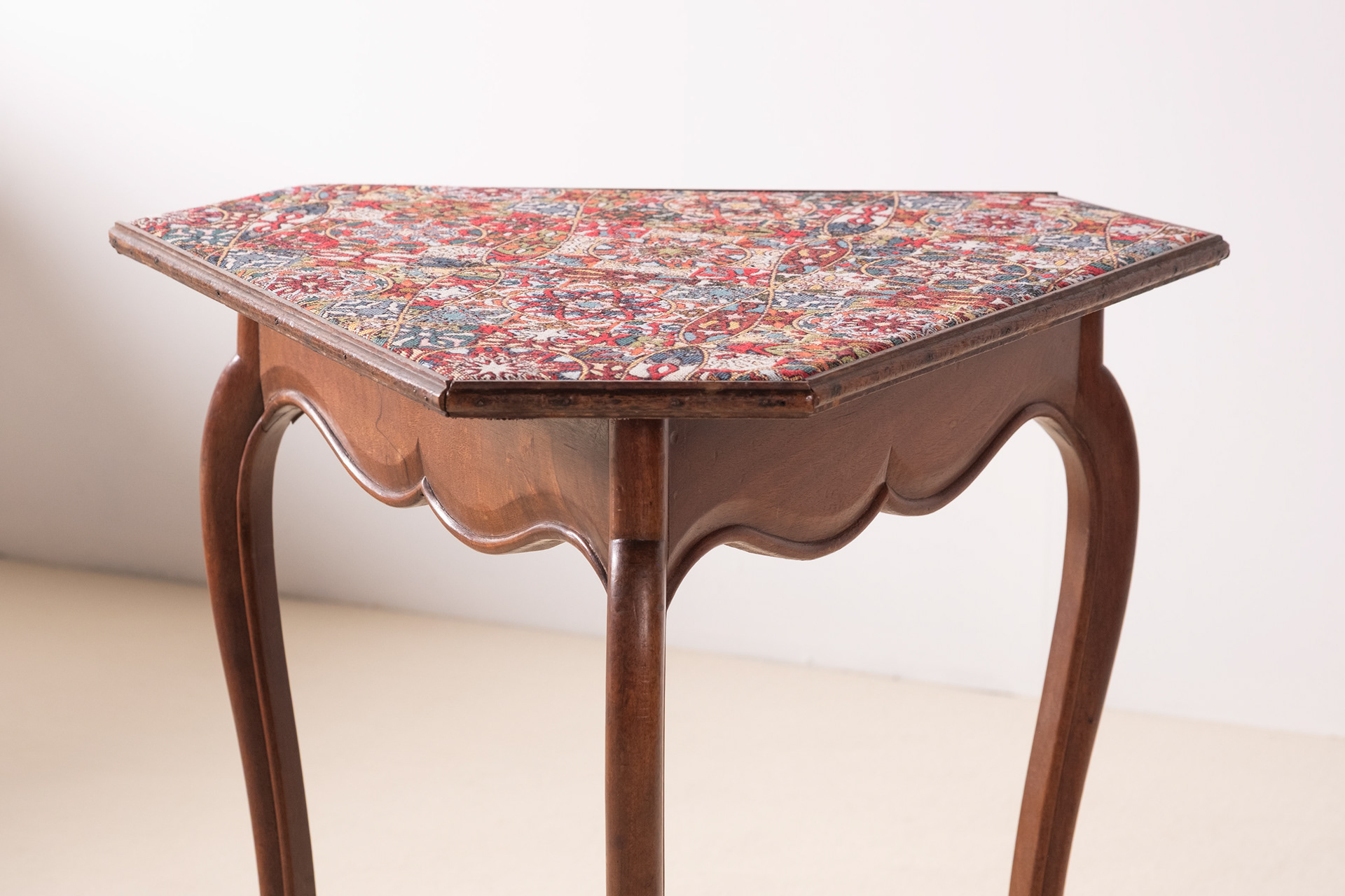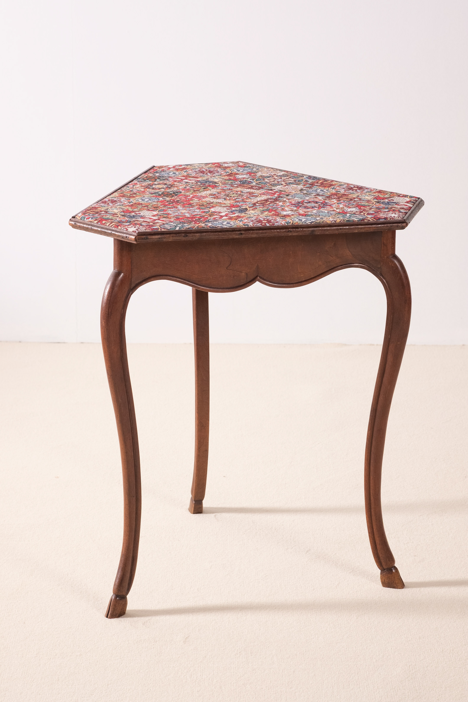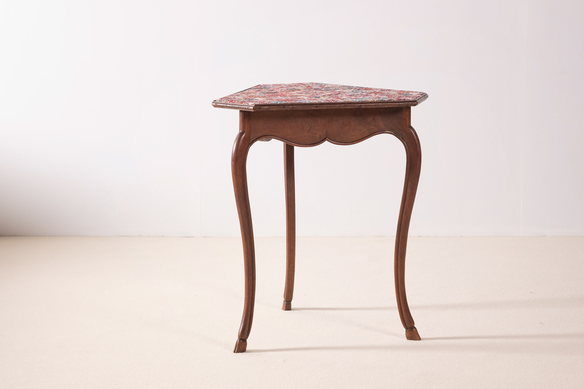 Elegant and playful French 19th Century side table in the Louis XV style. Lovely and sculptural legs with deer hoof feet. The textile on top has been replaced but is of a wonderful quality and is rich in details. HxWxD: 65cm x 50,5cm x 59cm