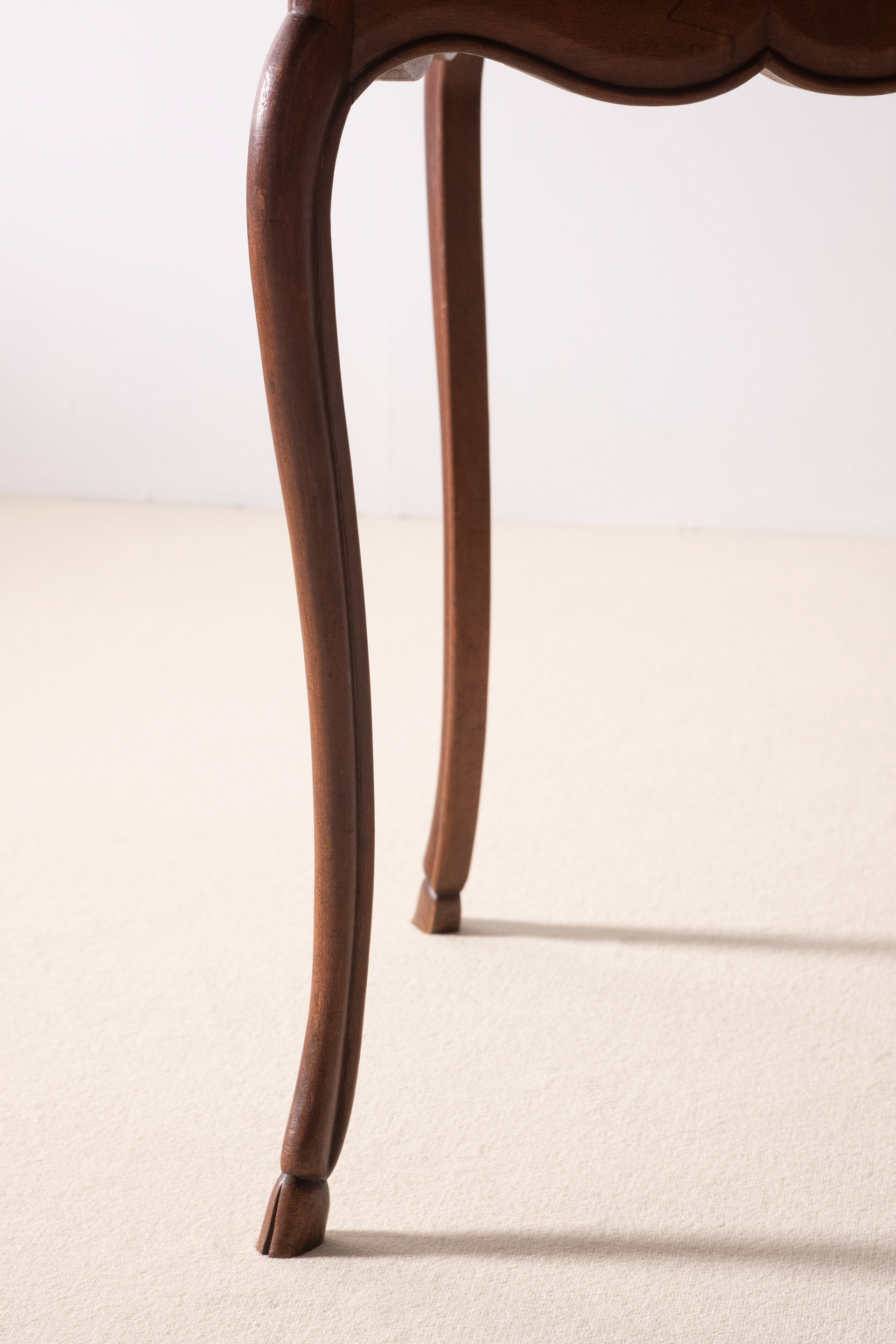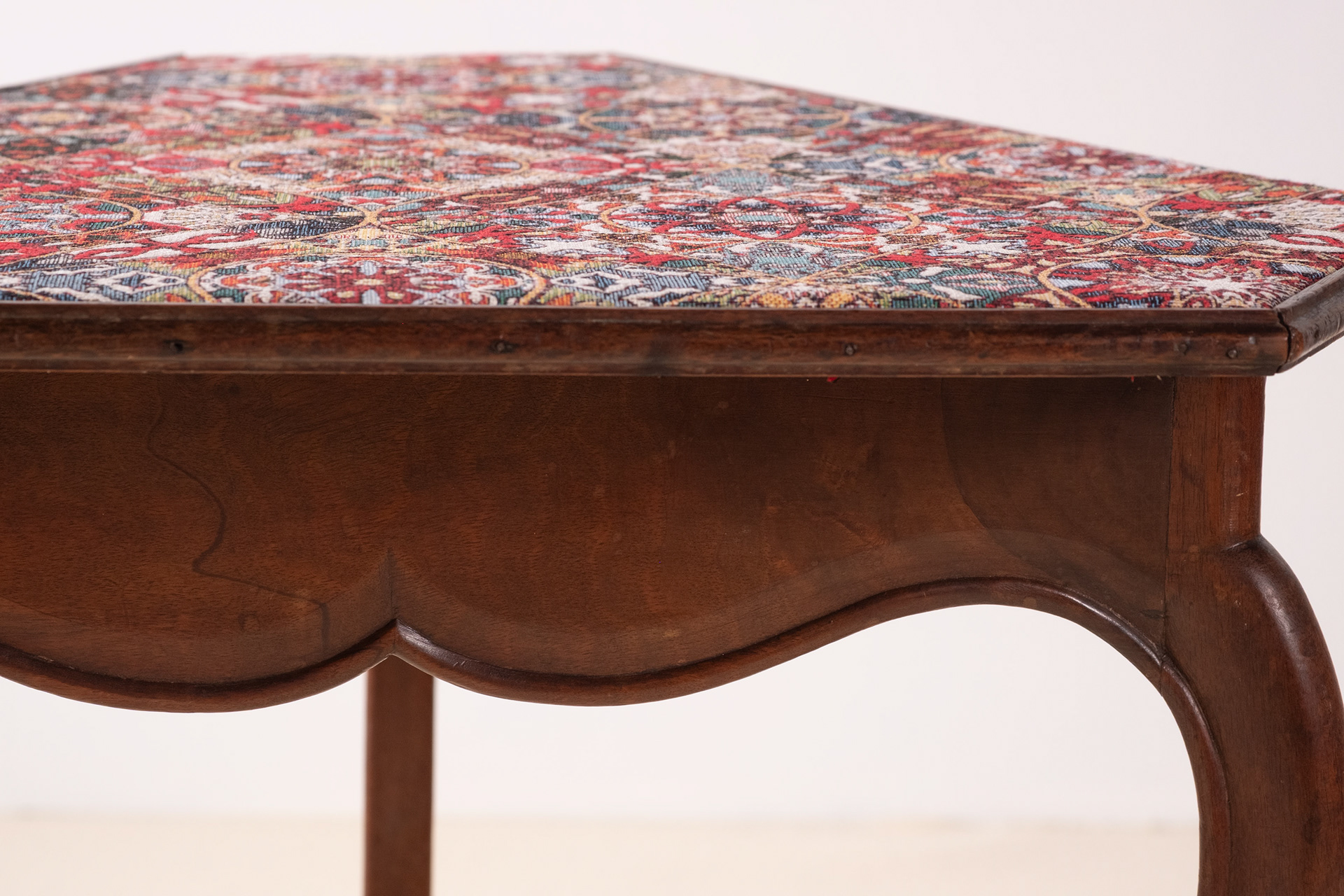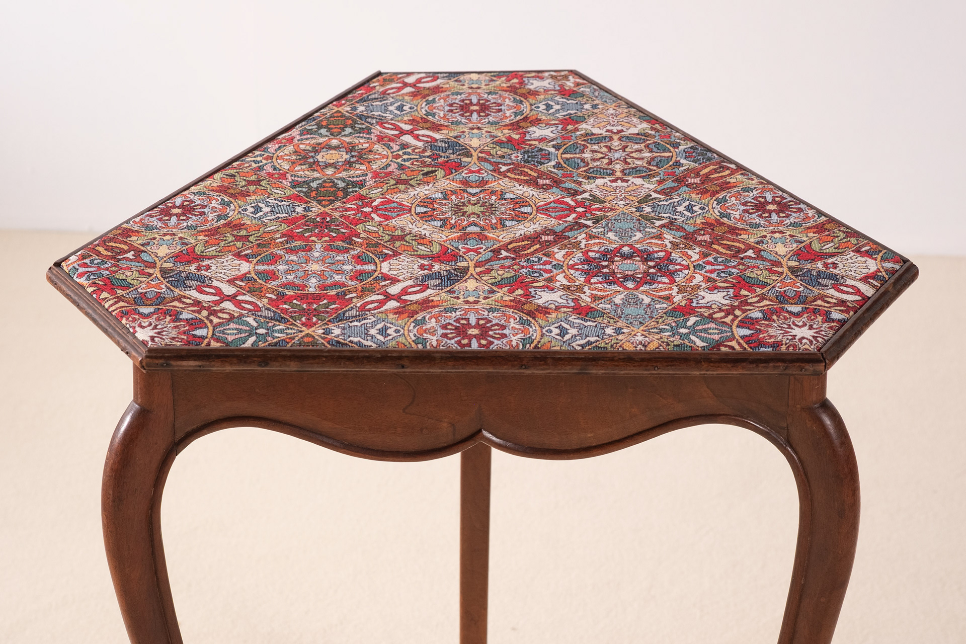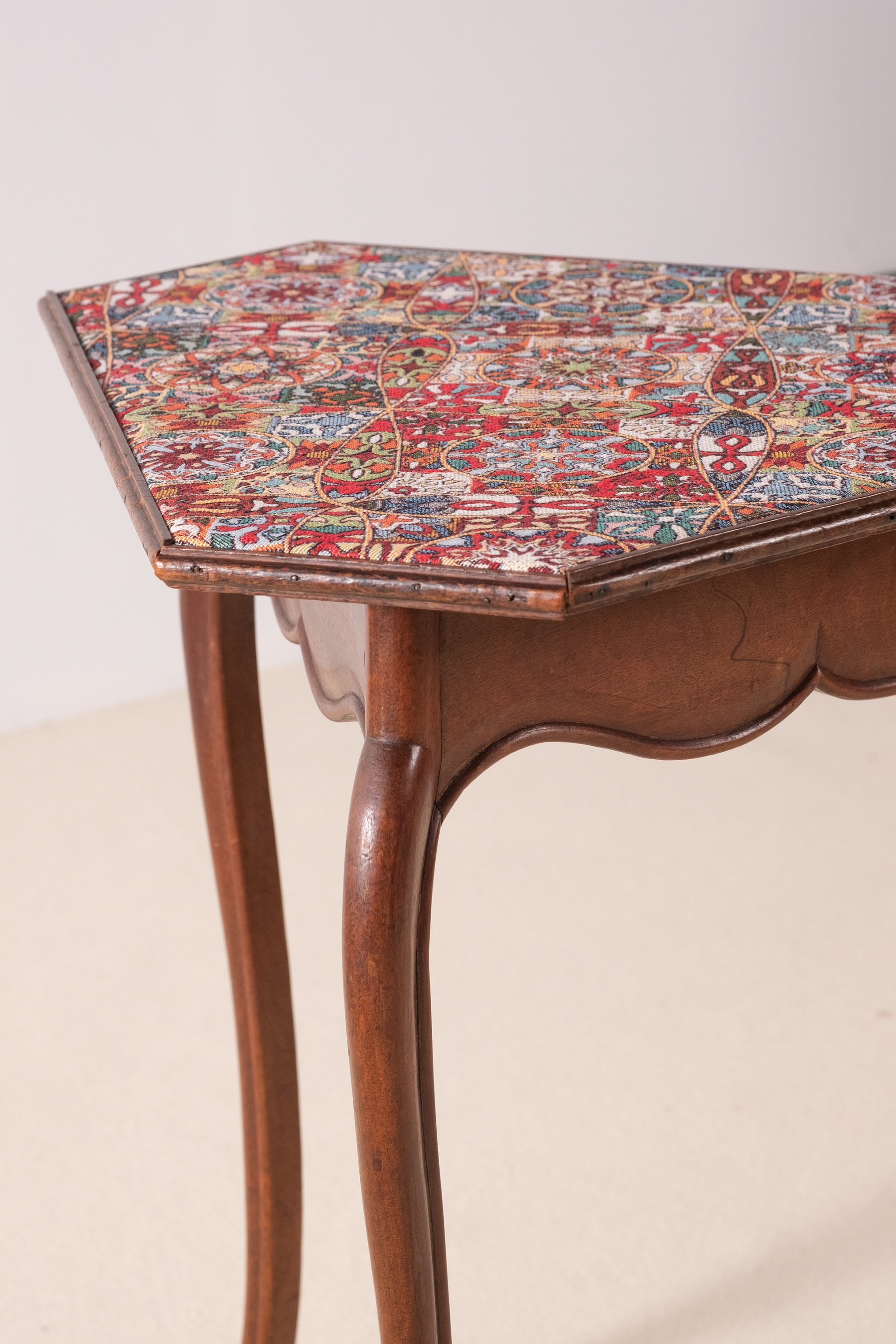 Elegant and playful French 19th Century side table in the Louis XV style. Lovely and sculptural legs with deer hoof feet. The textile on top has been replaced but is of a wonderful quality and is rich in details. HxWxD: 65cm x 50,5cm x 59cm