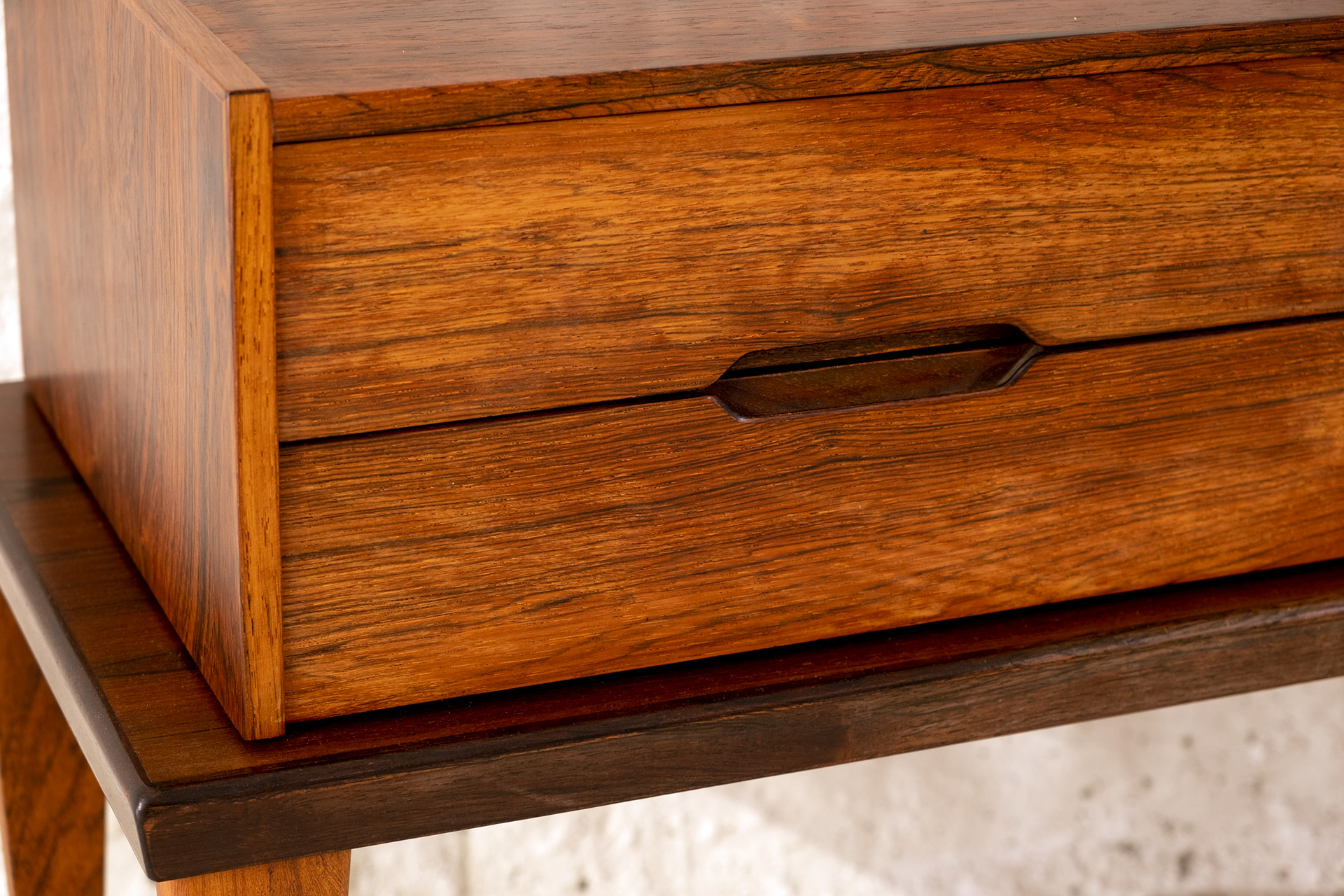Kai Kristiansen Hallway set in rosewood. Consisting of a bench with drawer module with two drawers as well as a rare Kai Kristiansen mirror model 114, originally belonging to the hall set. The drawer section can be placed anywhere on the bench. Made and stamped by Aksel Kjersgaard, Odder, in the 1960s. One small veneer repair on the drawer module.