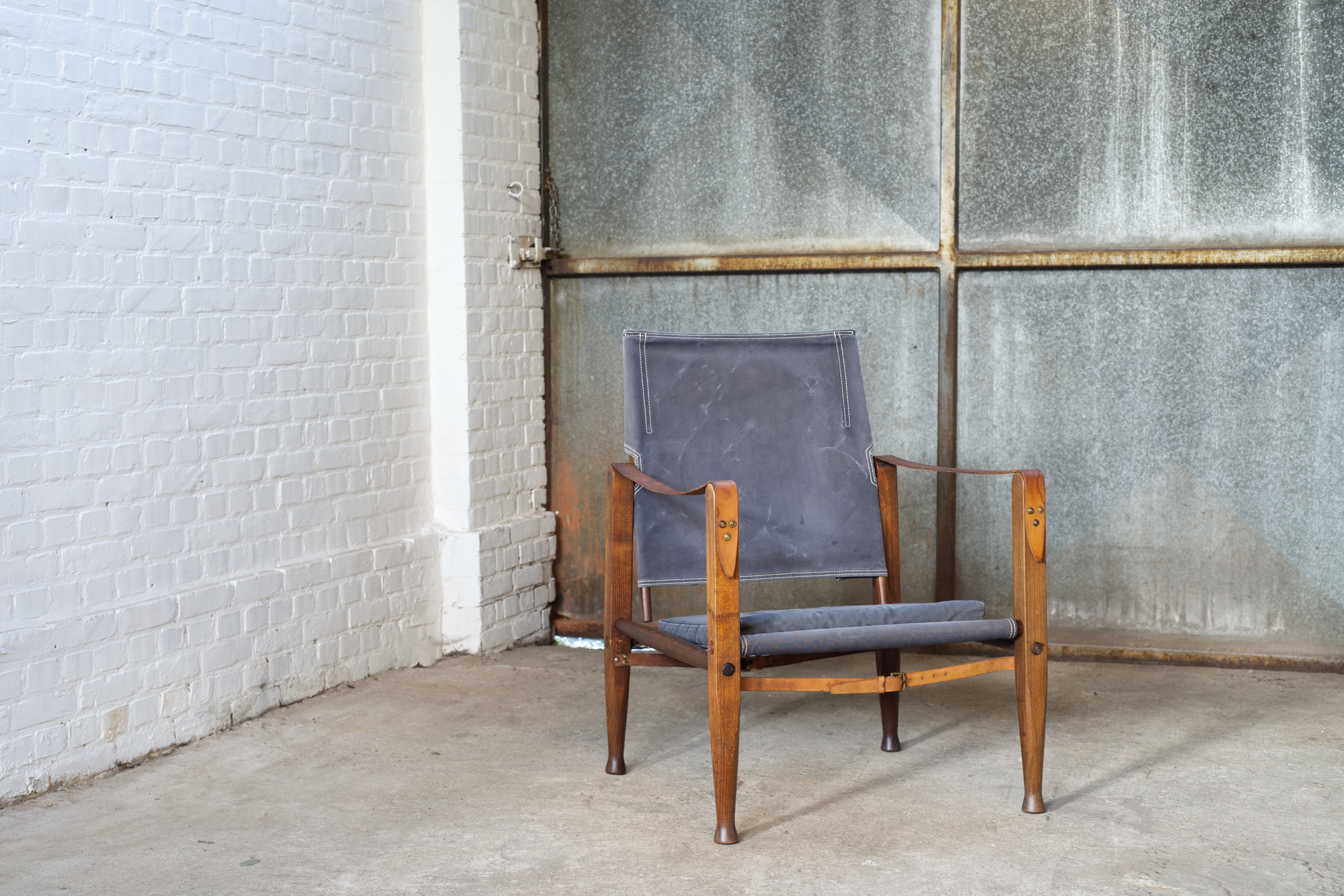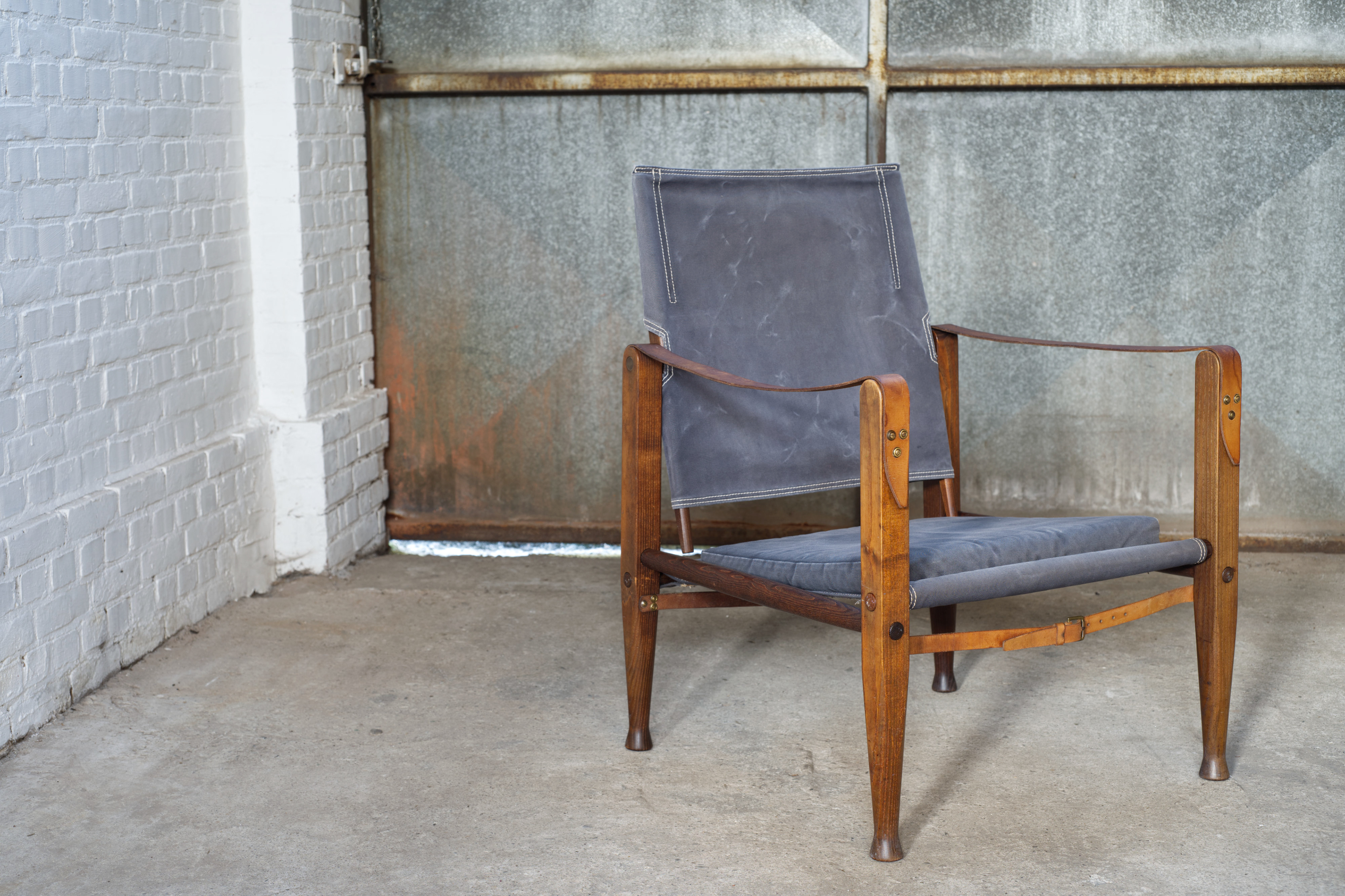 A very original vintage Safari Chair designed by Kaare Klint in 1933. Produced by Rud Rasmussen. Blue/grey canvas version with ash frame fully original. Patina and a worn canvas colour makes this my favourite version of this design classic. Frame is marked by the maker. In good vintage condition, in accordance with age and normal use. Cleaned canvas and leather has been reconditioned.