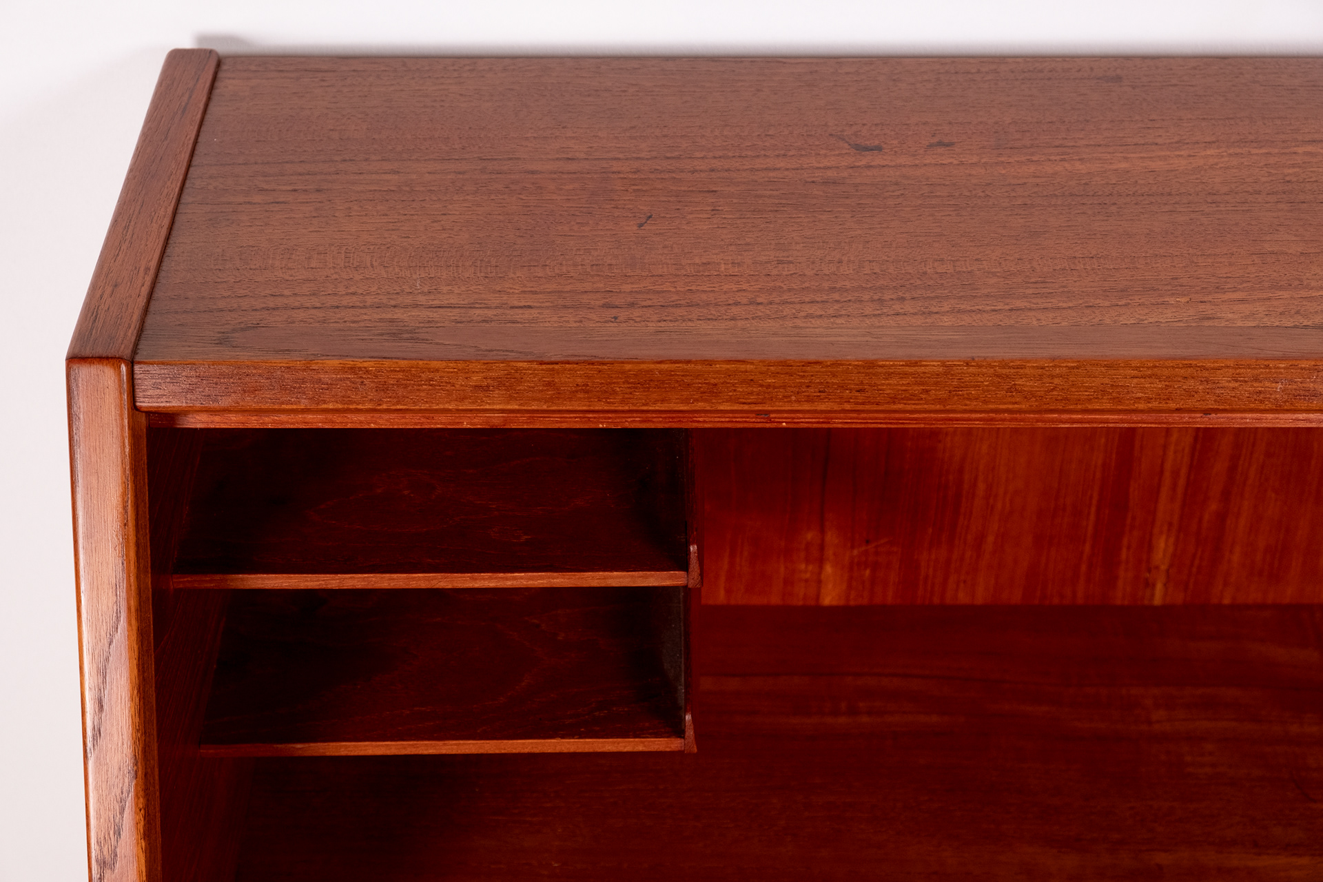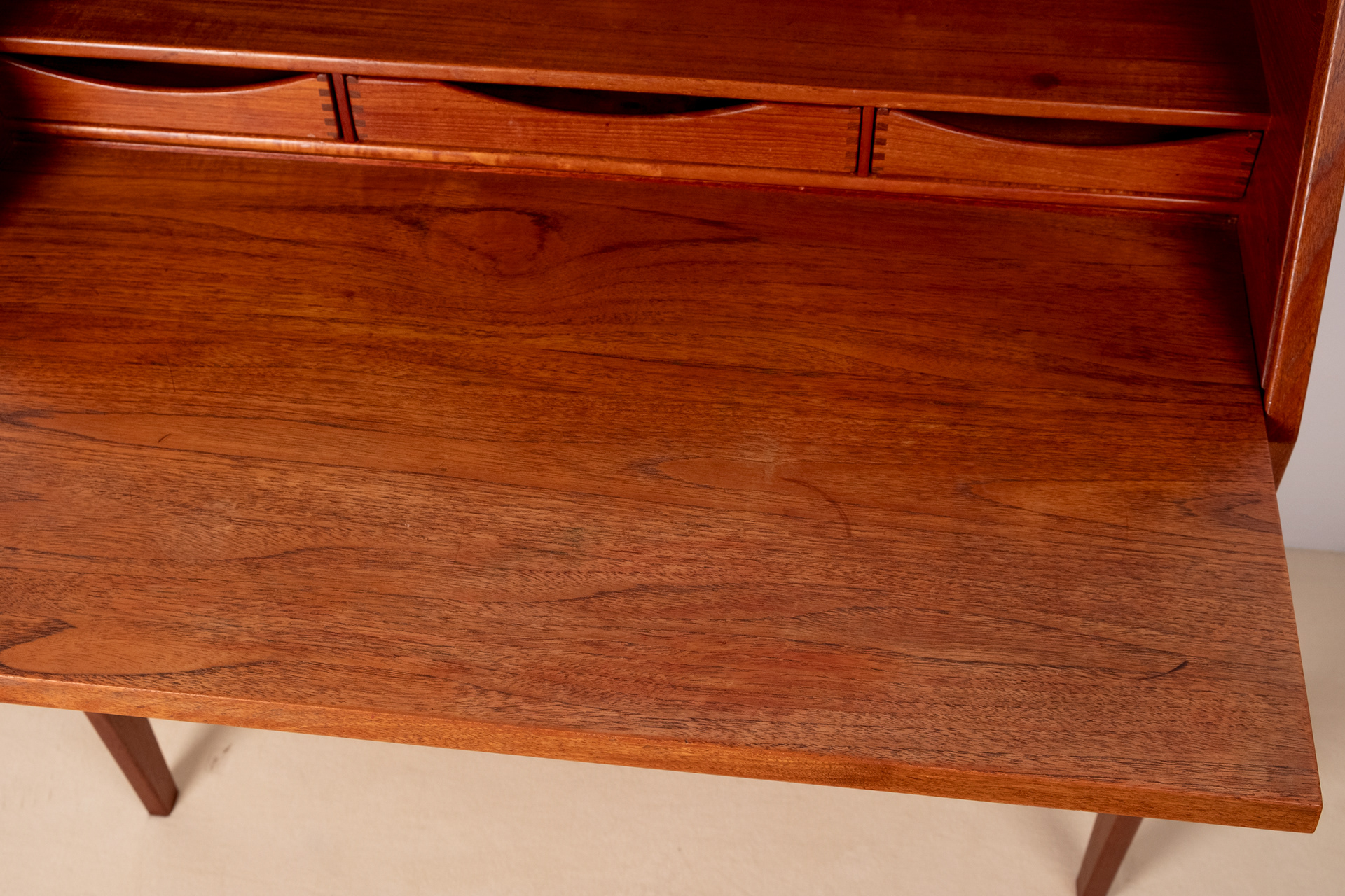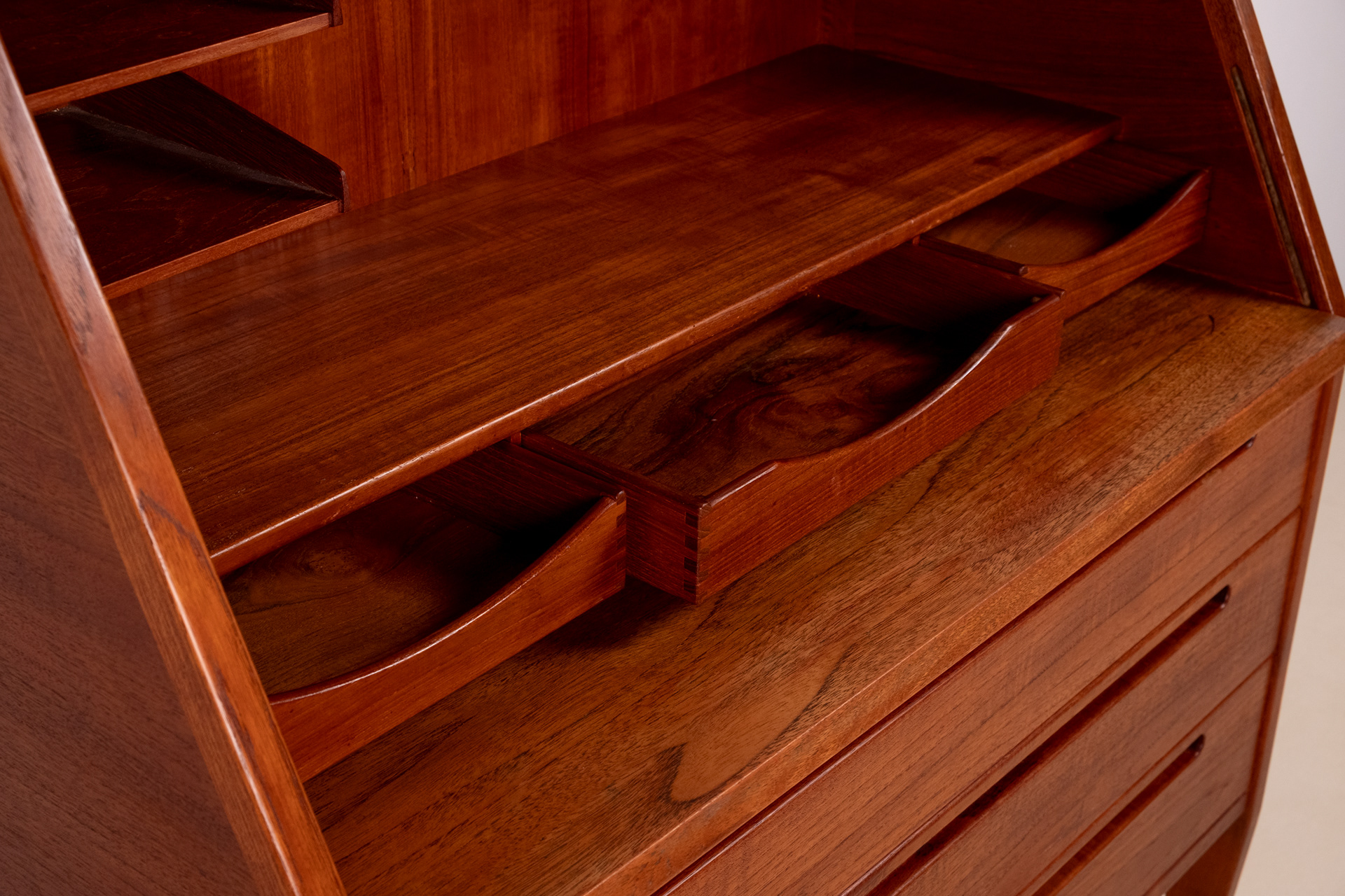A refined example of mid-century Danish design, this Model 63 secretary desk was designed by Kai Kristiansen for Tørring Møbelfabrik in the 1960s. Crafted from warm teak, the piece showcases Kristiansen's signature balance of clean lines and sculptural details. The drop-front writing surface reveals a thoughtfully arranged interior with small drawers and compartments, offering both practical storage and visual harmony. The secretaire is in good vintage condition with signs of use normal for its age. The exterior is truly lovely; one note concerns some indentations on the left side of the top drawer. Inside, the main signs of use are on the writing surface. See the photos for details of these marks to get an impression.