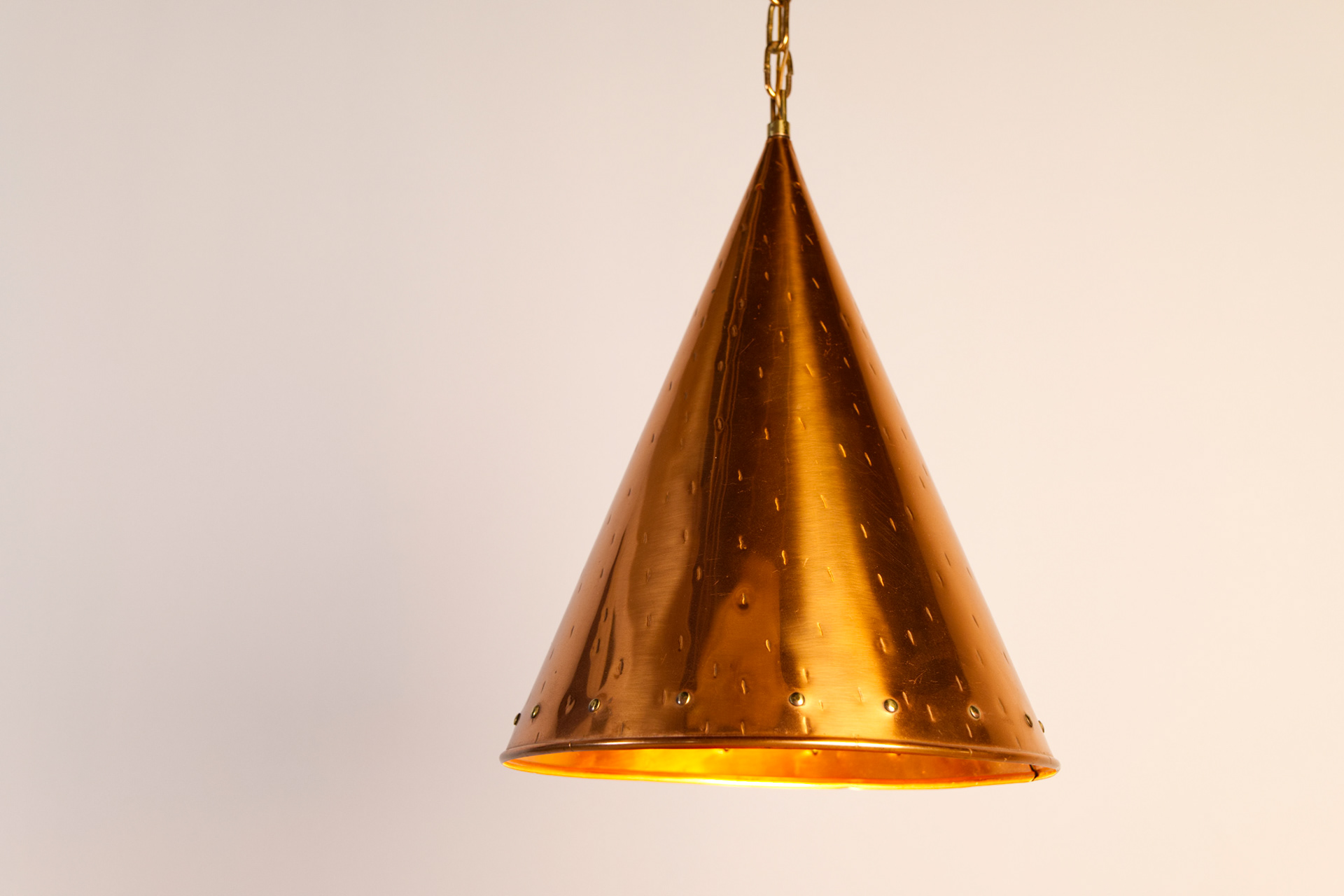 This striking mid-century pendant lamp from Th. Valentiner, Copenhagen, features a minimalist conical design crafted in copper with subtle brass pin accents and hammered details. Marked with a 'Made in Denmark' sticker and stamped with a size '2'. it showcases a combination of authentic Scandinavian craftsmanship and elegant danish design from the 1960s. In good vintage condition, the lamp retains its full original setup—including the copper canopy, long copper colored chain, and single E27 socket. It has a beautiful patina with only minor signs of age and scratches, adding to its timeless character. The extra-long cord and chain offer flexible hanging options and can be adjusted to fit your space.