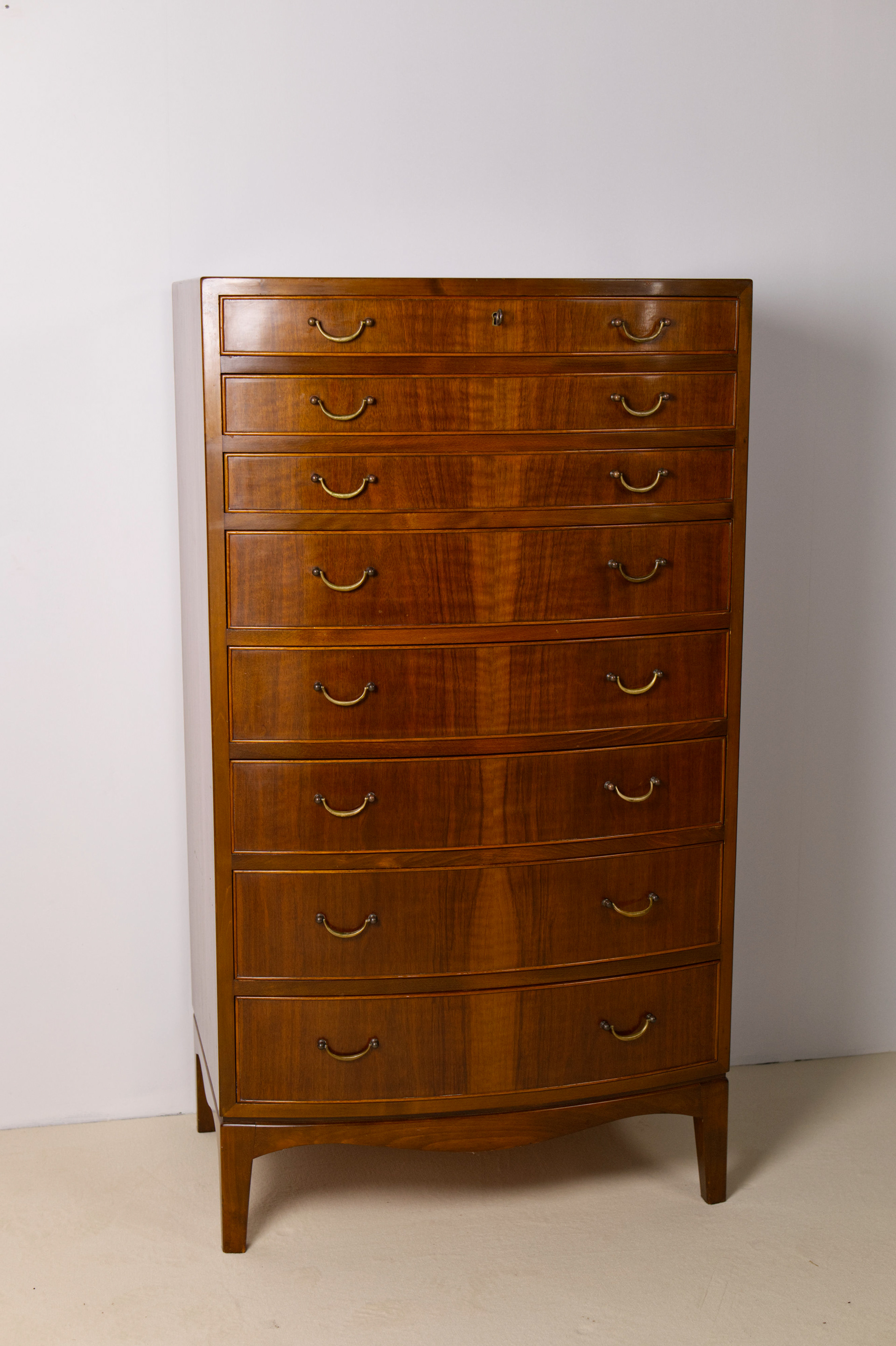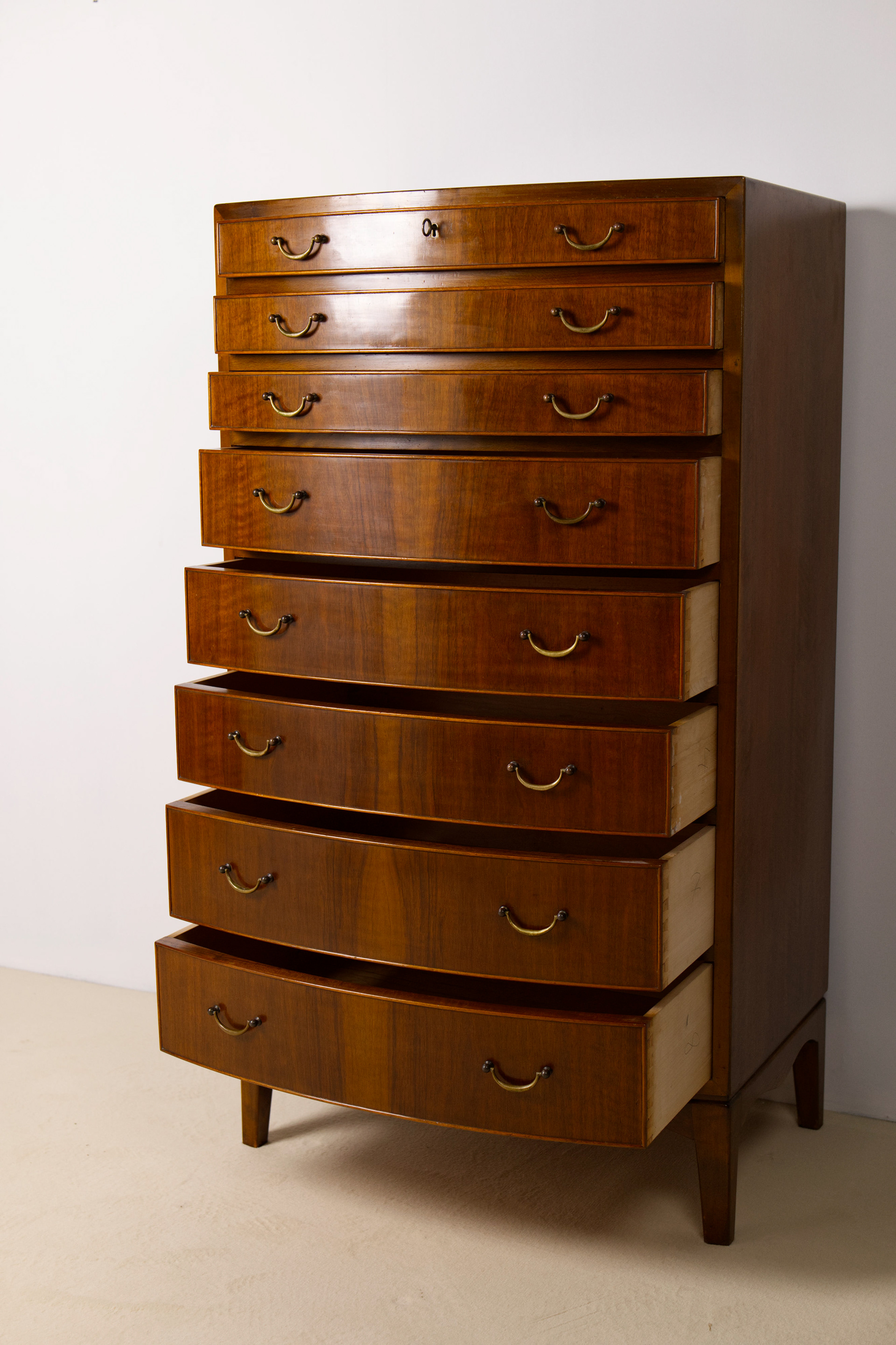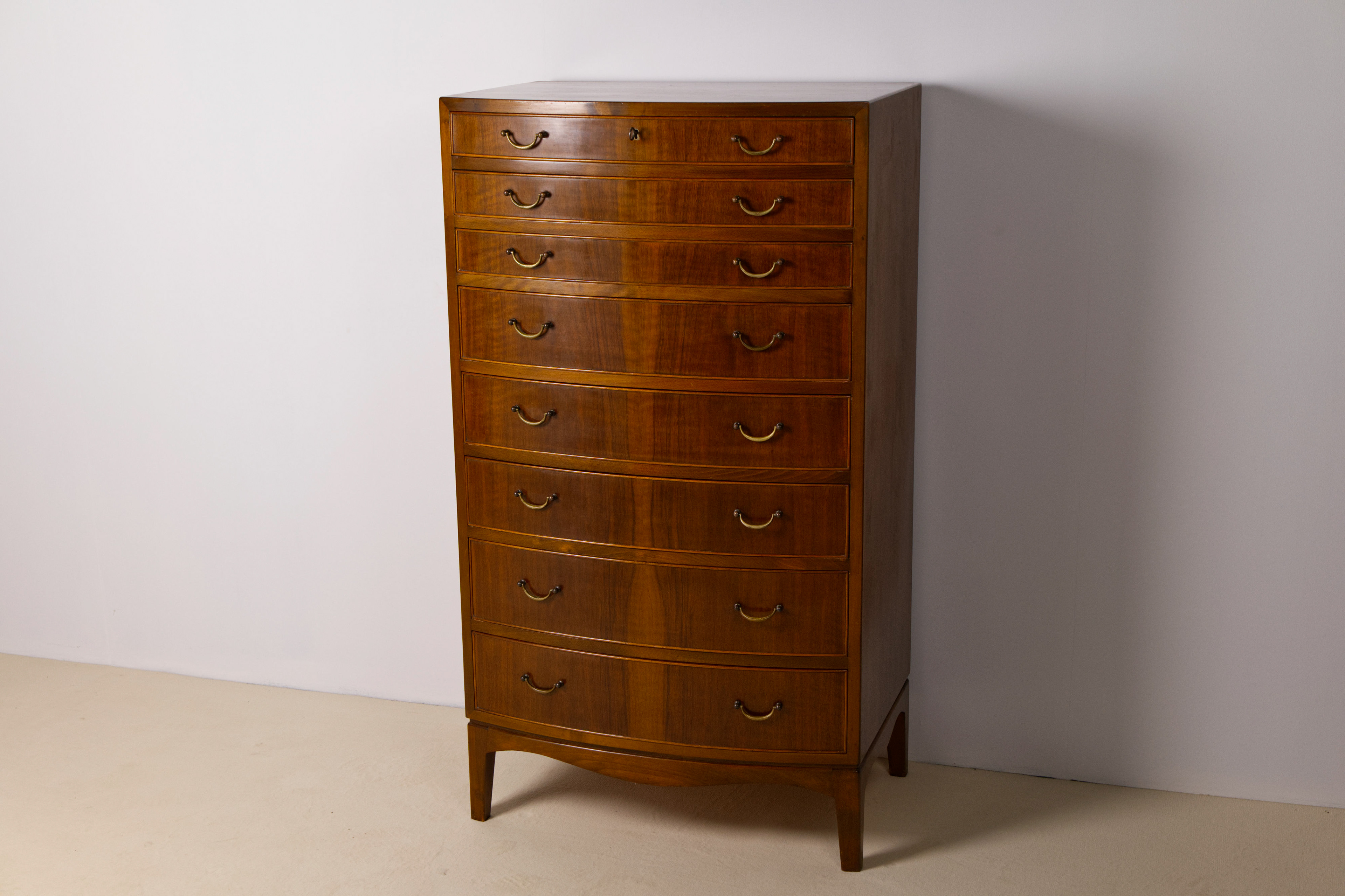 Elegant and large chest of drawers designed by Ole Wanscher for furniture maker A.J Iversen in Denmark. The chest of drawers features eight drawers in three graduated heights, all veneered in beautifully stained walnut and fitted with original brass handles. The drawers are curved and have beautiful rounded frames. The interior is made of beech wood.