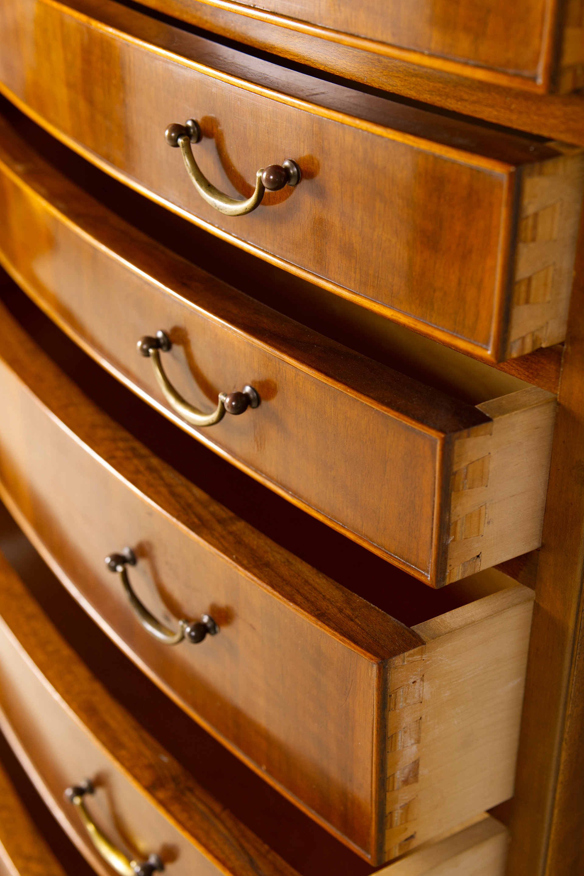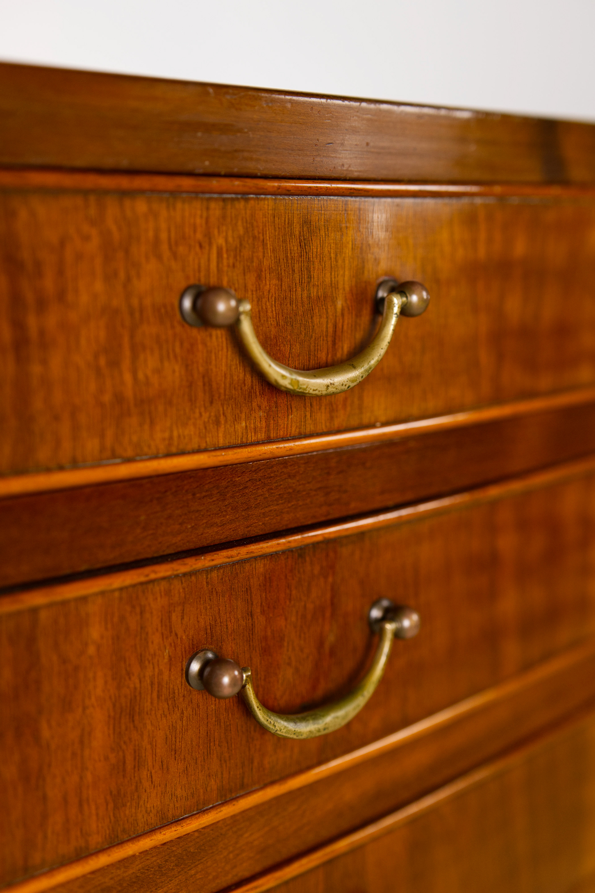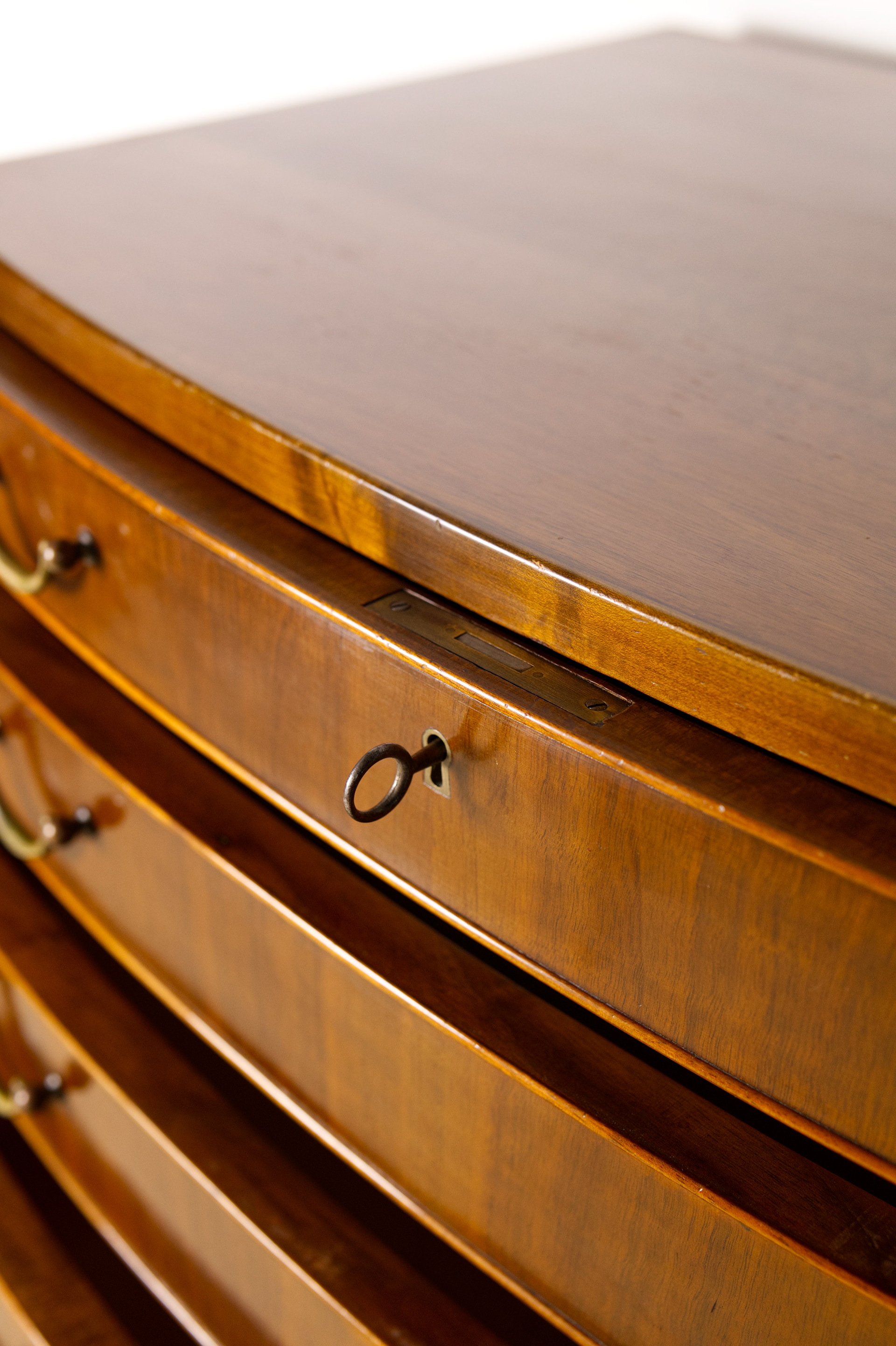 Elegant and large chest of drawers designed by Ole Wanscher for furniture maker A.J Iversen in Denmark. The chest of drawers features eight drawers in three graduated heights, all veneered in beautifully stained walnut and fitted with original brass handles. The drawers are curved and have beautiful rounded frames. The interior is made of beech wood.