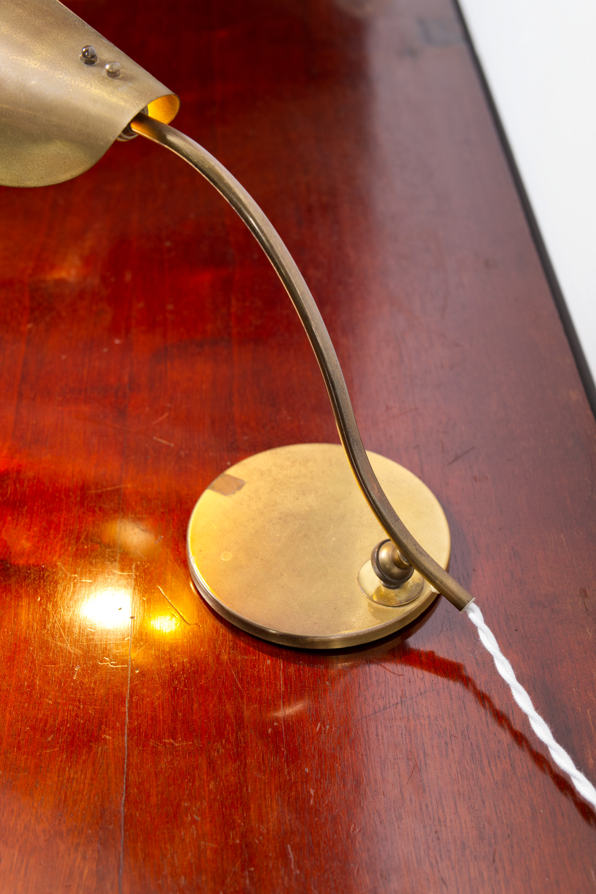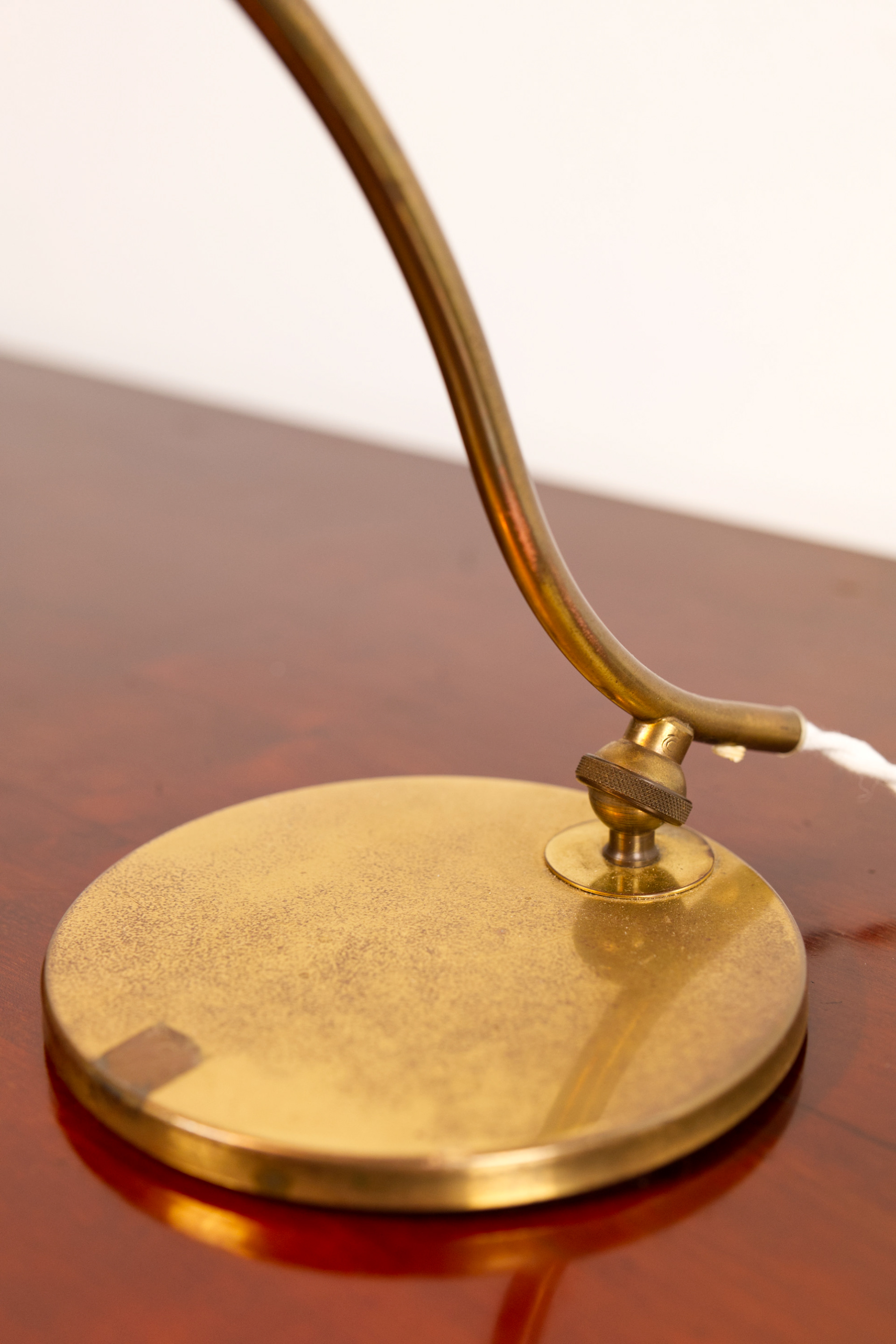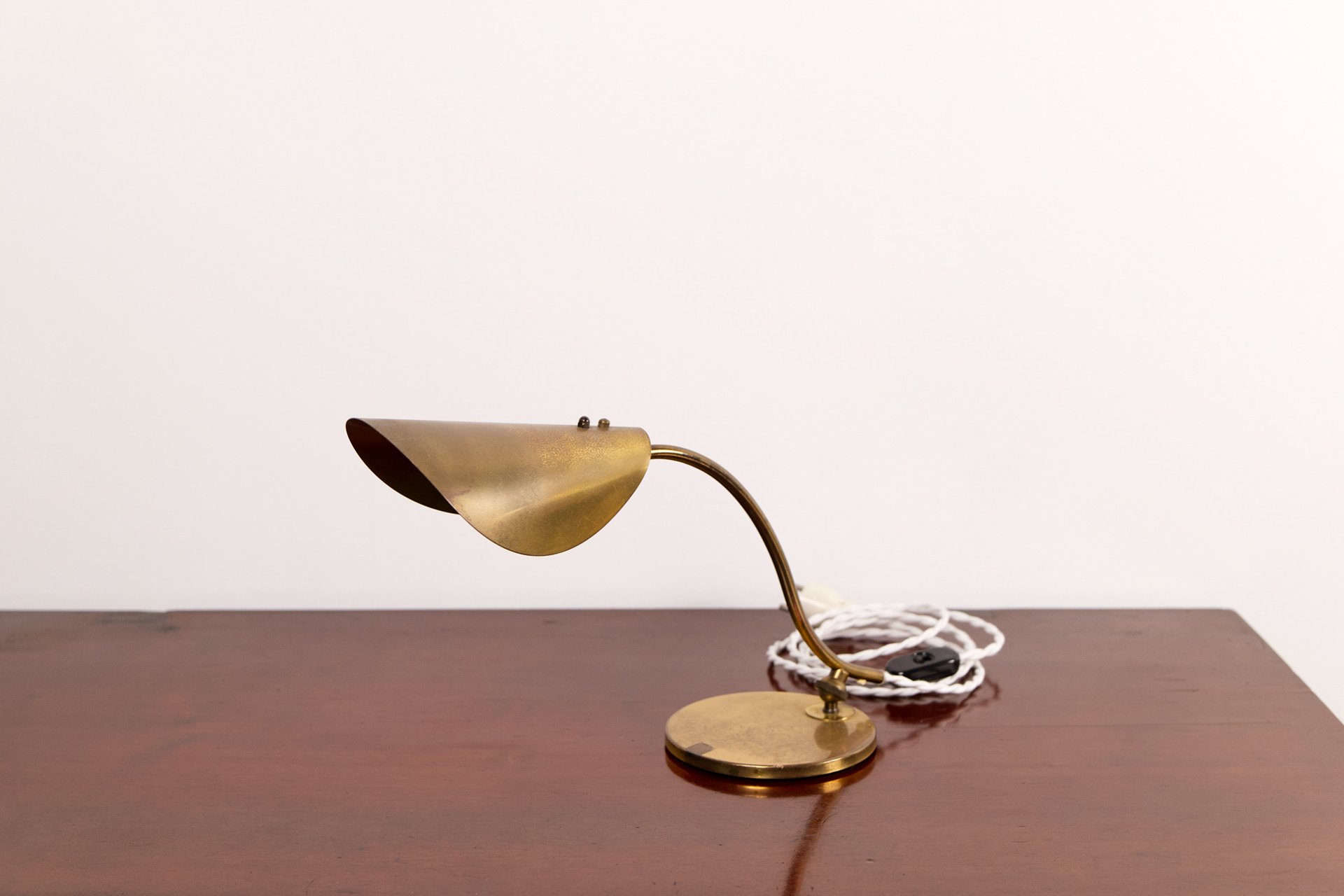 This mid-century Danish piano lamp features a beautifully sculpted, leaf-inspired brass shade and an adjustable arm, allowing you to direct light precisely where needed—perfect for use on a piano, desk, or sideboard. Its minimalist design is characteristic of Danish modernism, blending form and function with understated elegance. The brass surface has developed a warm, natural patina over time, adding vintage character. There is minor cosmetic damage (from a old sticker), which has patinated the lamp in that area. In good vintage condition overall, with wear consistent with age. Lamp has been rewired and fitted with a new bakelite switch. A stylish and functional lighting piece that brings both charm and history to any interior.