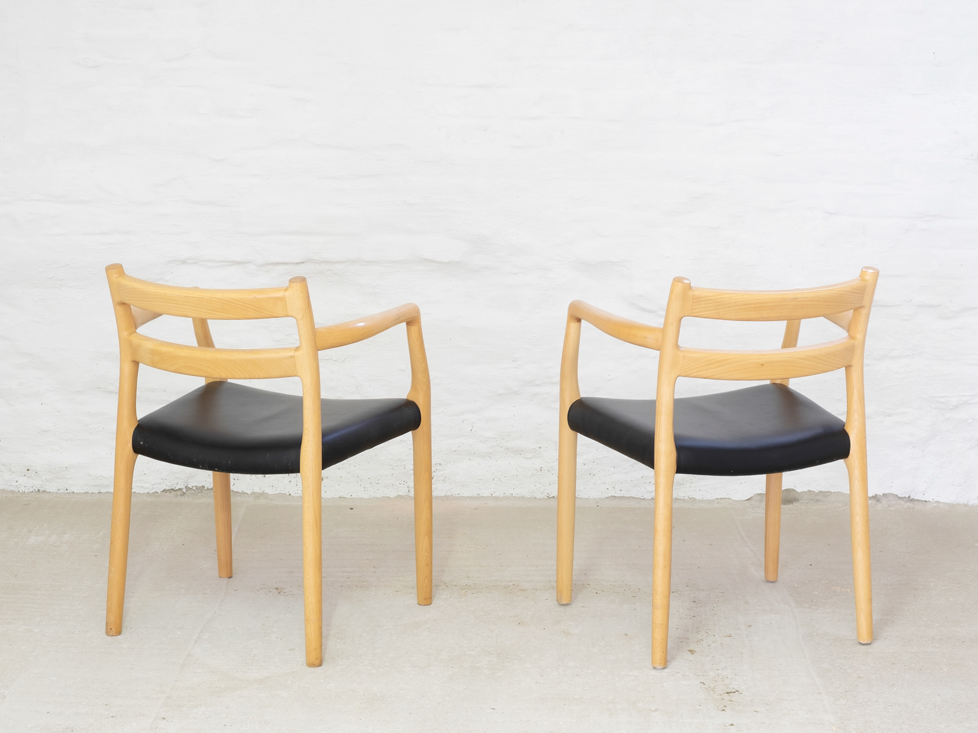 Niels O. Møller armchairs Model 67. Like almost all Møller chairs, these also have very organic and sculptural forms and astonishing joinery. Some usage related traces on the wood, mainly the legs. Seats are in good condition.