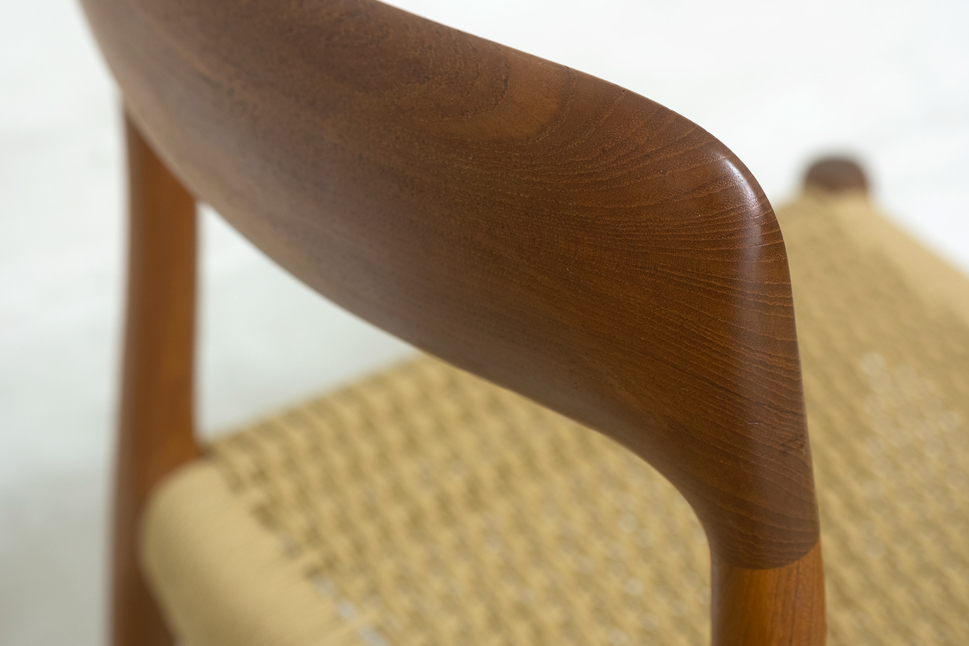Een zeer mooie set van 4 eetkamerstoelen van Niels Møller, Model 75 in teak. De stoelen zijn een gekende Deense klassieker van ontwerper en meubelmaker Niels Otto Møller. In mooie staat, lichte gebruikssporen naar de leeftijd. De stoelen zijn voorzien van nieuw papierkoord zodat ze nog vele jaren meekunnen.