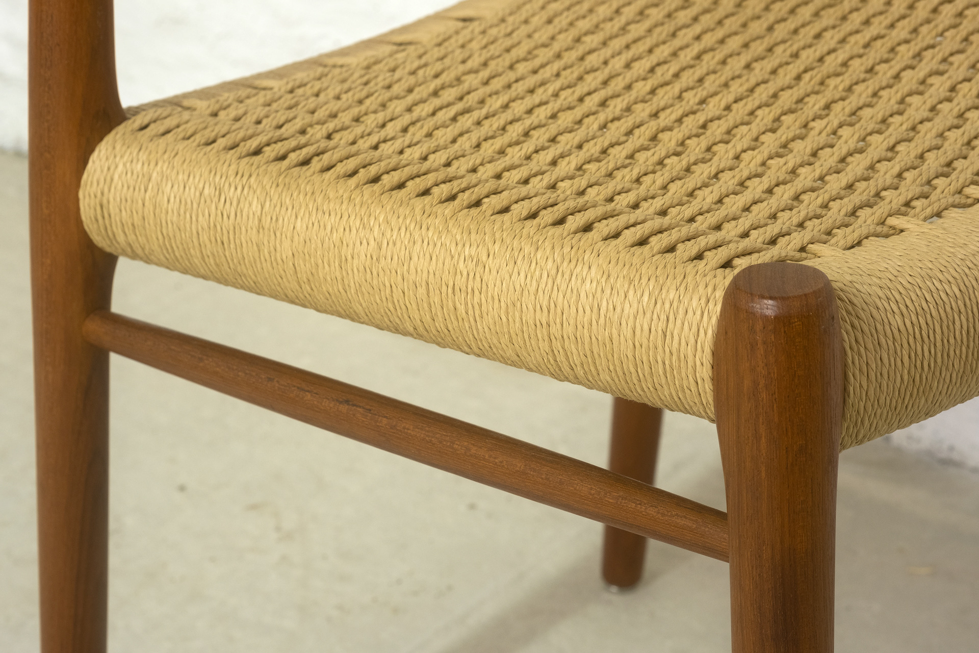 A beautiful set of 4 dining chairs by Niels Møller, Model 75 in teak. The chairs are a well known Danish classic by furniture designer and maker Niels Otto Møller. In good condition, , light signs of use according to the age , the seats have brand new papercord so they will last for many more years.