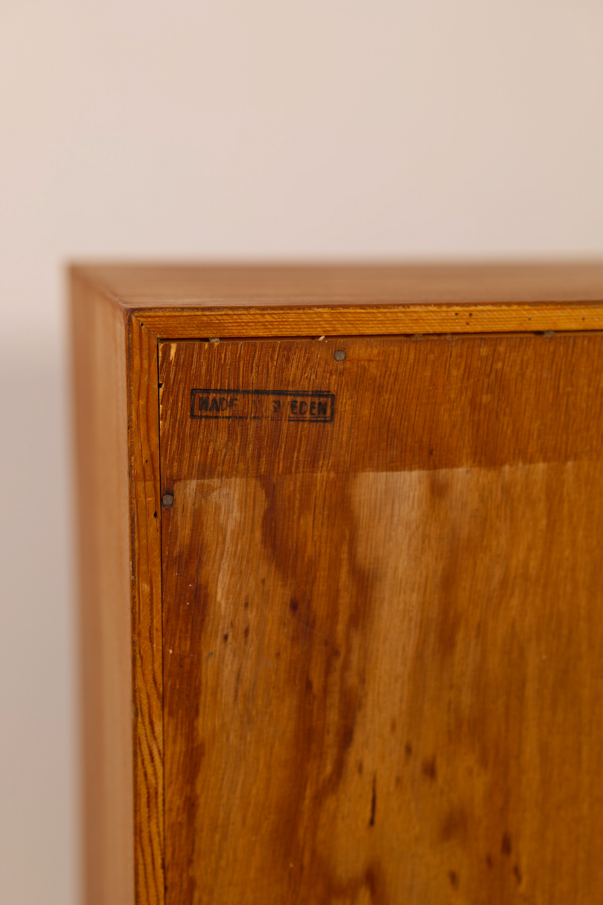 Oak and teak chest of drawers by Børge Mogensen for Karl Andersson & Söner, Sweden, Øresund Series, 1958. An elegant chest of drawers from the Øresund Series, designed by Børge Mogensen in 1958 for Karl Andersson & Söner. Executed in oak veneer with beautiful teak fronted drawers, the design showcases Mogensen’s refined functionalism with clean lines, harmonious proportions, and exceptional craftsmanship. This example comes with solid oak feet design with metal support rods. The warm oak grain emphasises the timeless Scandinavian character of the piece, making it a versatile addition to both modern and traditional interiors. The chest of drawers is in good original condition, with some small veneer repairs and a small chip on one solid teak handle. Fully refinished and restored. Marked 'made in Sweden'.