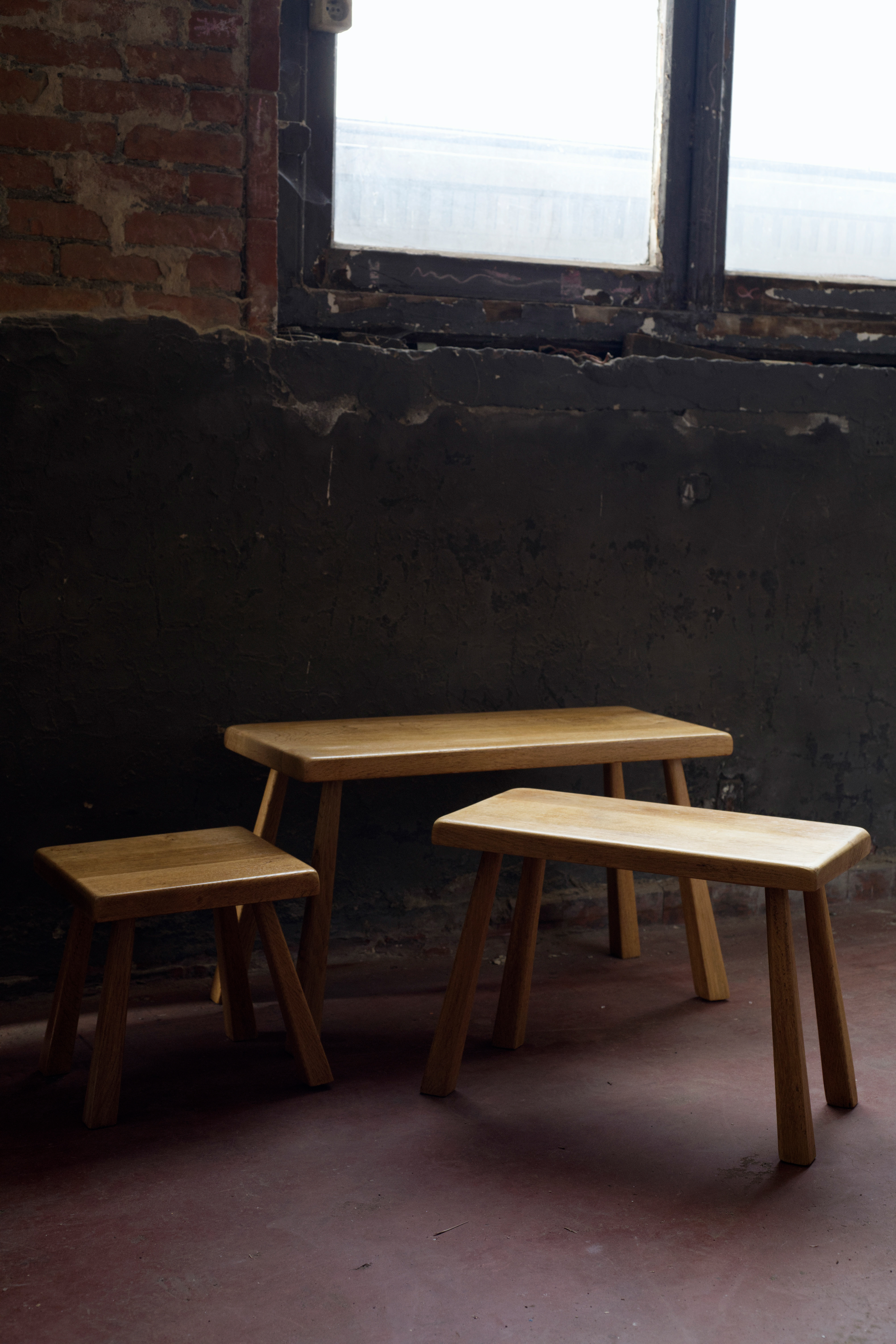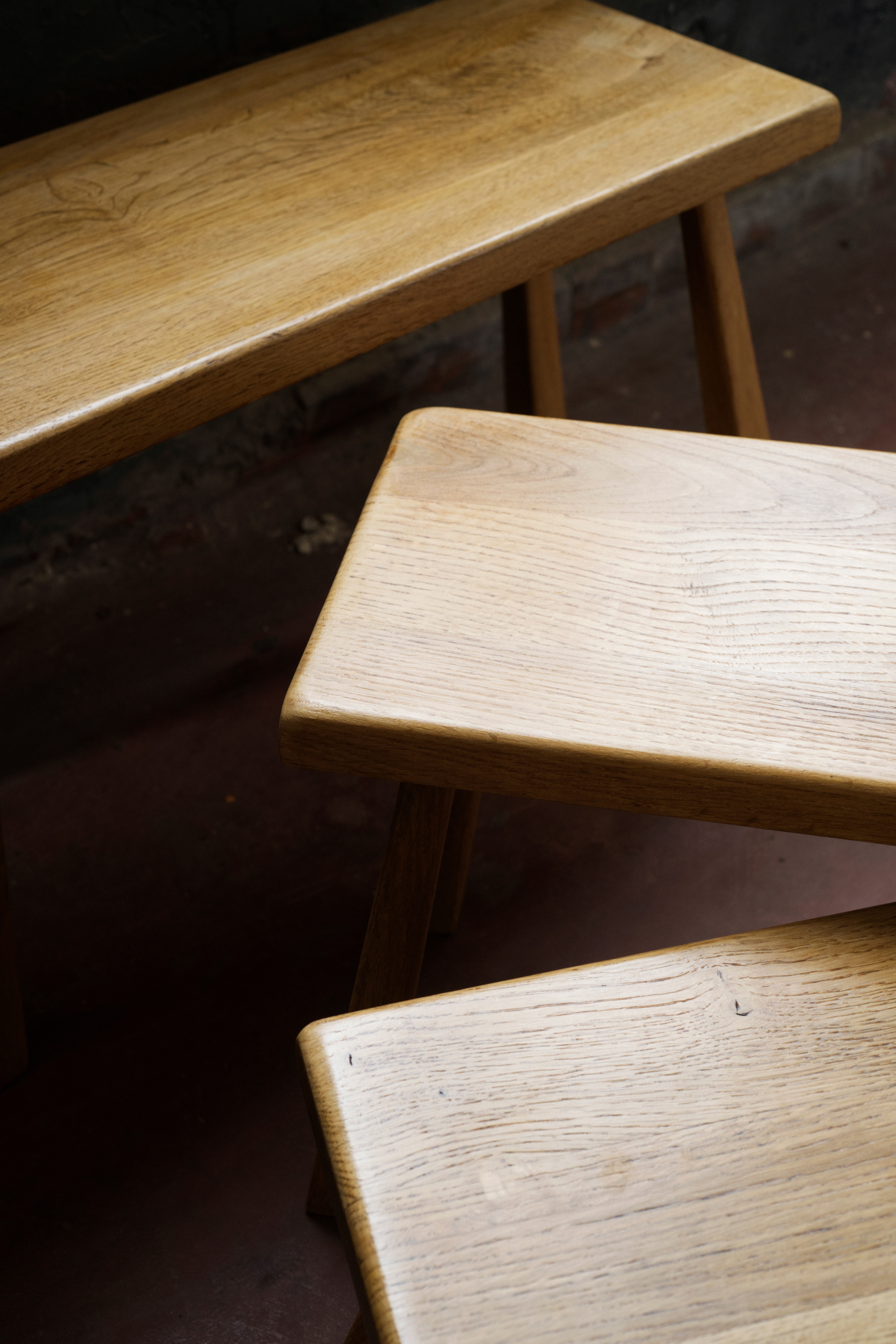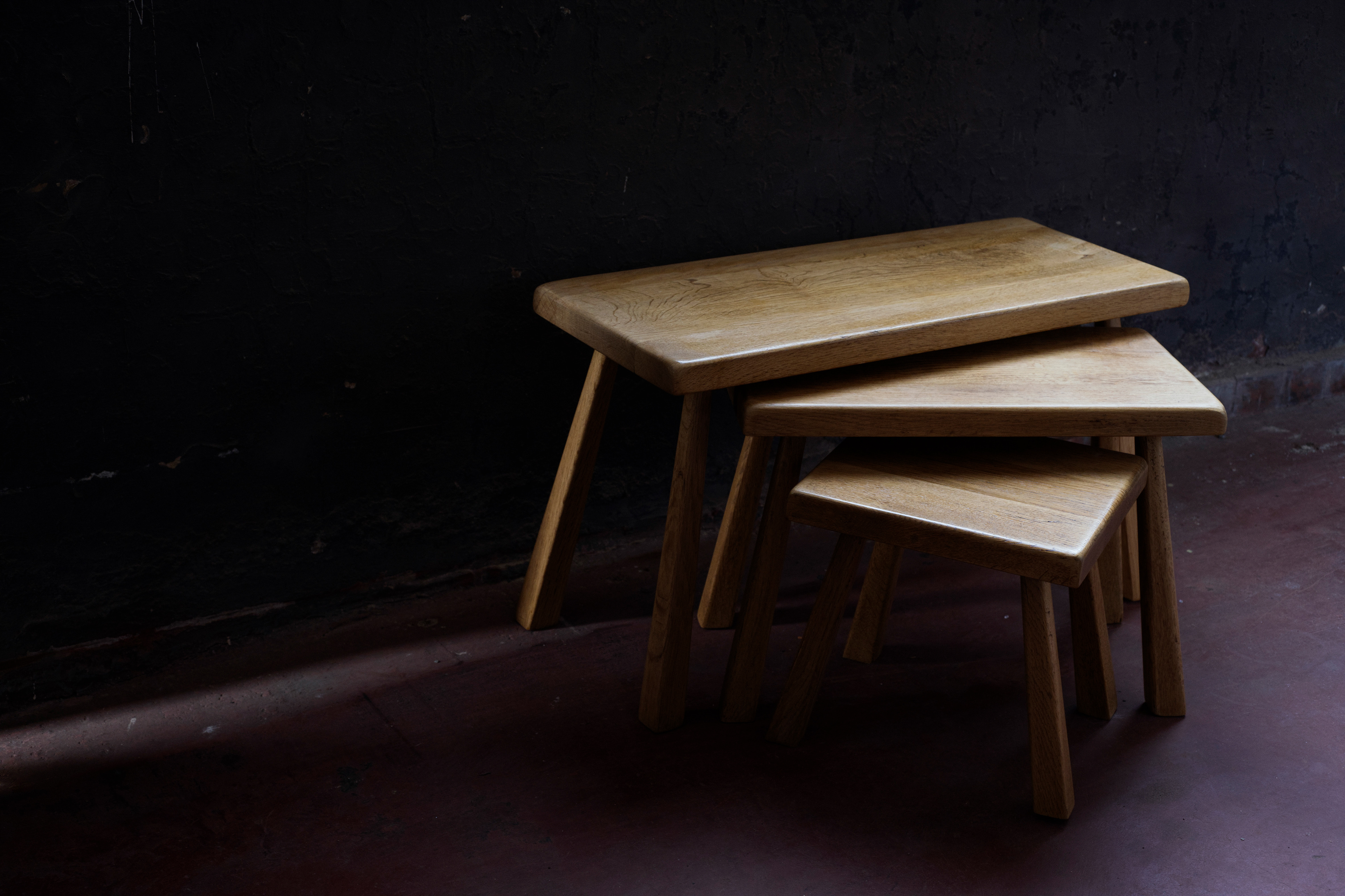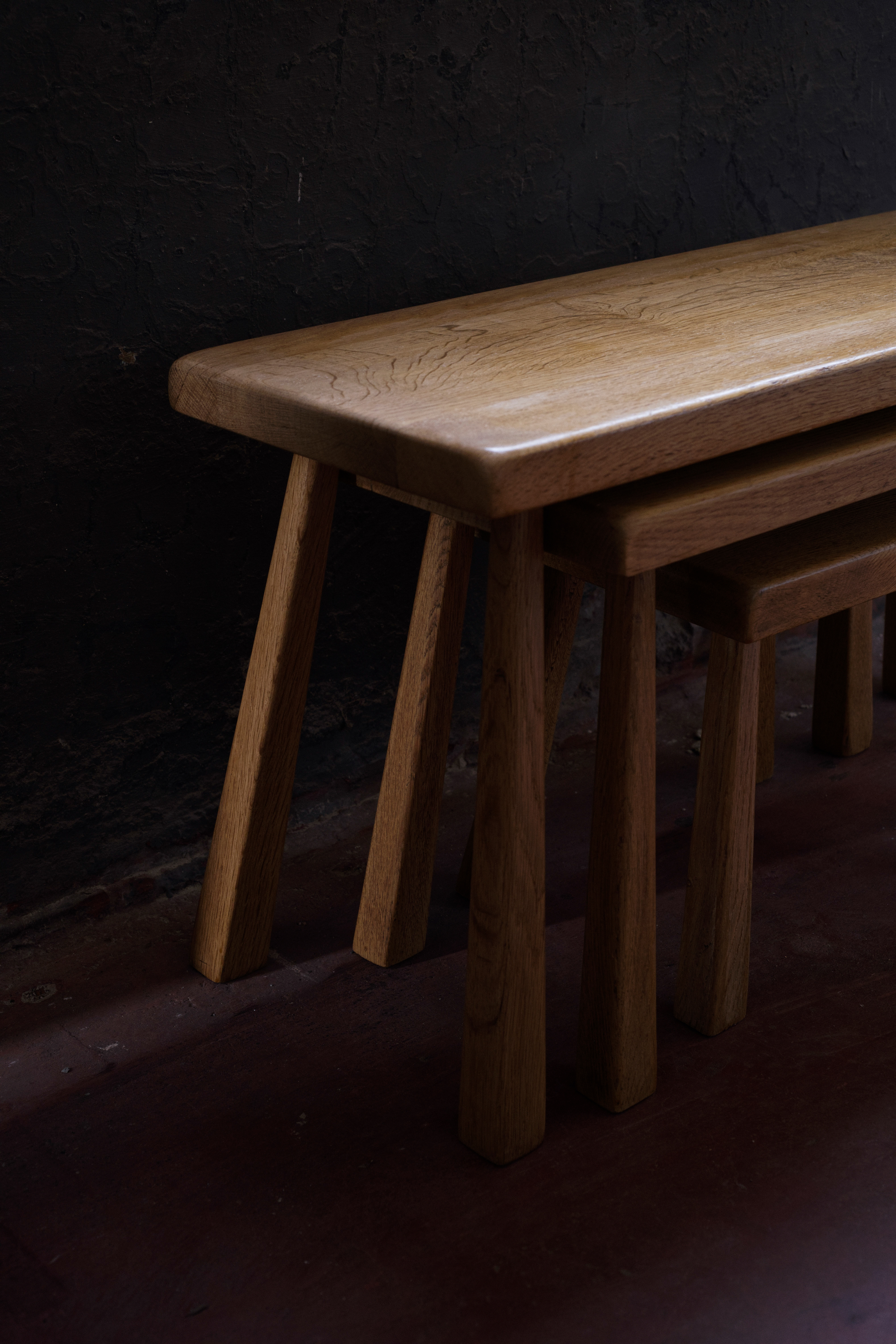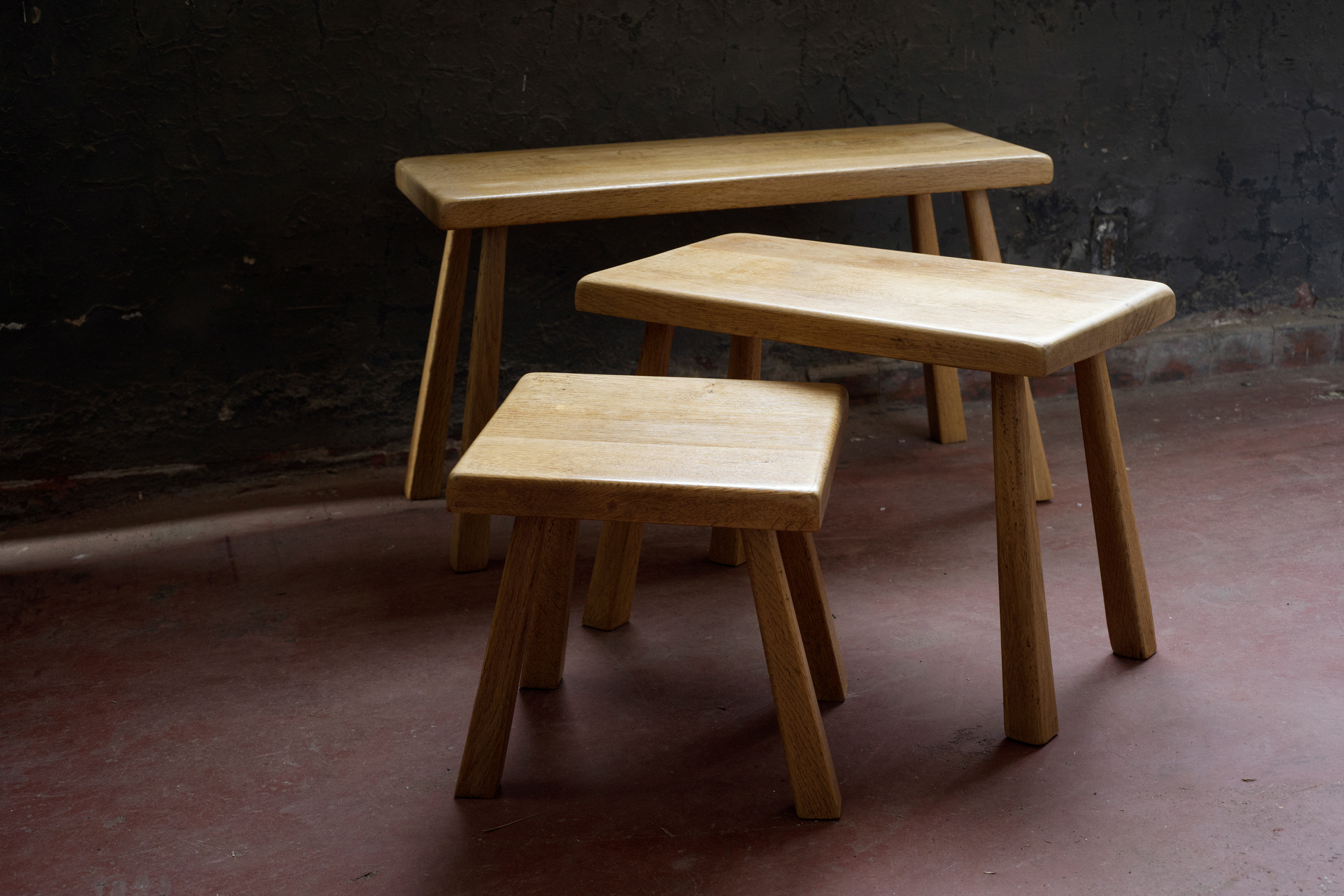 Beautiful set of three oak nesting tables with square tapered legs with a natural finish, 1960's. In good condition, light signs of use according to the age. HxWxD (big to small table): 41x70x30cm, 36.5x50x26.5cm, 30x30x27cm