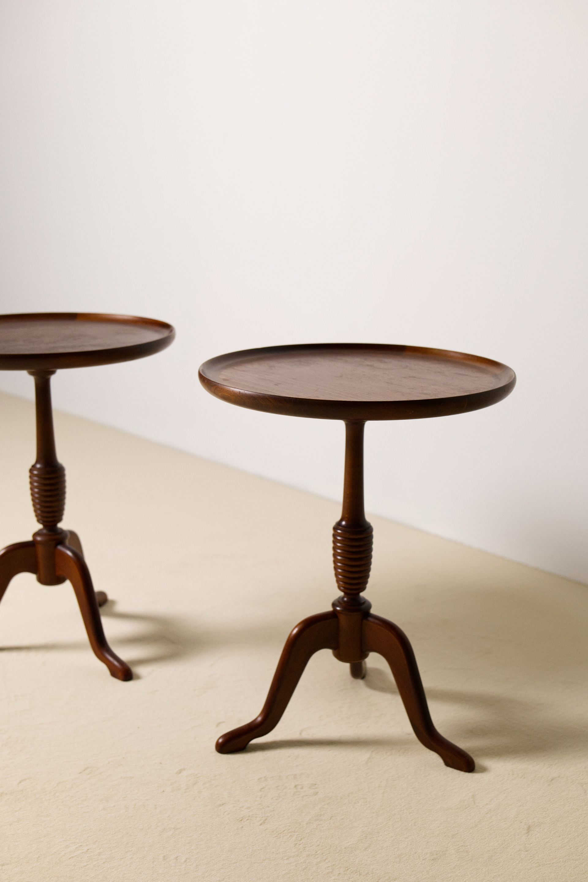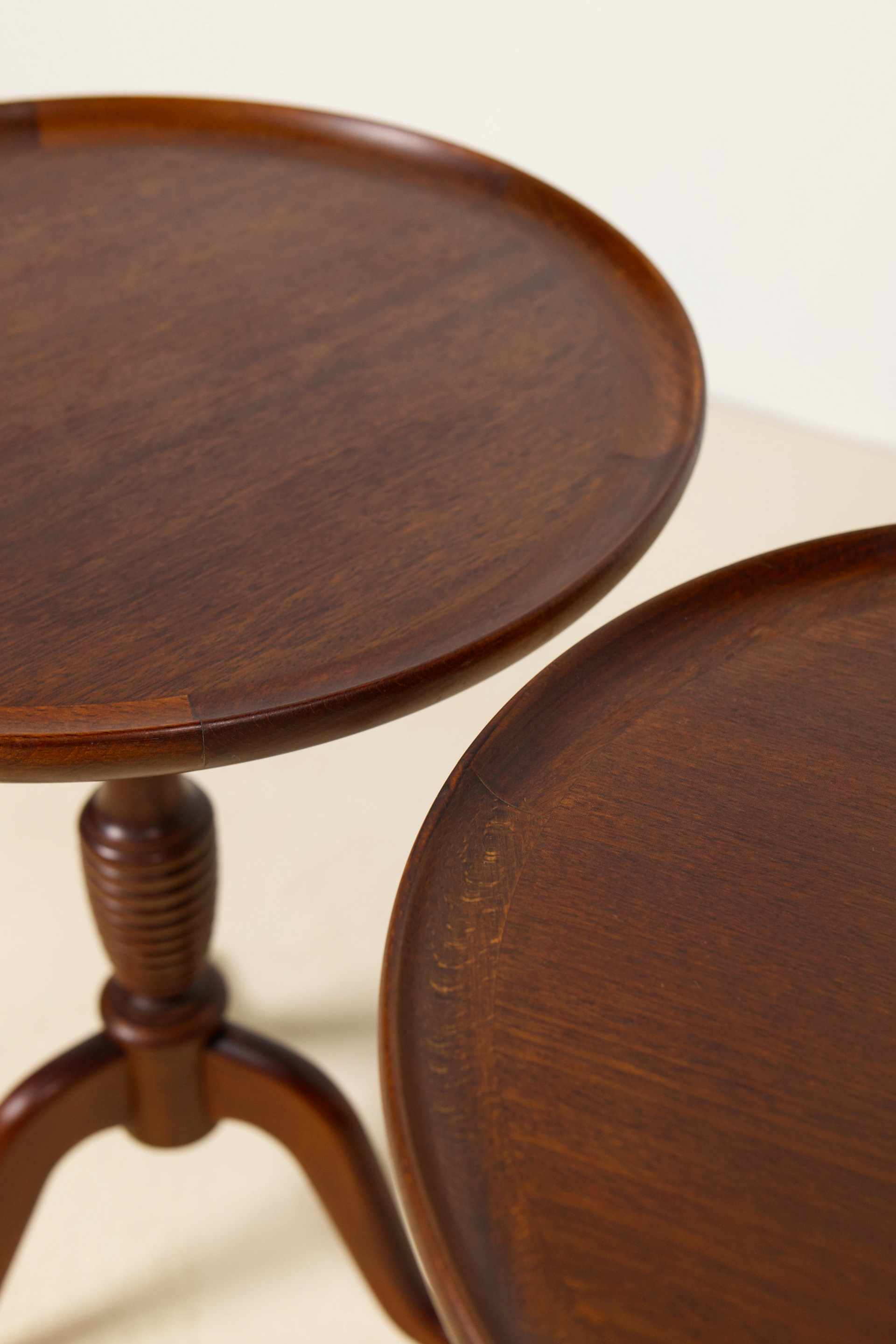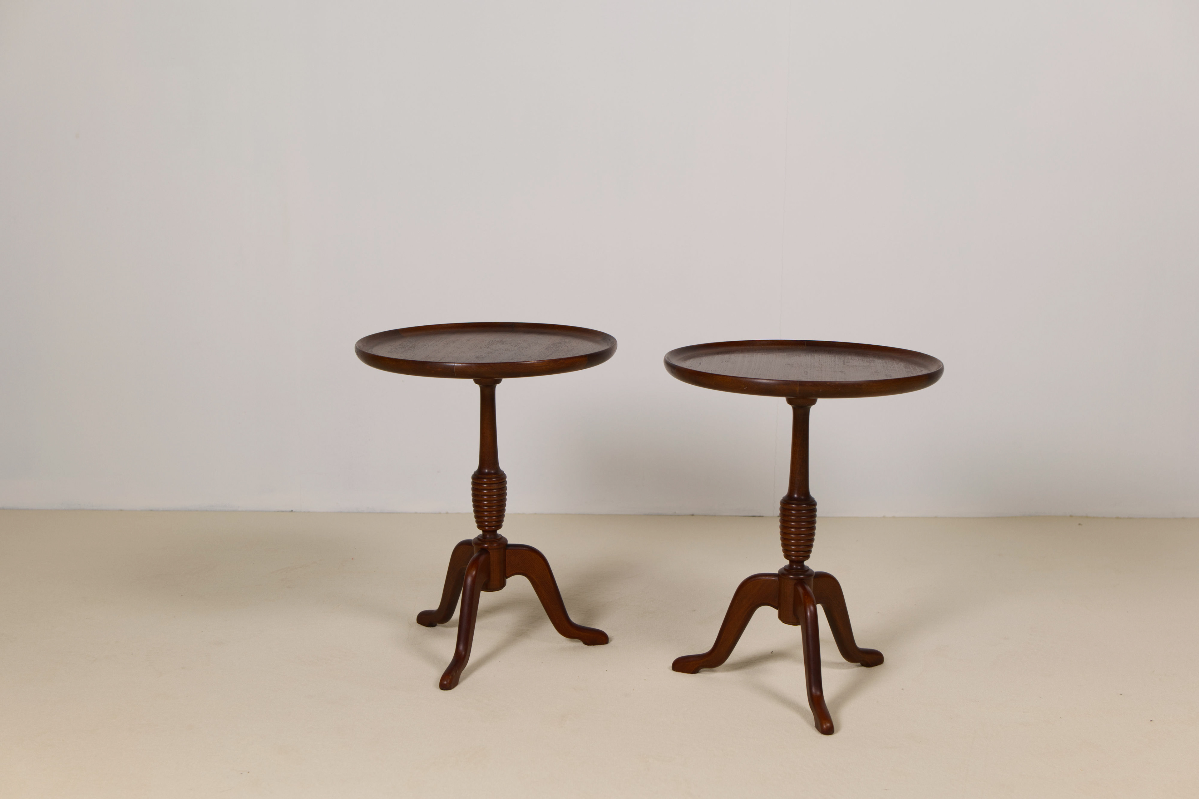 A elegant pair of mahogany side tables 'model 210' made by Anton Kildeberg. Different version of this table were made during the 50s, 60s and 70s. Made from a solid beech turned base with an unscrew-able top with mahogany veneer. A simple and timeless design. A good compact sized side table that can be used in a lot of different interiors. Due its timeless design fitting with danish classical and modern design aesthetics.