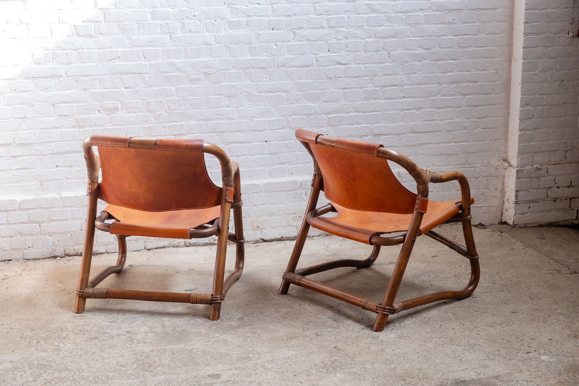 The wide, low frames and elegantly sloped backs invite relaxation, while the saddle leather seats and backs add a sophisticated, rustic contrast, showcasing a beautiful patina that speaks to the quality and age of these timeless pieces. The bamboo framework accentuates the natural grain and complements the warm tones of the leather, resulting in a harmonious blend of materials that speaks to Danish design’s reverence for natural beauty and craftsmanship.