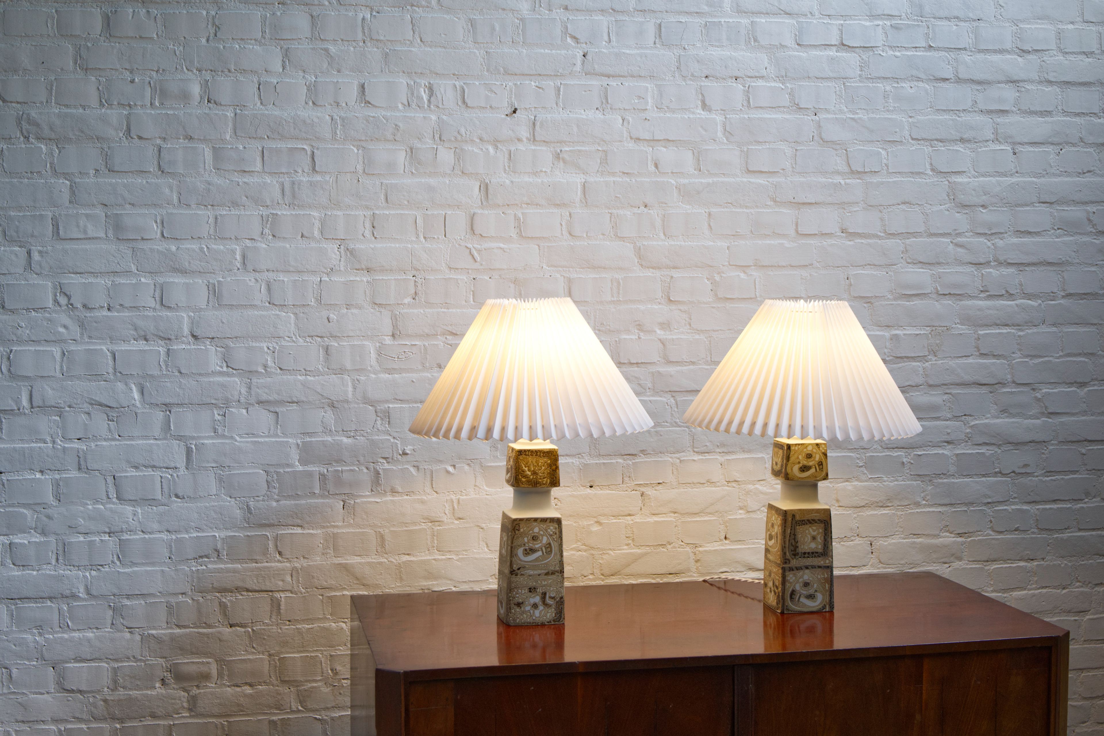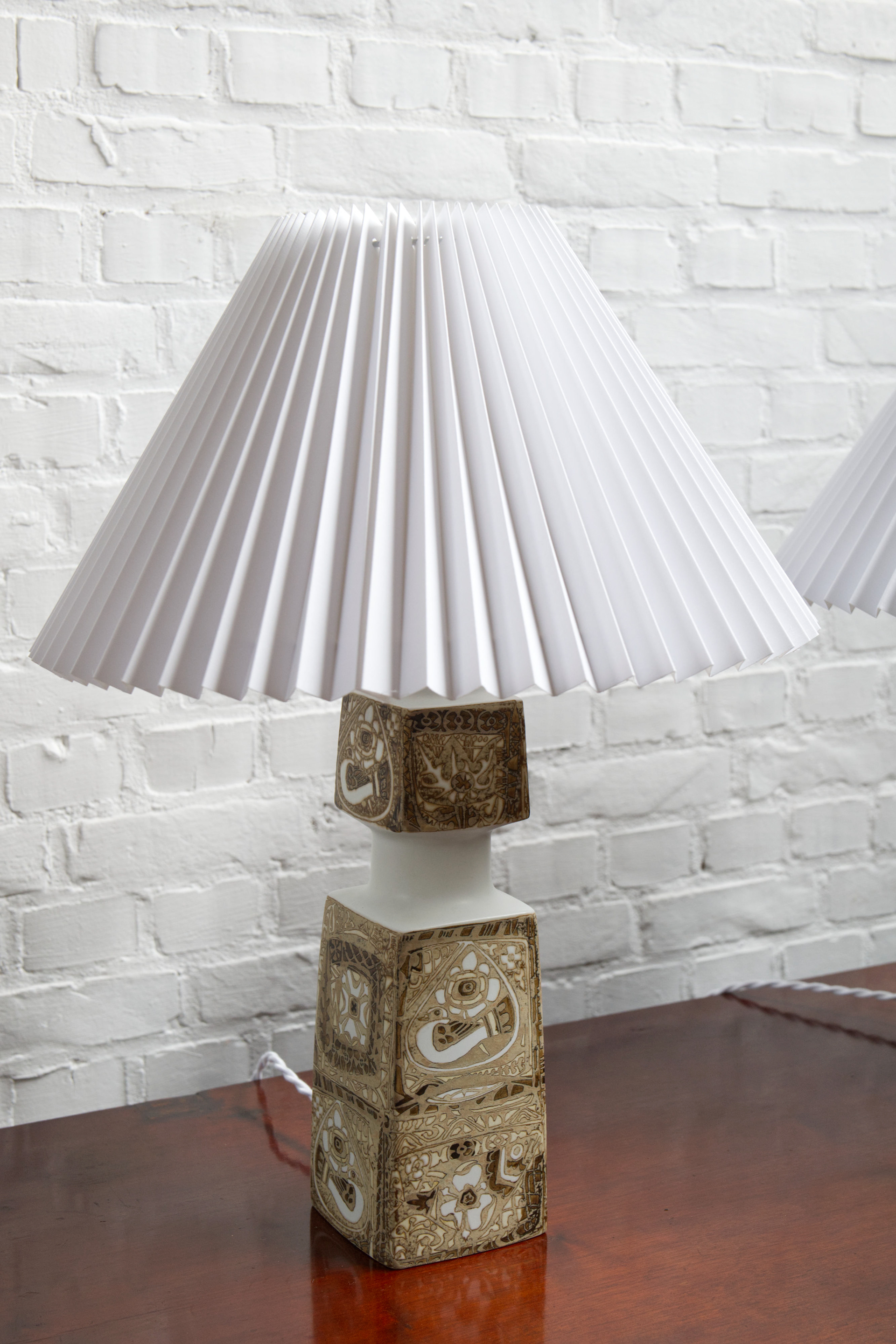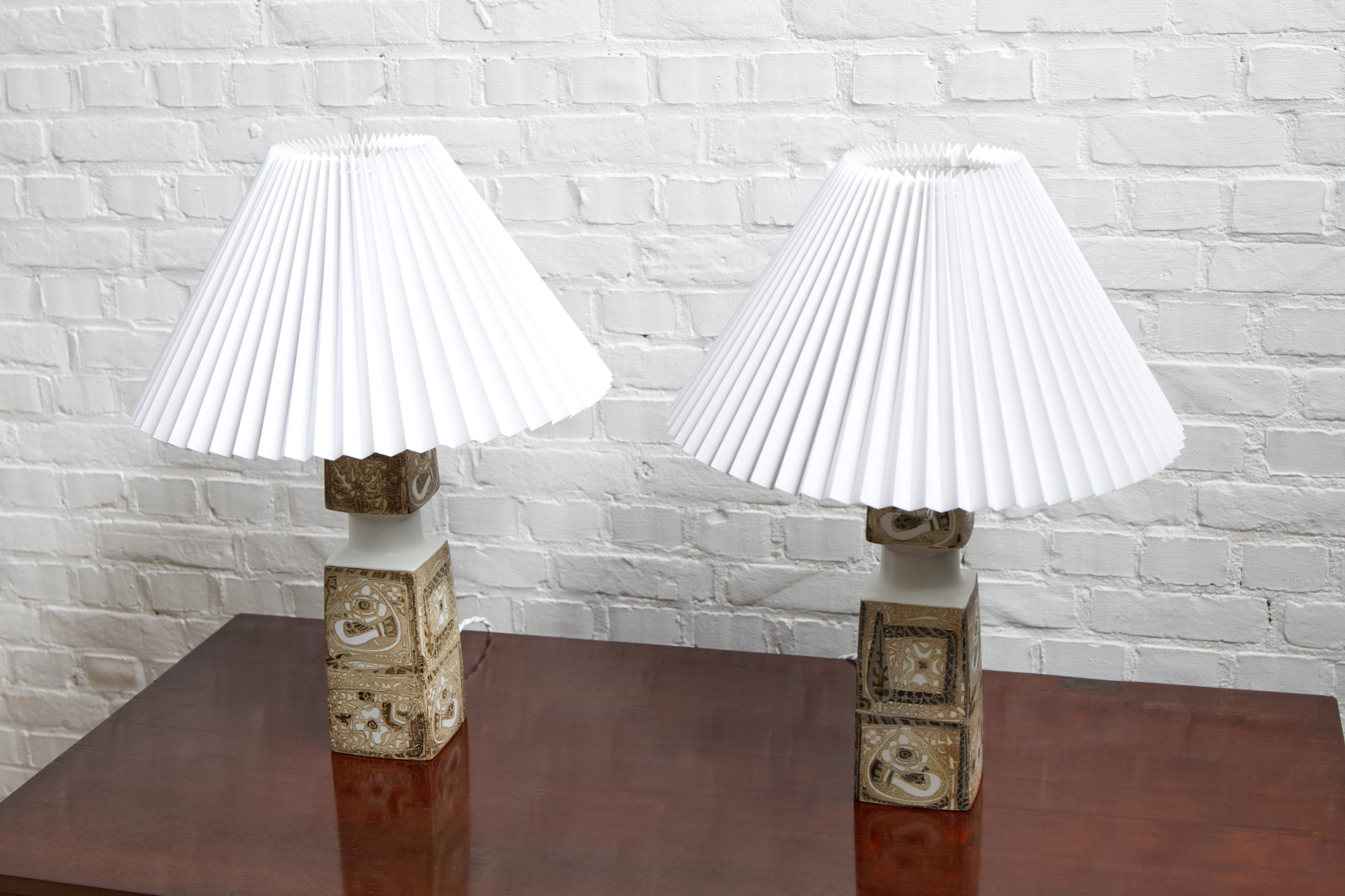 This rare pair of Baca series table lamps was designed by Nils Thorsson for Royal Copenhagen in the 1960s, showcasing his distinctive artistic style and mastery of ceramic glazing. Each lamp features intricate, abstract patterns in earthy tones. Crafted in high-quality porcelain, the lamps are both sculptural and functional, embodying the refined elegance of Danish mid-century design. The bases are signed and numbered, confirming their authenticity and origin. In excellent vintage condition with original fittings with built in switches. Fitted with new fabric wiring and new plastic pleated lampshades. Sizes are including lampshades.