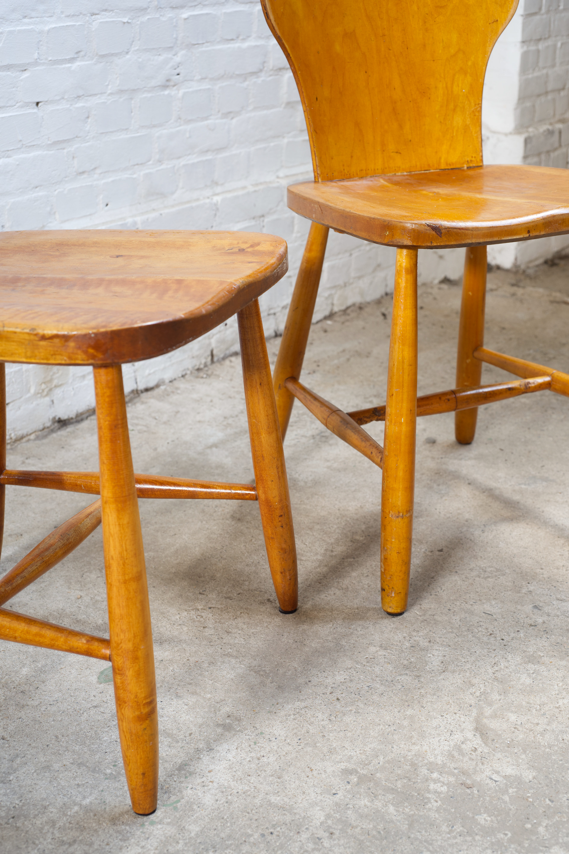 A pair of Swedish dining chairs from the 1950's. Made from pine with a beautiful bent plywood back with a handy cut-out. Handmade quality with slightly different details on the frame base.
