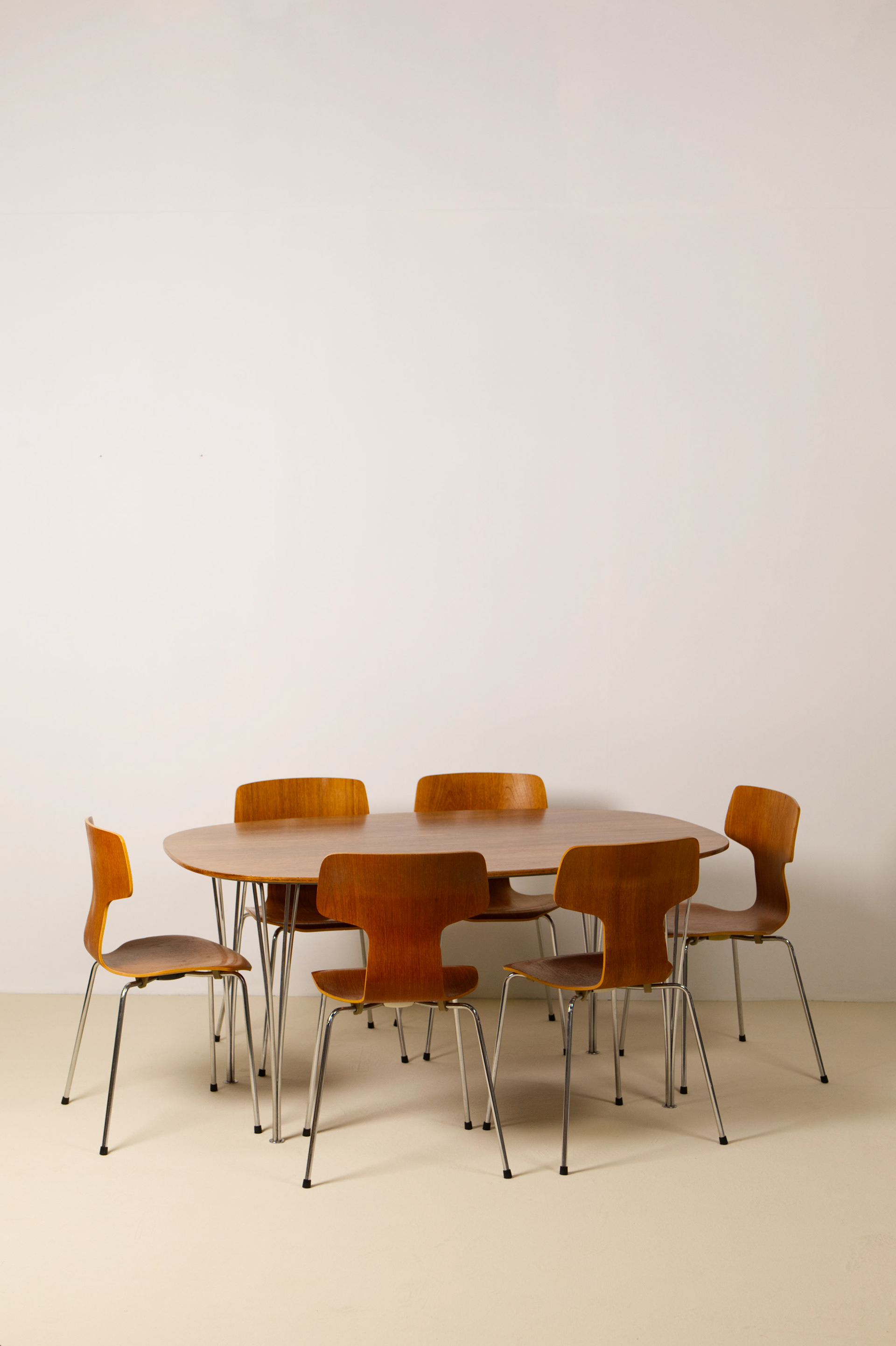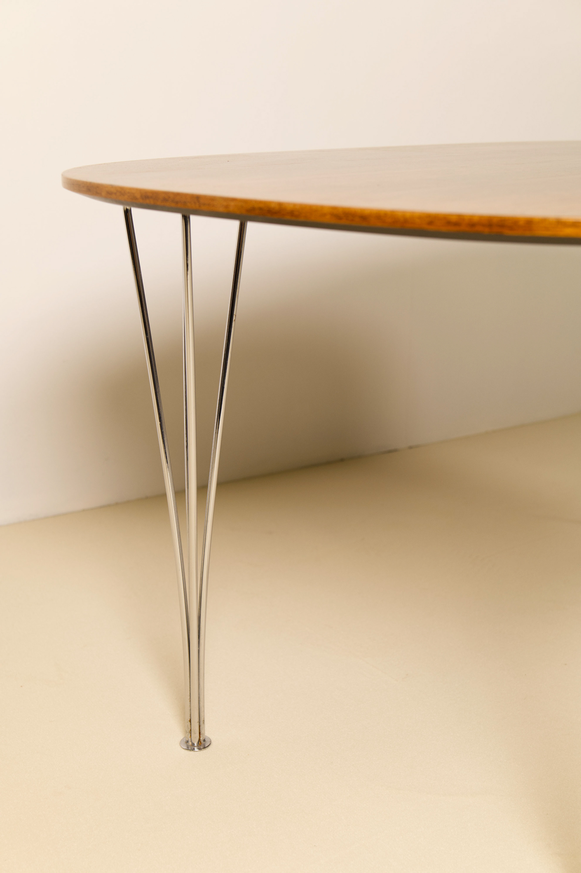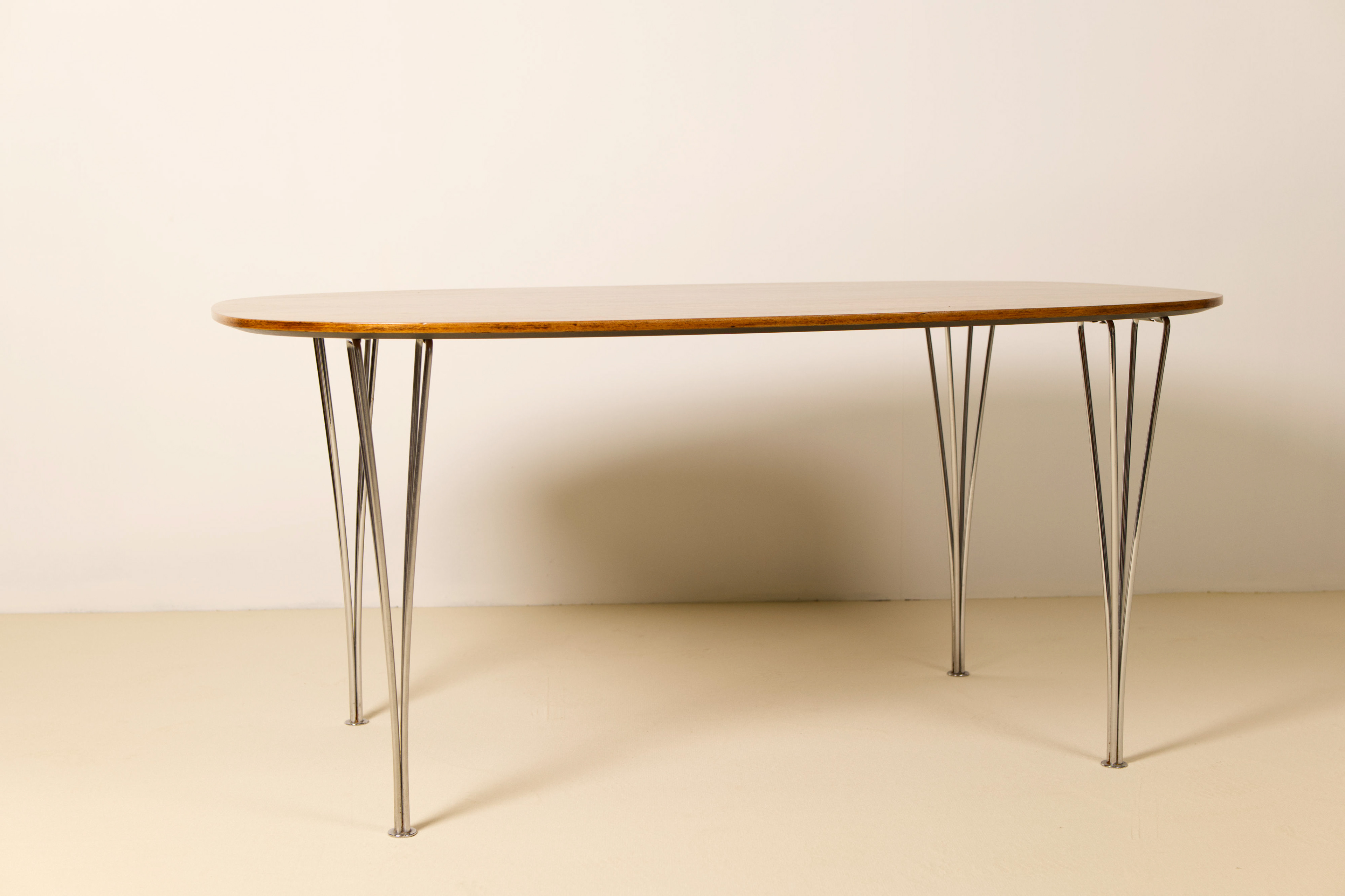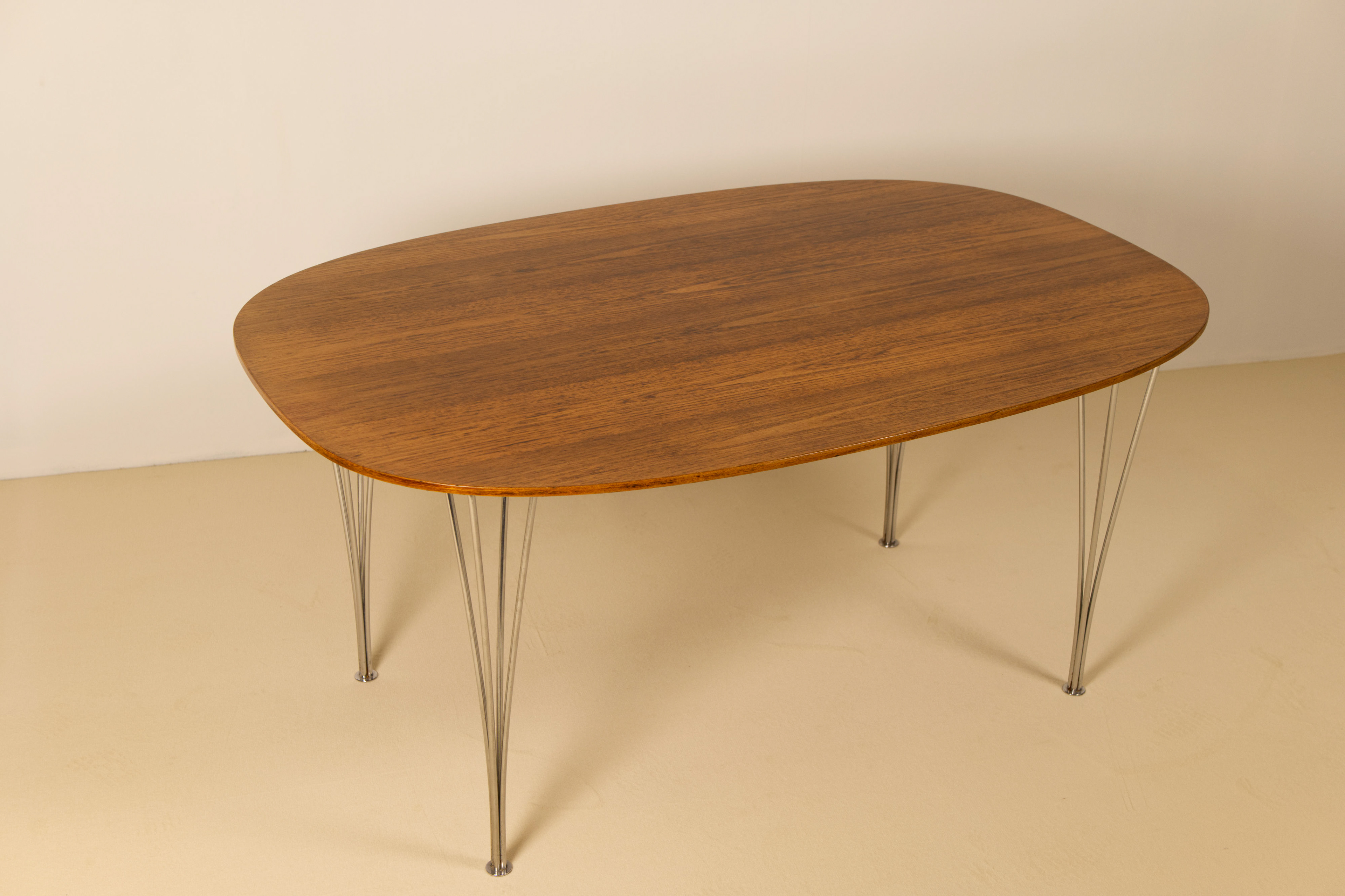 Superellipse dining table designed by Piet Hein and Bruno Mathsson for Fritz Hansen, produced in the 1970s. This version features a dark-stained wood veneer top with the signature rounded rectangular 'superellipse' shape — a form developed by Hein for optimal visual and functional balance. Supported by the classic span-leg base in chrome-plated steel, the table combines Scandinavian minimalism with a mathematically inspired design. Clean lines, generous proportions, and a durable construction make it suitable for both dining and workspace settings. Pictures with chairs show the table in an example setting with a set of Arne Jacobsen chairs. These are NOT included but are available separately. In good vintage condition with light signs of wear appropriate to age. Some scratches on the table top.