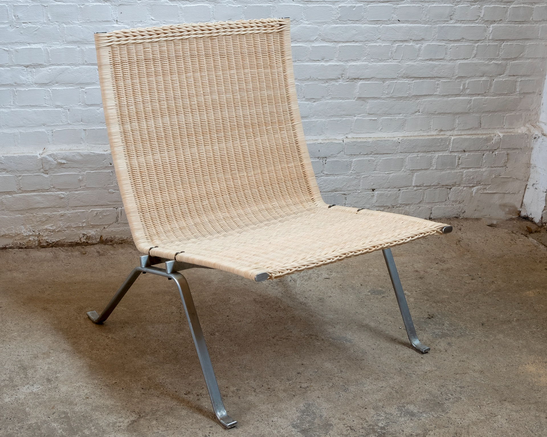 A beautiful PK22 lounge chair designed by Poul Kjærholm in 1956, produced by Fritz Hansen in 1991. The PK22 is an icon of Danish design and was actually designed by Kjærholm with Mies Van Der Rohe's Barcelona chair in mind, making a lightweight and refined version of this lounge chair. The PK22 is probably the most well-known design by Poul Kjærholm.