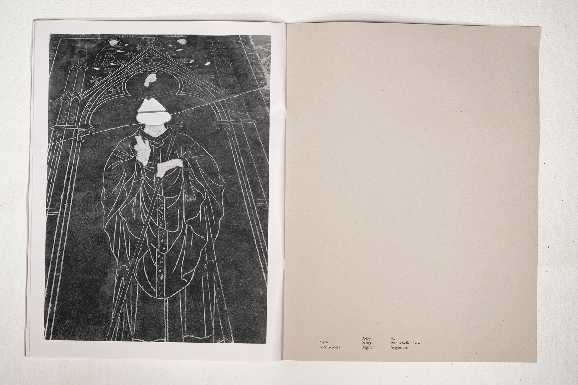 Crypte contains a series of photographs that deal with the gesture of carving/stabbing/cutting. The main body of images consist of wall surfaces which date back to the 11th century and show traces that were made over several time periods. The surfaces were initially photographed to retrace several layers of images, texts and symbols. As a tool to study this archaeological site, the crypt underneath The Saint Peter's Church in Leuven (Sint-Pieterskerk, Leuven).