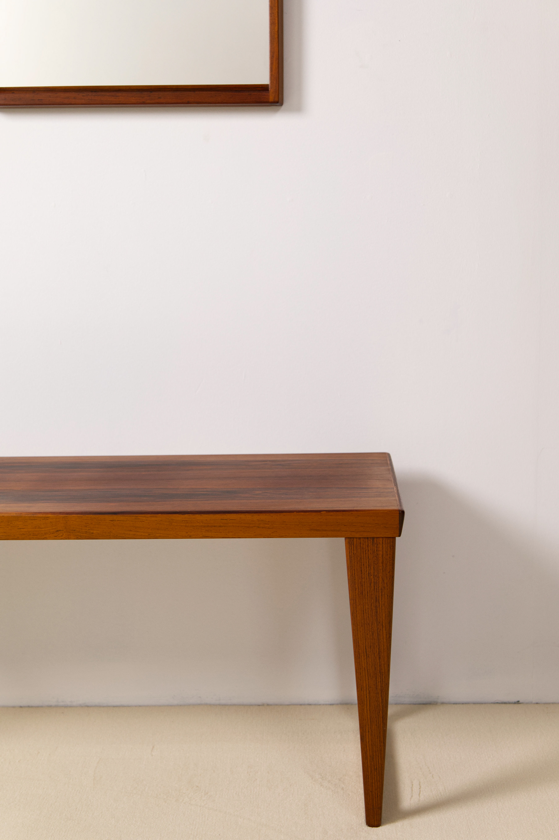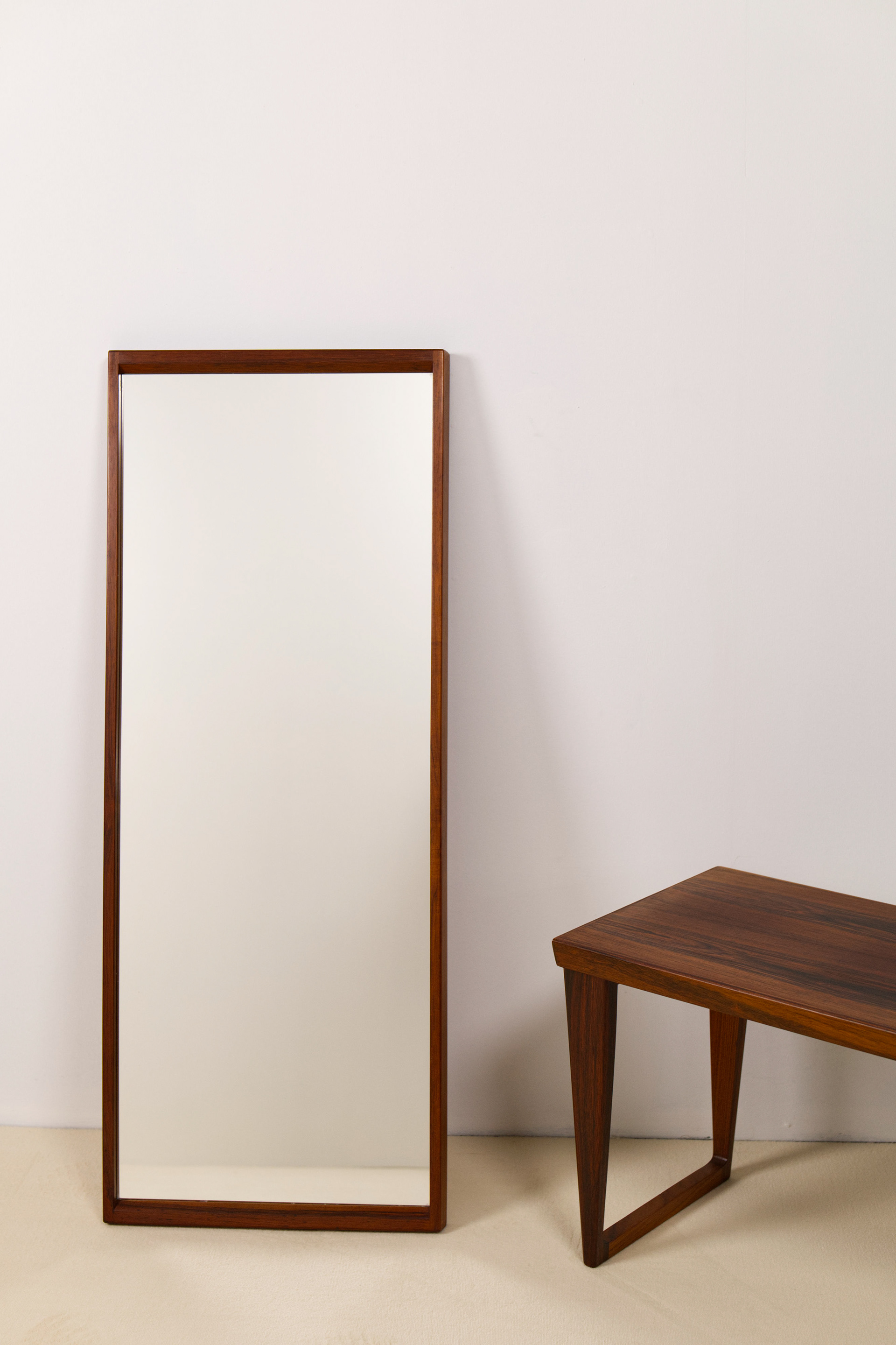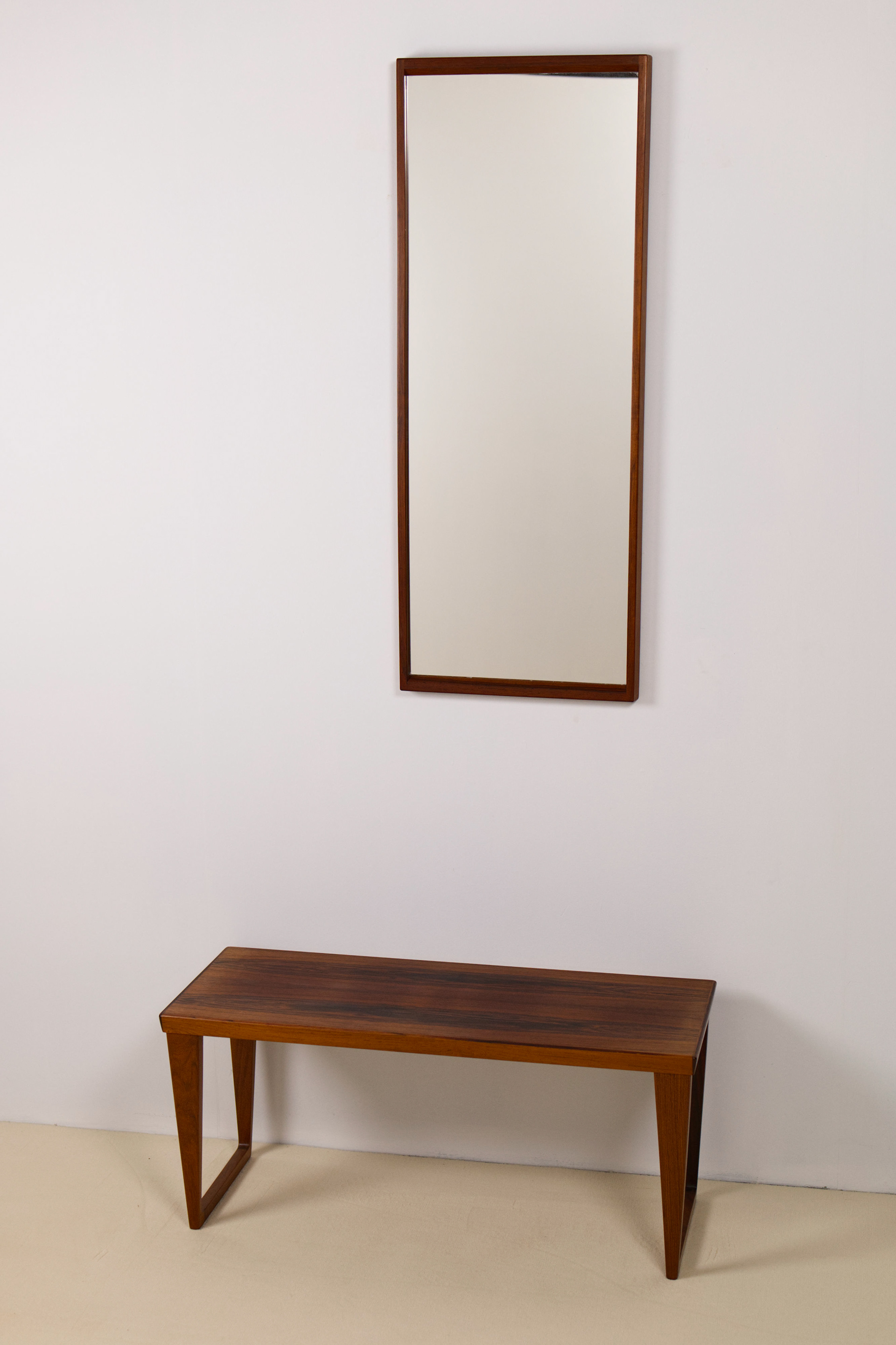 Kai Kristiansen rosewood hallway bench and mirror set for Aksel Kjersgaard, Denmark, 1960s. An elegant hallway set in rosewood, designed by Kai Kristiansen for Aksel Kjersgaard in the 1960s. The set consists of a tall, rectangular mirror in a finely crafted rosewood frame with beautiful joint details on the sides. The matching bench with a strikingly grained rosewood top is supported by angular legs with open sides, giving it a light, architectural presence. Both pieces highlight the refined joinery and clean lines typical of Kristiansen’s designs, combining functionality with a restrained modern aesthetic. The set is in good vintage condition and shows signs of wear consistent with its age. Some uneven discolouring on the top from UV light.