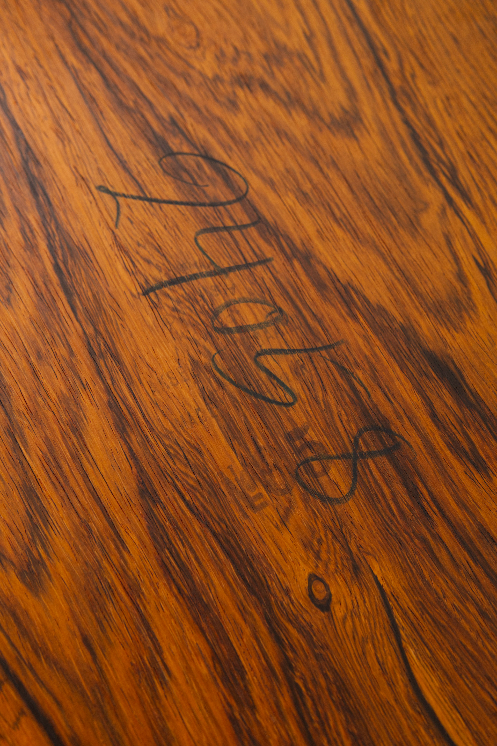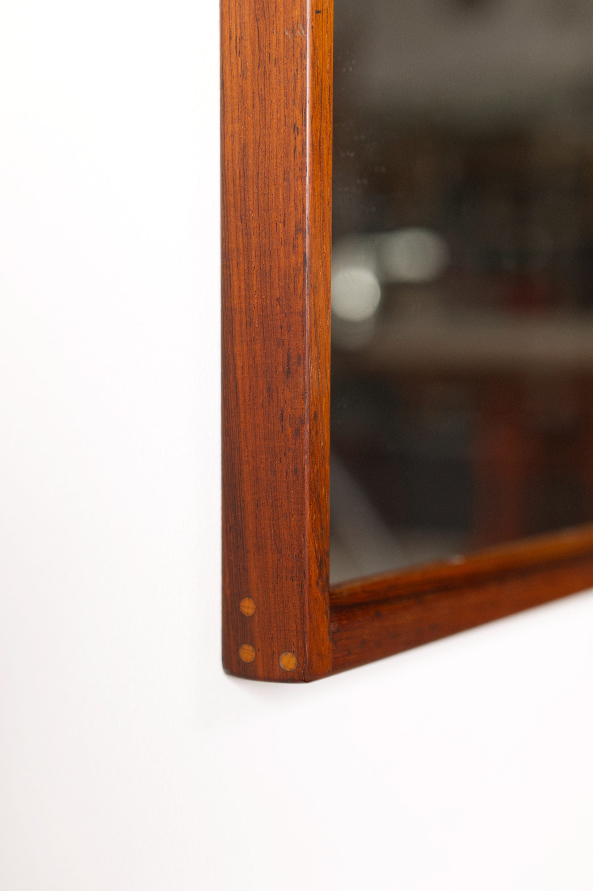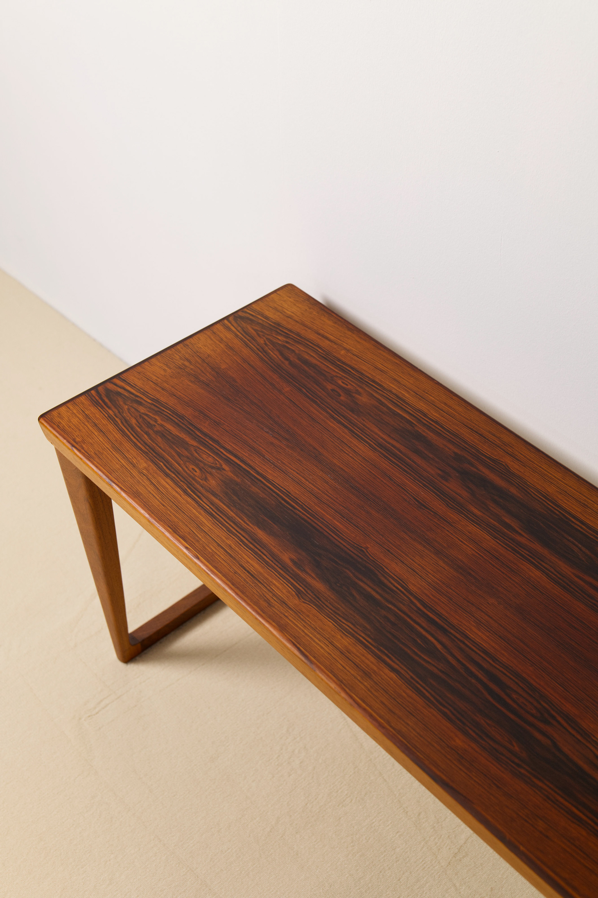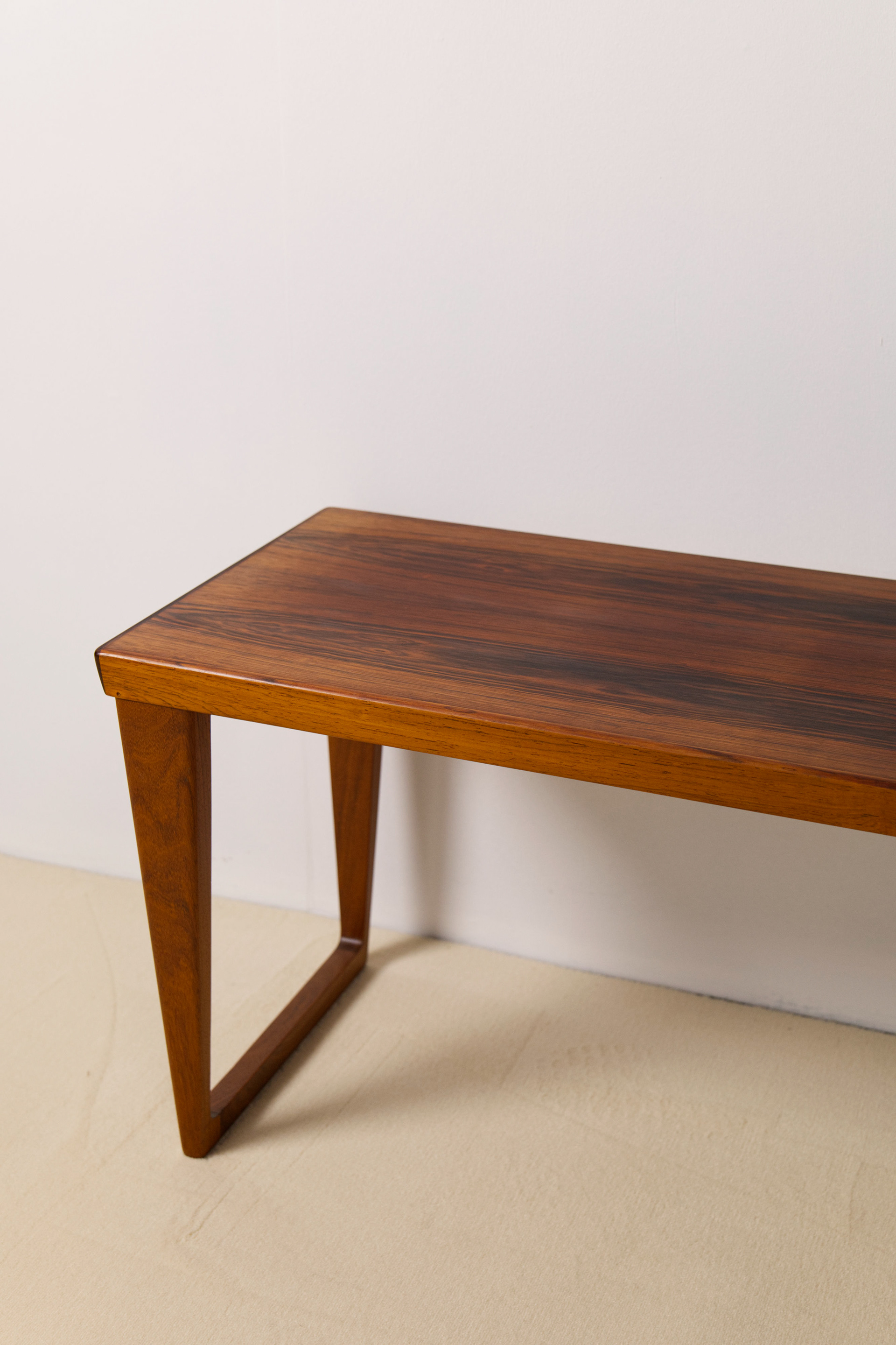 Kai Kristiansen rosewood hallway bench and mirror set for Aksel Kjersgaard, Denmark, 1960s. An elegant hallway set in rosewood, designed by Kai Kristiansen for Aksel Kjersgaard in the 1960s. The set consists of a tall, rectangular mirror in a finely crafted rosewood frame with beautiful joint details on the sides. The matching bench with a strikingly grained rosewood top is supported by angular legs with open sides, giving it a light, architectural presence. Both pieces highlight the refined joinery and clean lines typical of Kristiansen’s designs, combining functionality with a restrained modern aesthetic. The set is in good vintage condition and shows signs of wear consistent with its age. Some uneven discolouring on the top from UV light.