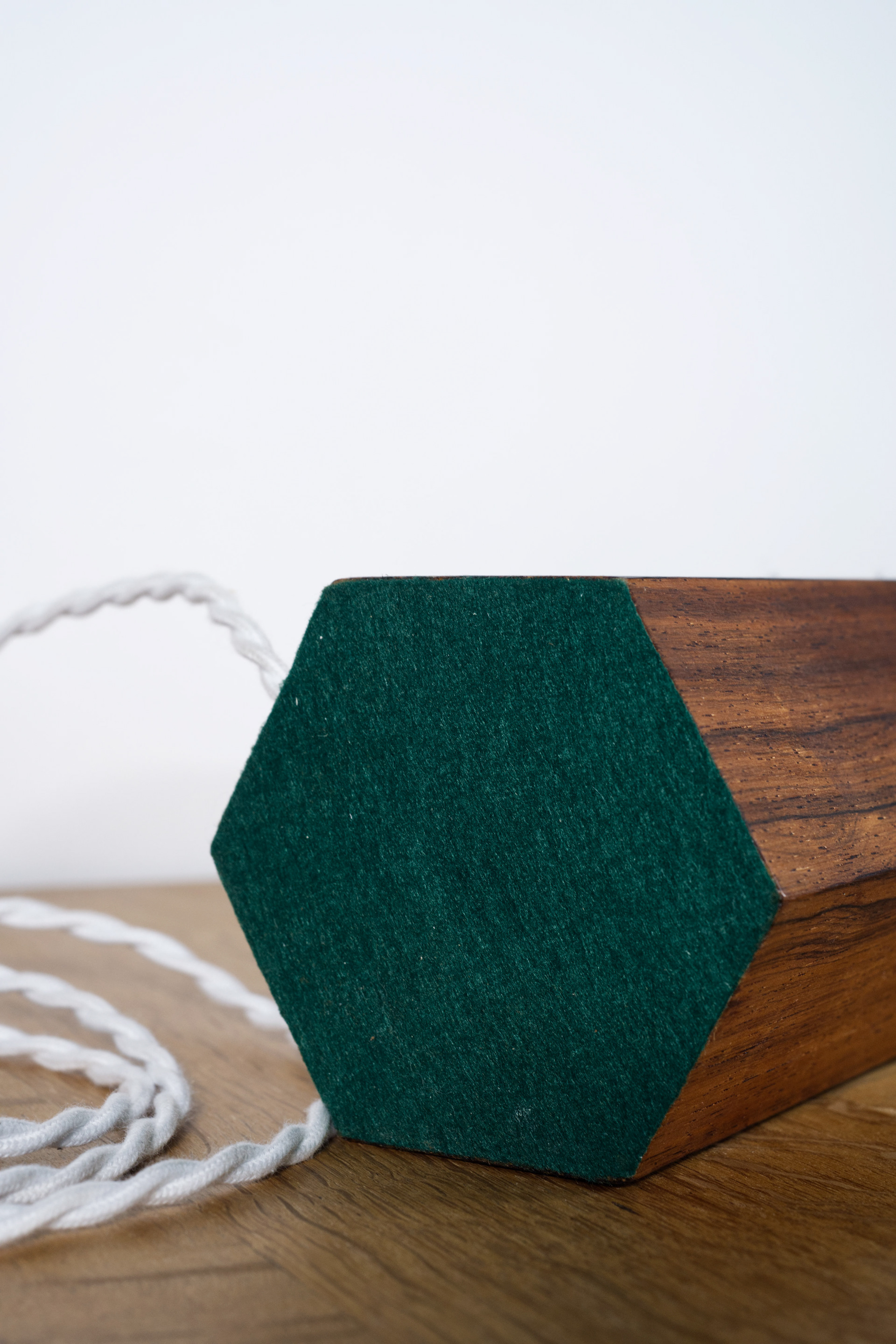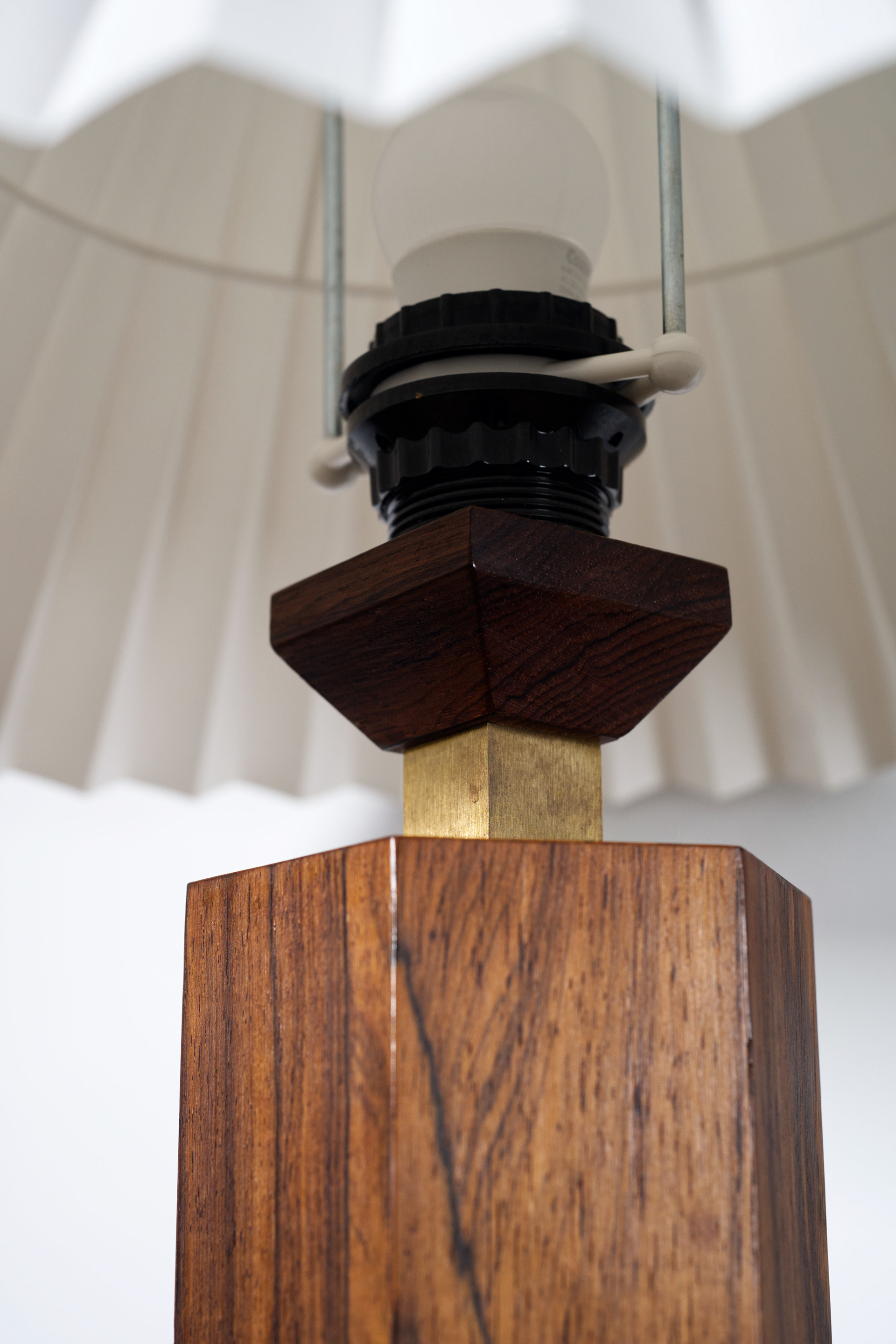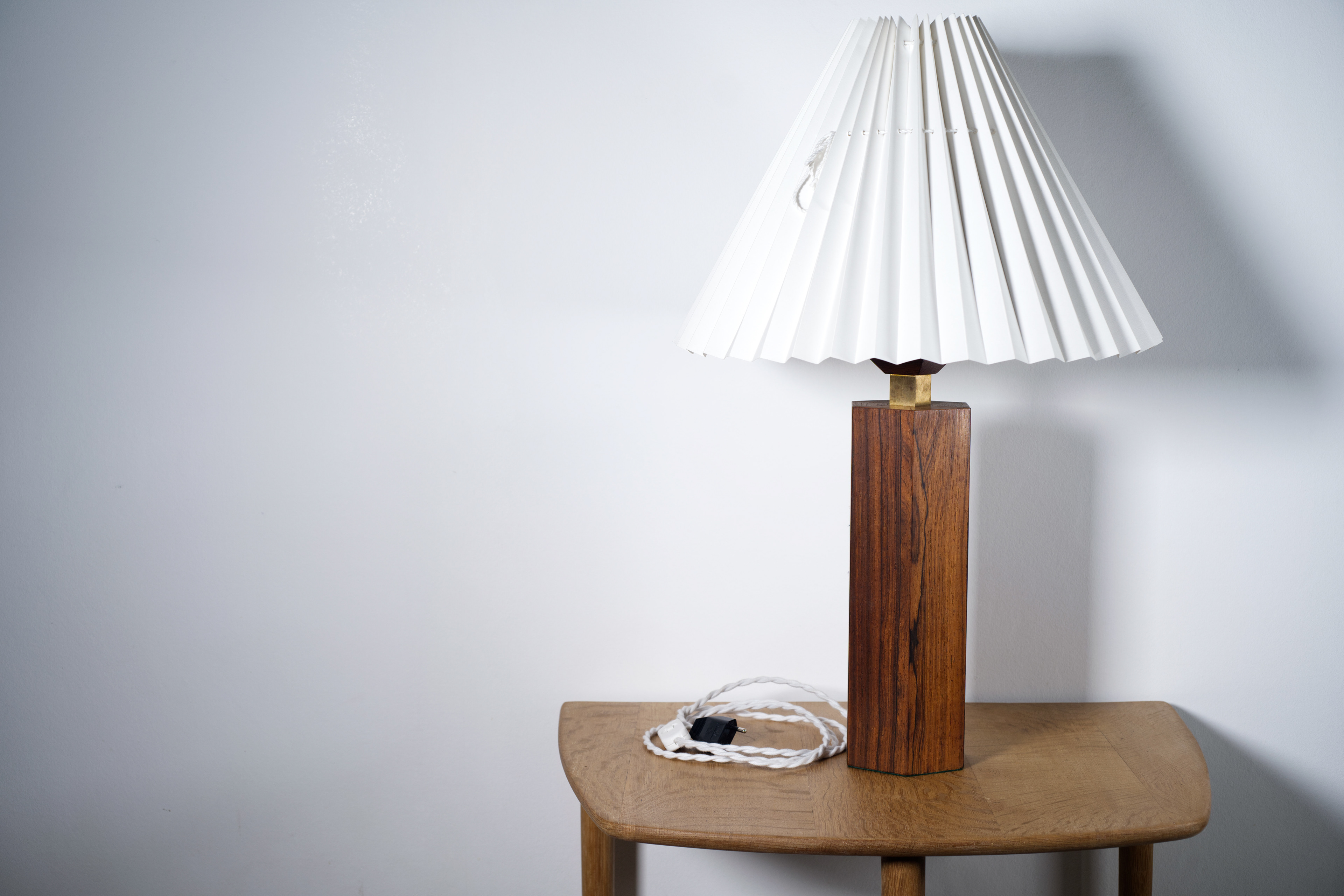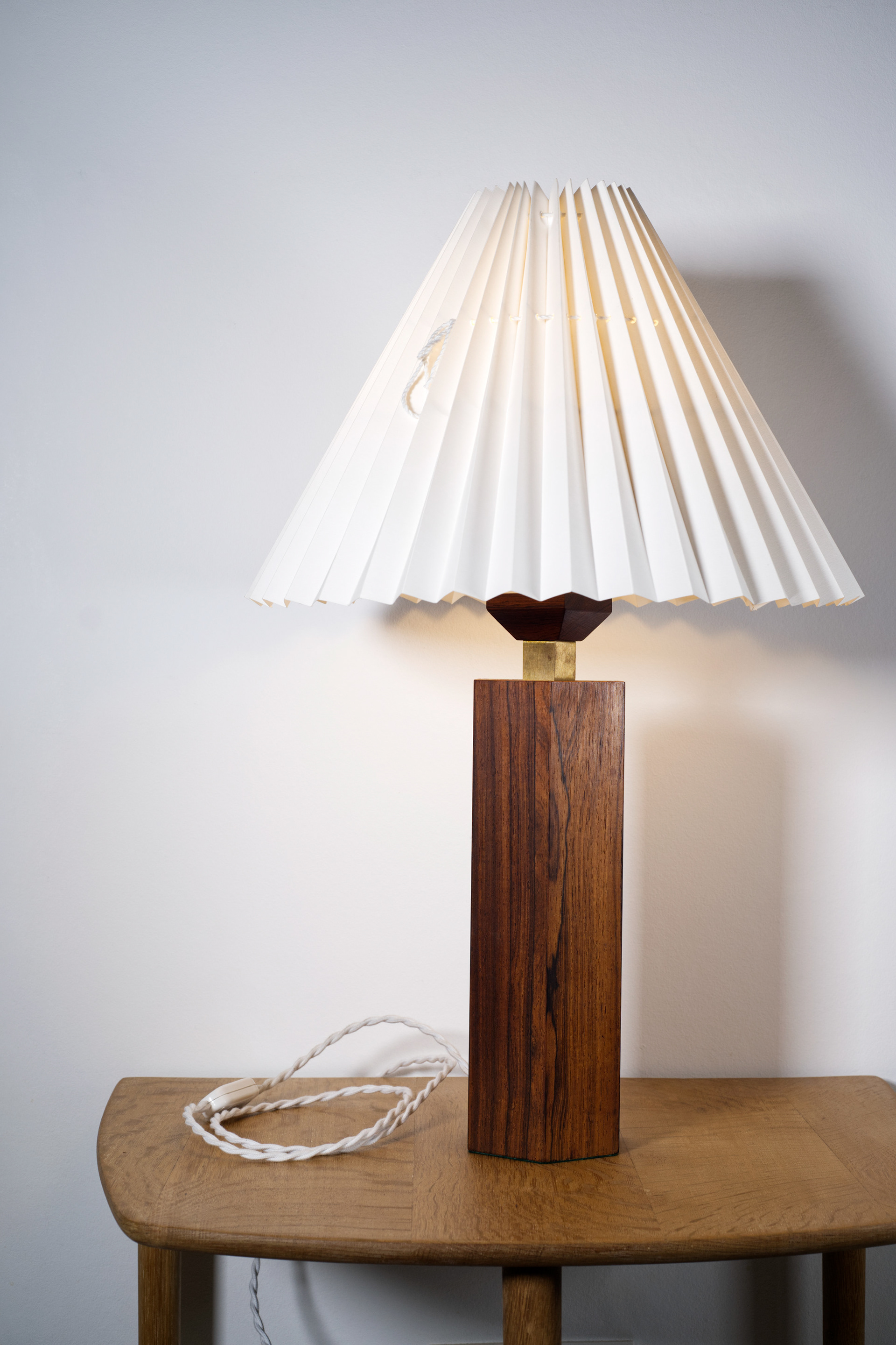 A vintage Danish rosewood table lamp with a hexagon shaped base and brass detail, from 1960's. Comes with a lamp shade holder and a beautiful pleated light shade. Lamp has been rewired with a high quality braided cotton wire and a period correct switch.