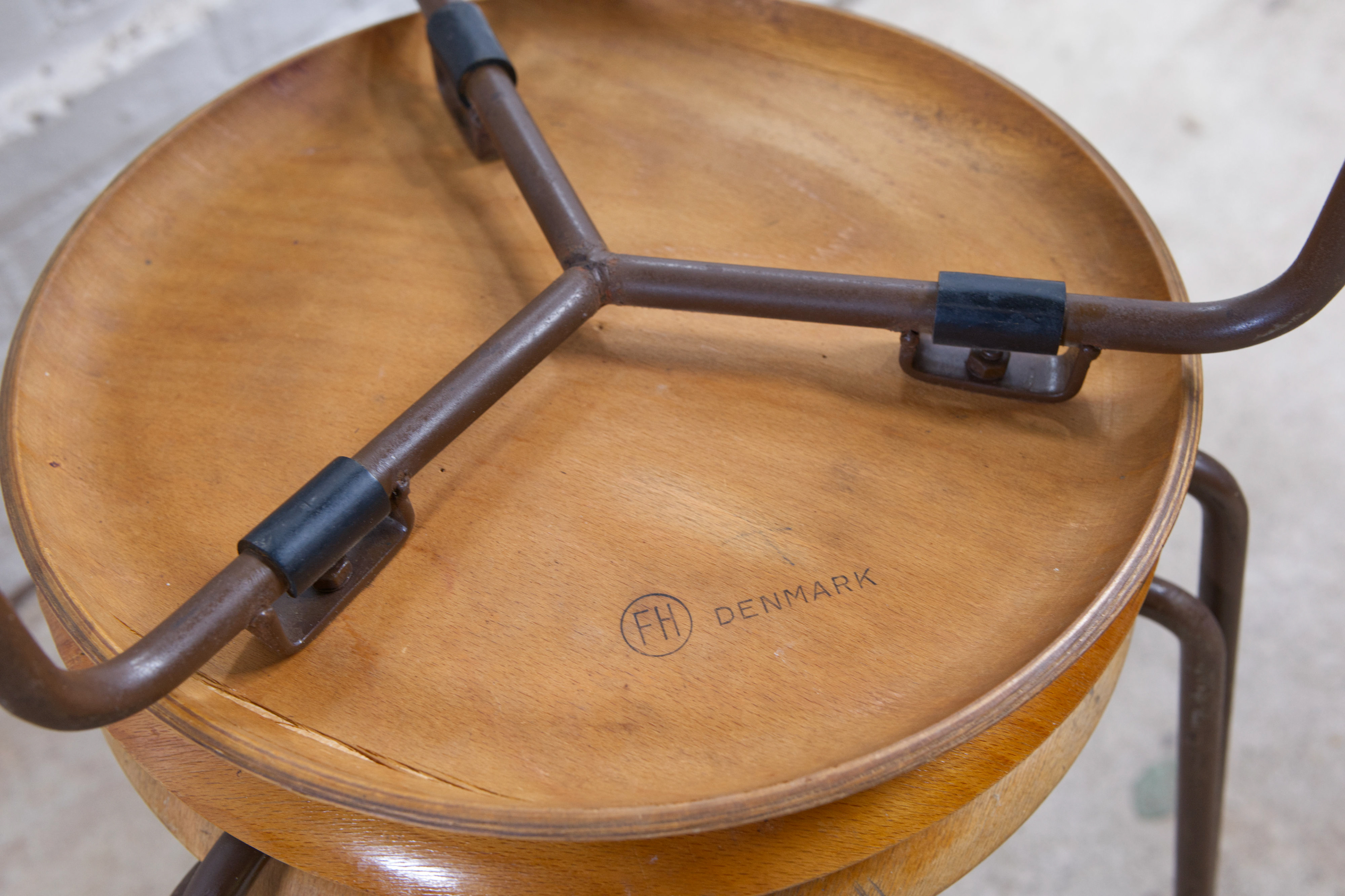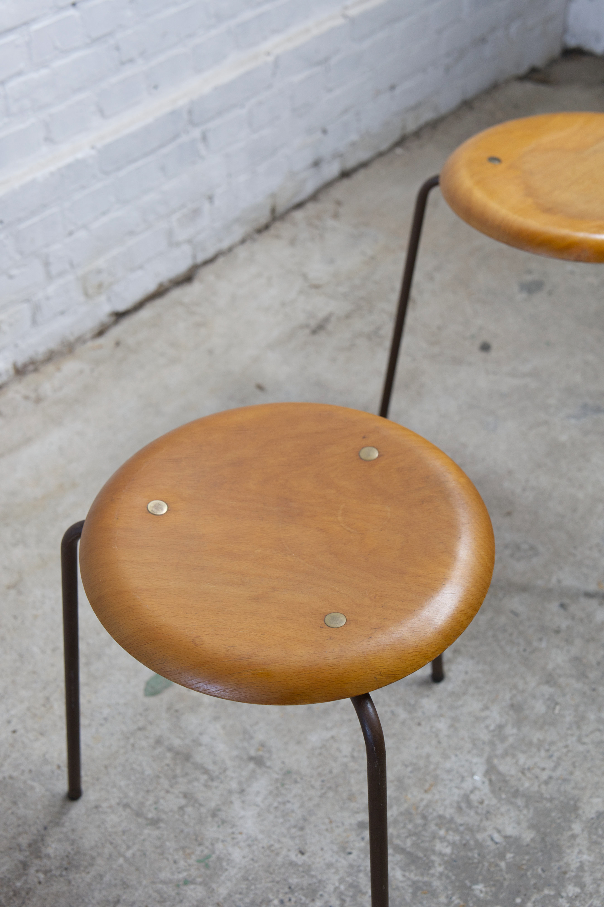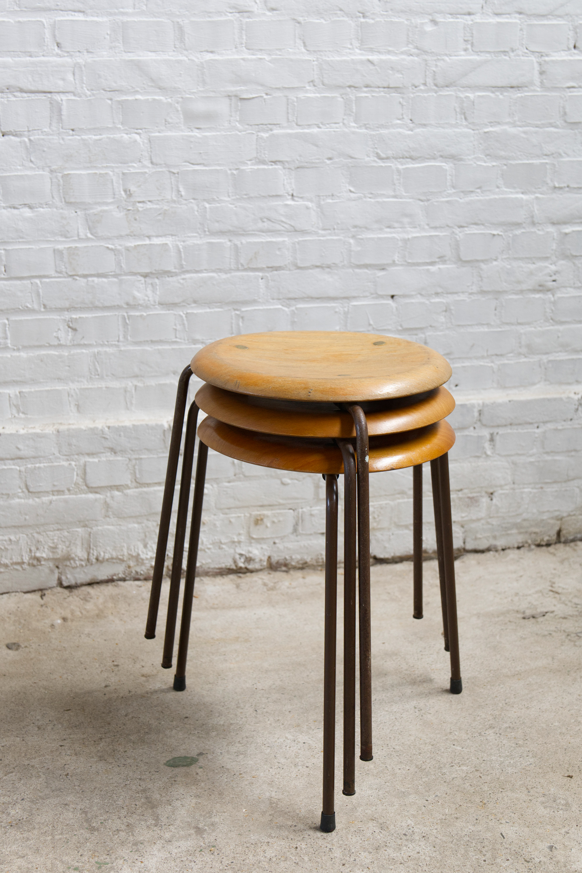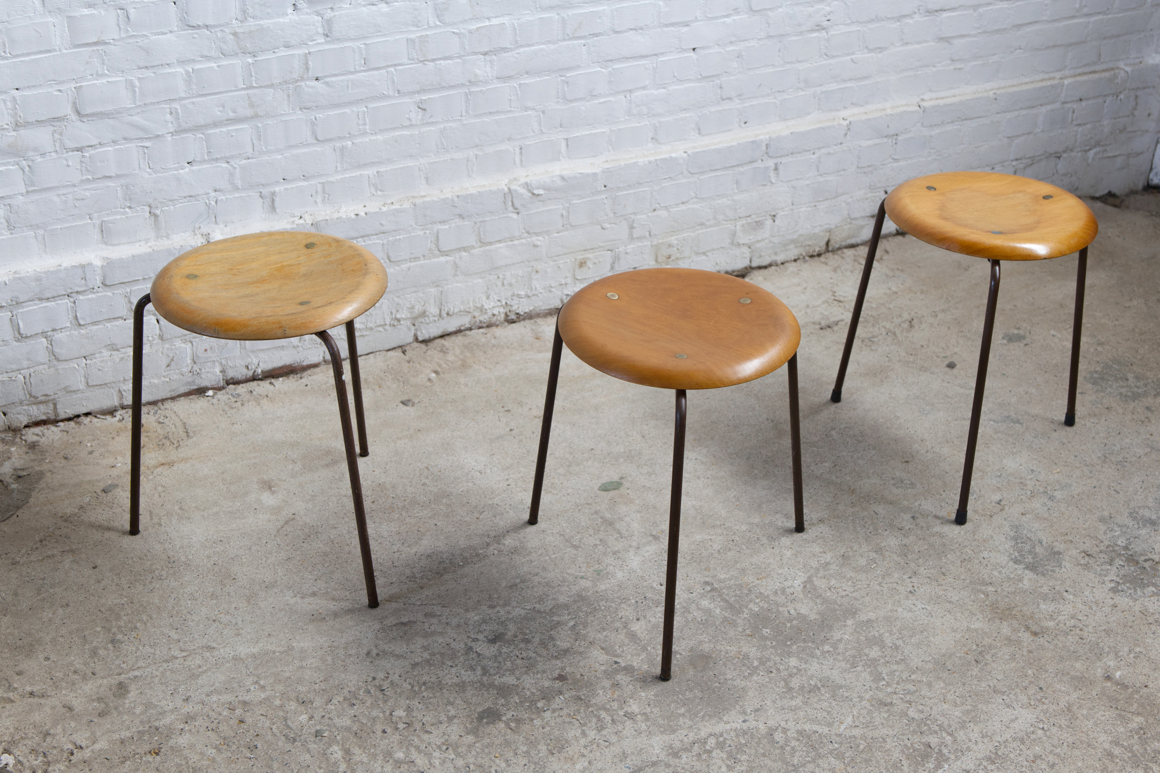 A original set of 3 early tripod Dot Stools by Fritz Hansen. In Teak molded plywood with it iconic copper dot rivets. All marked and in original condition. A classic design that is easily stacked and placed down to provide extra seating option in a living or dining room. Manufactured by Fritz Hansen in Denmark during the 1960s.