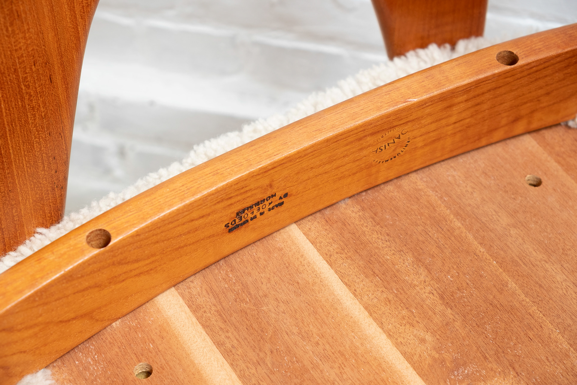 Solid teak Danish dining chairs called "Morten", designed by Niels Koefoed for Koefoeds Hornslet. The chairs date from the 1960s. Good vintage condition with light traces of wear in the form of light scratches from regular use. The quality is stunning, completely in solid teak and newly upholstered high quality natural sheerling. Beautiful sculptural design classics from Denmark.