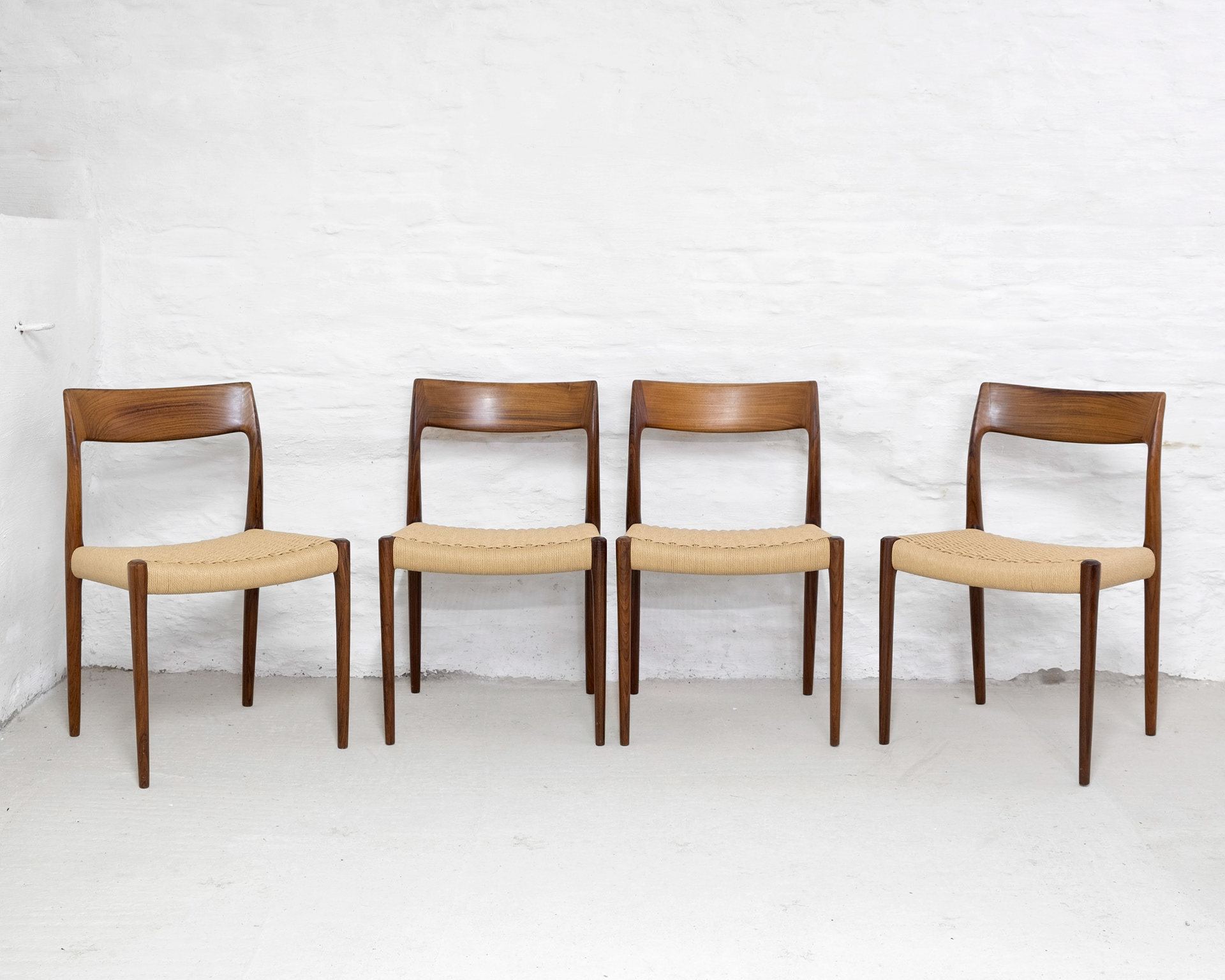 Set of 4 dining chairs in rosewood by Niels Otto Møller, model 77 produced by J.L. Møller Møbelfabrik in the 1960s. Beautiful wood grain. The seats have new Danish papercord. The wood shows light traces of use consistent with age. Labeled with medallions from the manufacturer.