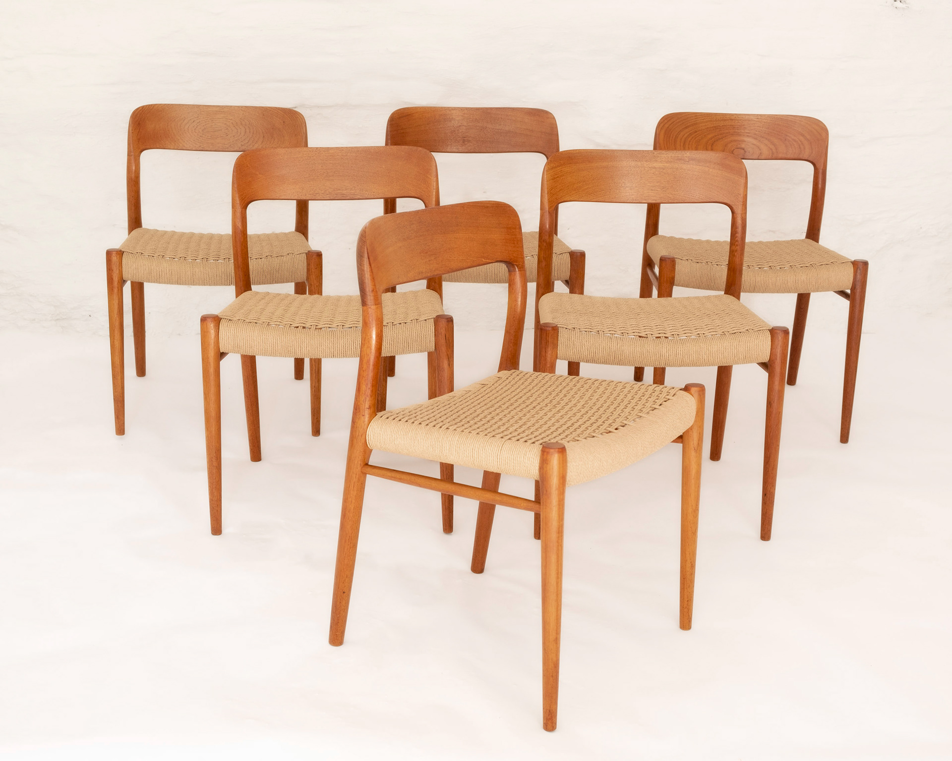 Een prachtige set van 6 eetkamerstoelen van Niels Møller, Model 75 in teak. De stoelen zijn een gekende Deense klassieker van ontwerper en meubelmaker Niels Otto Møller. Prachtige houtnerf. De stoelen zijn in zeer goede staat, voorzien van nieuw papierkoord zodat ze nog vele jaren meekunnen. Eén stoel is professioneel hersteld aan de rugleun, een fijne breuklijn is nog zichtbaar maar de stoel is stevig en volledig functioneel (zie laatste foto). De prijs voor deze set is hierdoor lager dan gewoonlijk.
