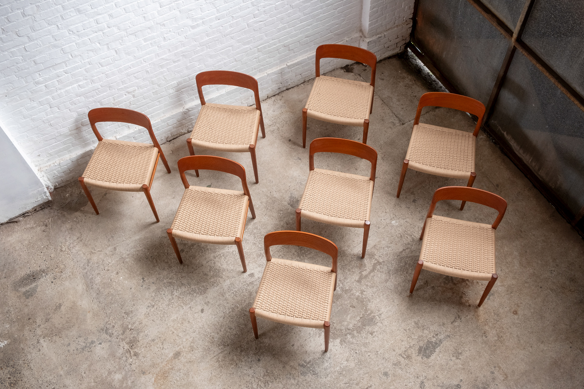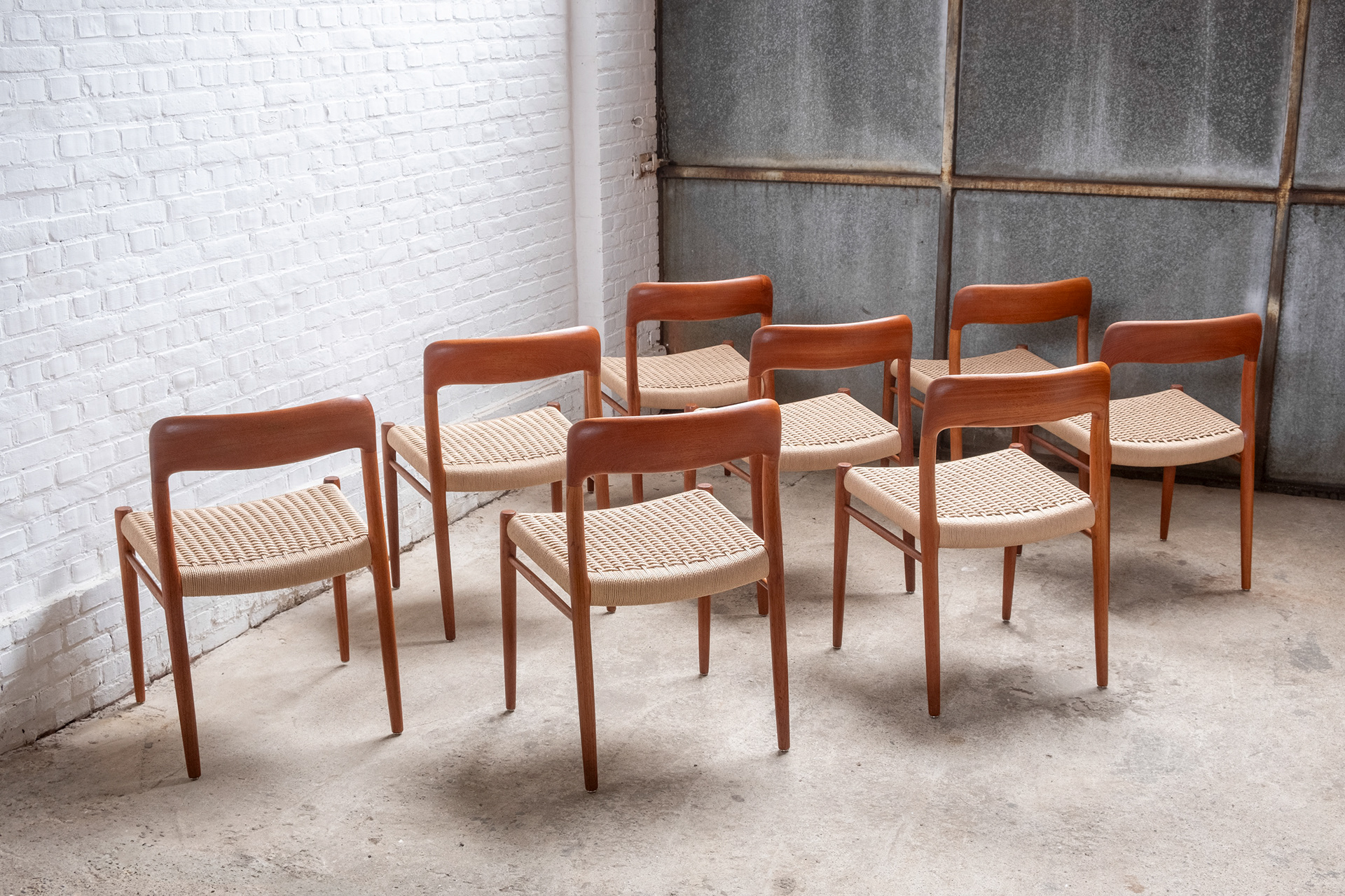 Wonderful set of 8 dining chairs in teak , Model 75 by Niels Møller. Produced in the 1960s in Denmark at J.L. Møller's Møbelfabrik. Probably the most successful and appreciated designs by Niels Otto Møller. All chairs are stamped by JL Møller's Møbelfabrik and Danish Control. The set has been professionally restored, all joints inspected, reglued, one joint has an invisible repair, treated with new coats of Danish oil, some light traces of use can still be found but this is very minimal. All seats have been rewoven with new natural paper cord.