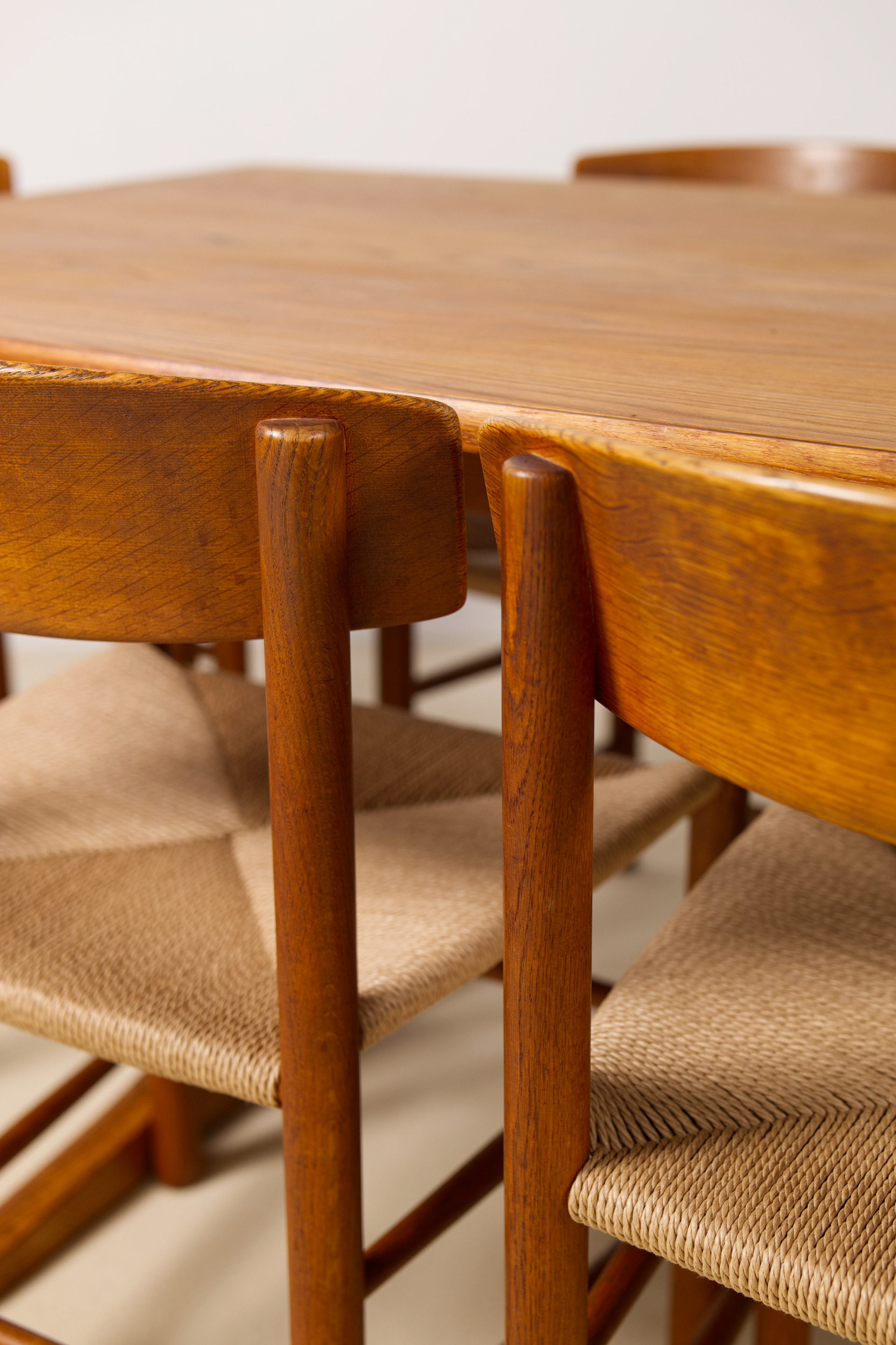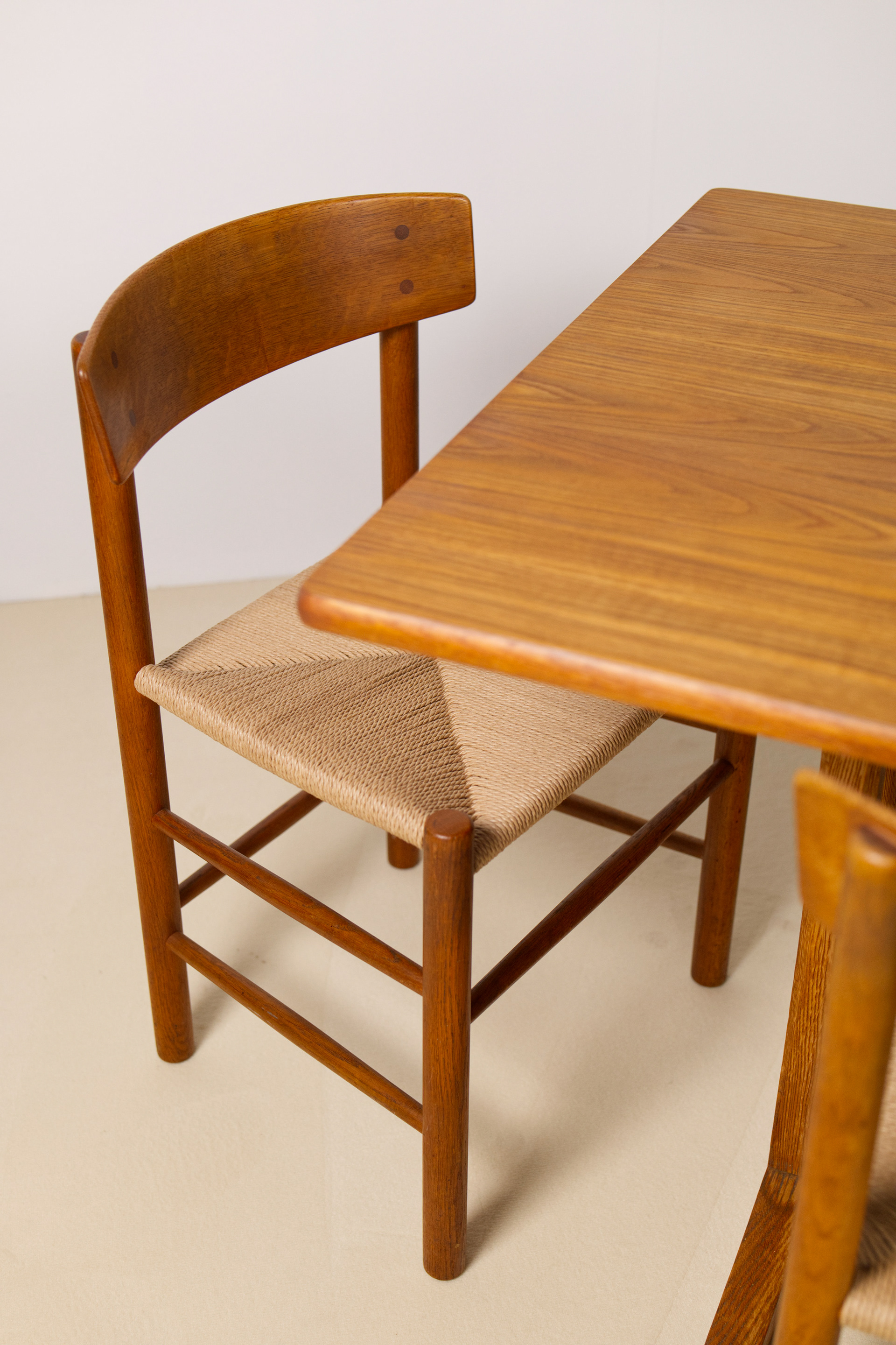 This early production set from 1964 is crafted in solid oak and papercord seats, showcasing a beautifully aged dark patina that highlights the natural grain and warmth of the wood. The iconic J39, also known as the “People’s Chair,” exemplifies Mogensen’s dedication to functional craftsmanship and honest materials—combining Shaker-inspired simplicity with timeless Danish modern design.